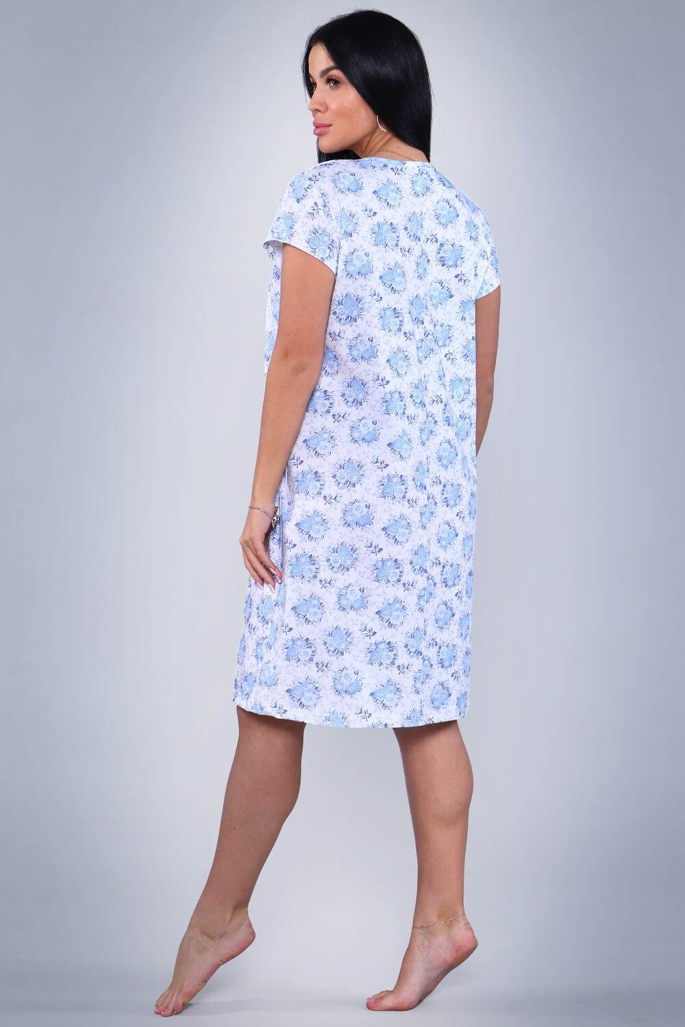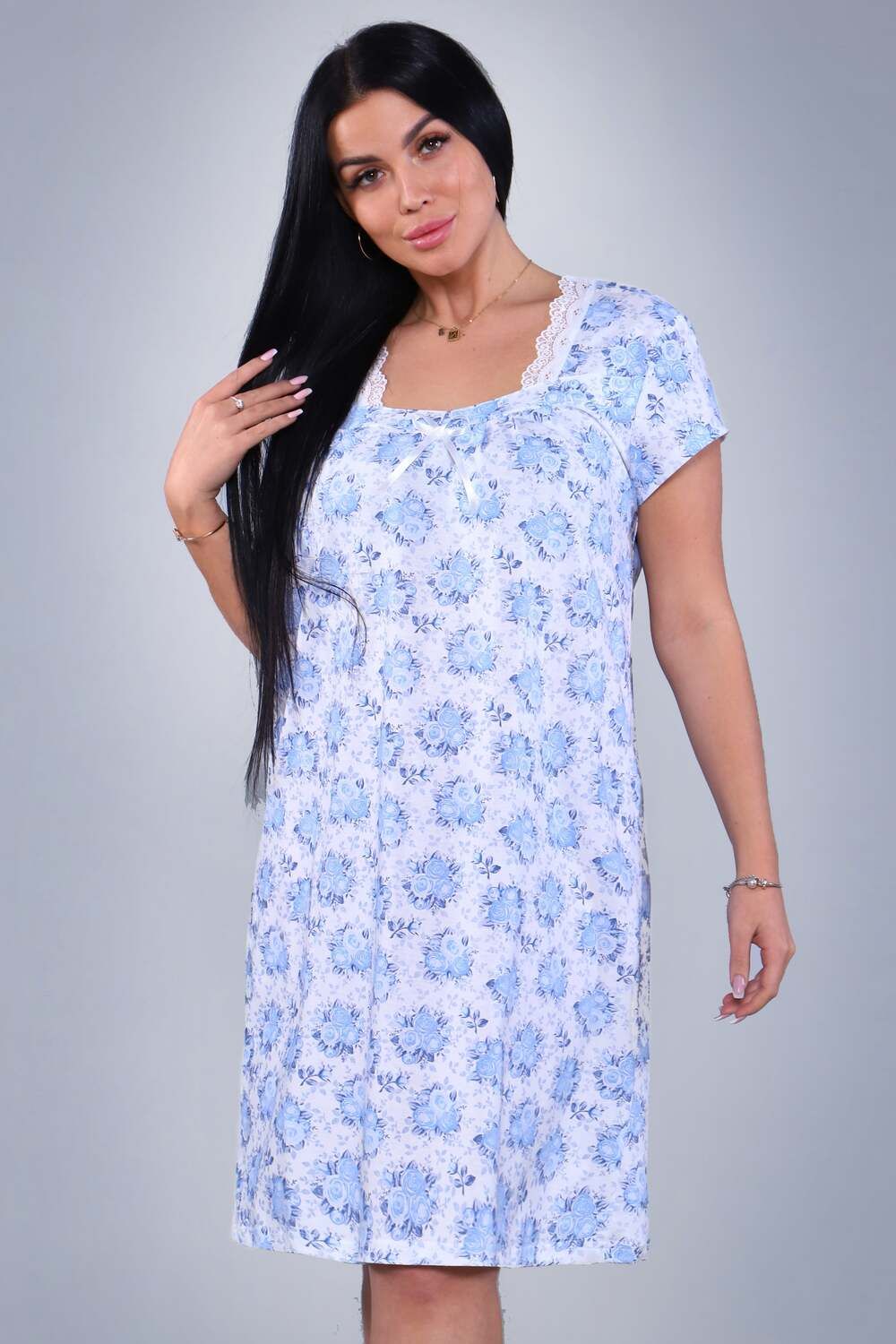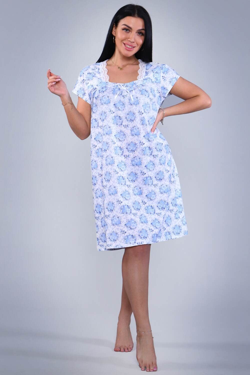 Сорочка женская из кулирки. Силуэт прямой, длина чуть ниже колен, вырез горловины фигурный, рукав короткий, отделка кружево по горловине.