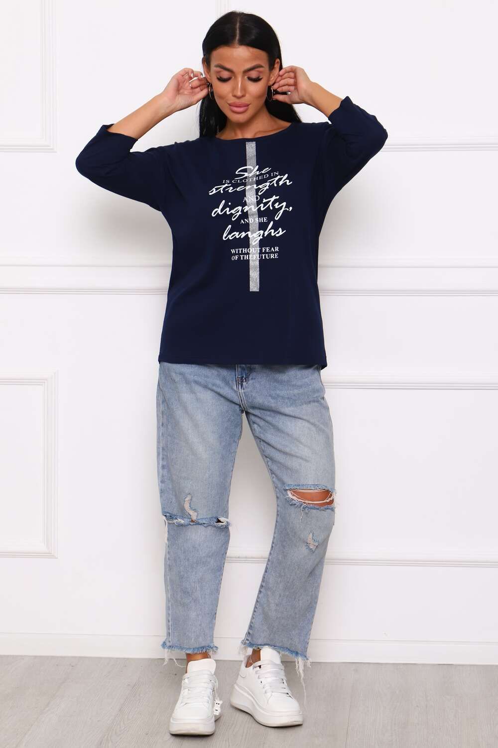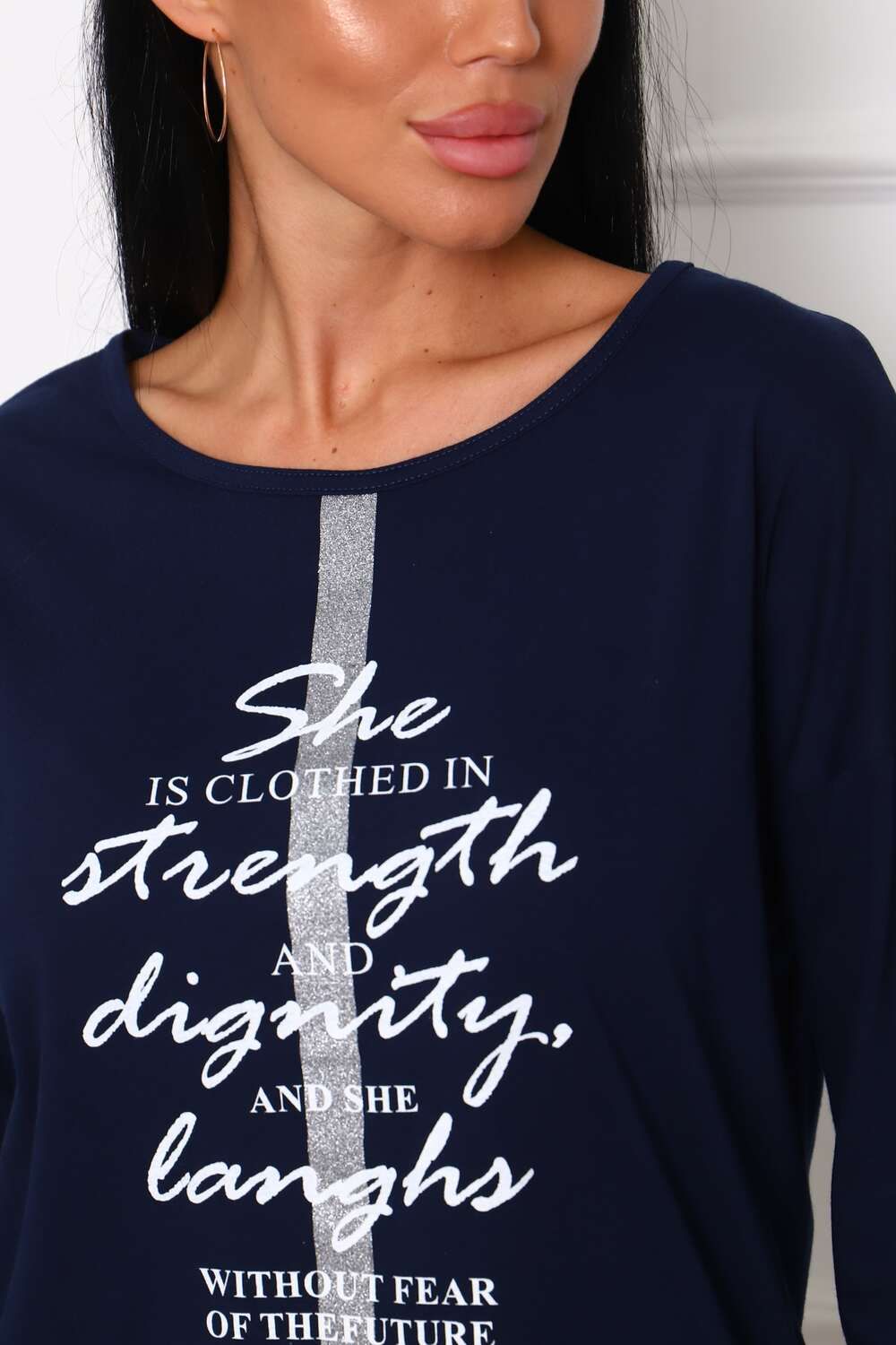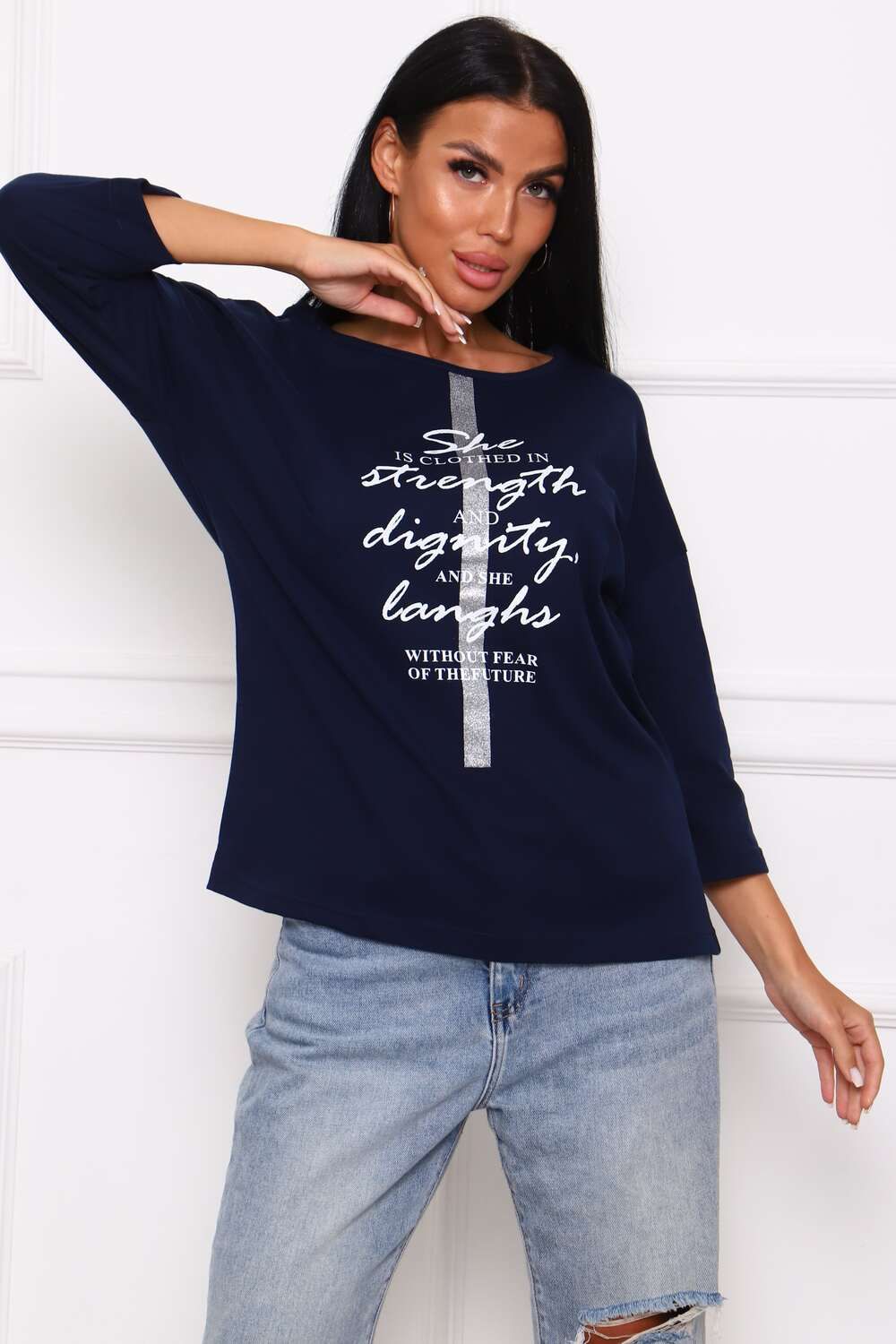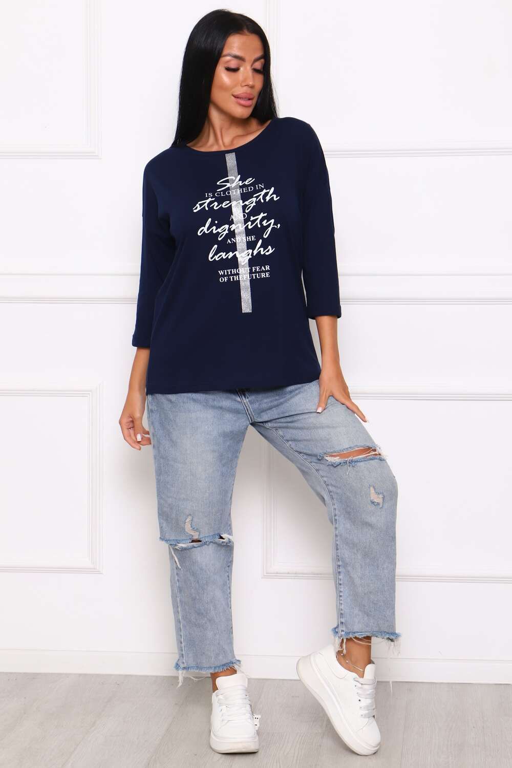Туника женская. Ткань кулирка, хлопок 100%. Крой свободный, горловина круглой формы, обработана окантовкой. Линия плеч спущена. Длинна рукава 3/4, со швом по локтю. Низ изделия прямой. На полочке принт, шелкография.