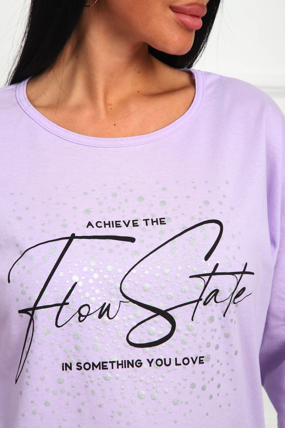 Туника женская. Ткань кулирка, хлопок 100%. Крой свободный. горловина круглой формы, обработана окантовкой. Линия плеч спущена. Длинна рукава 3/4, со швом по локтю. Низ изделия прямой. На полочке принт, шелкография.