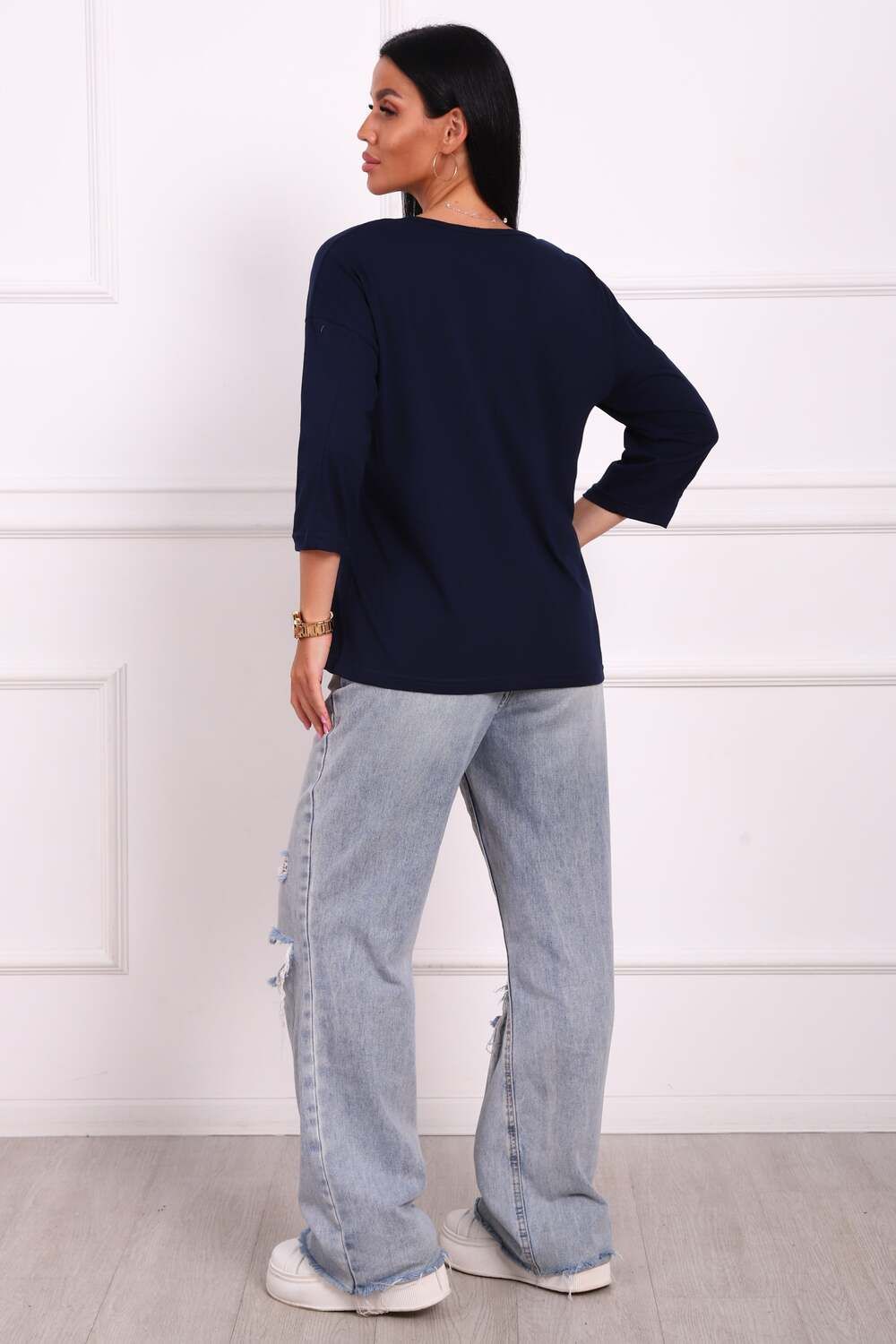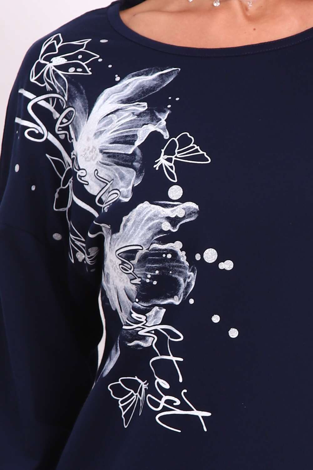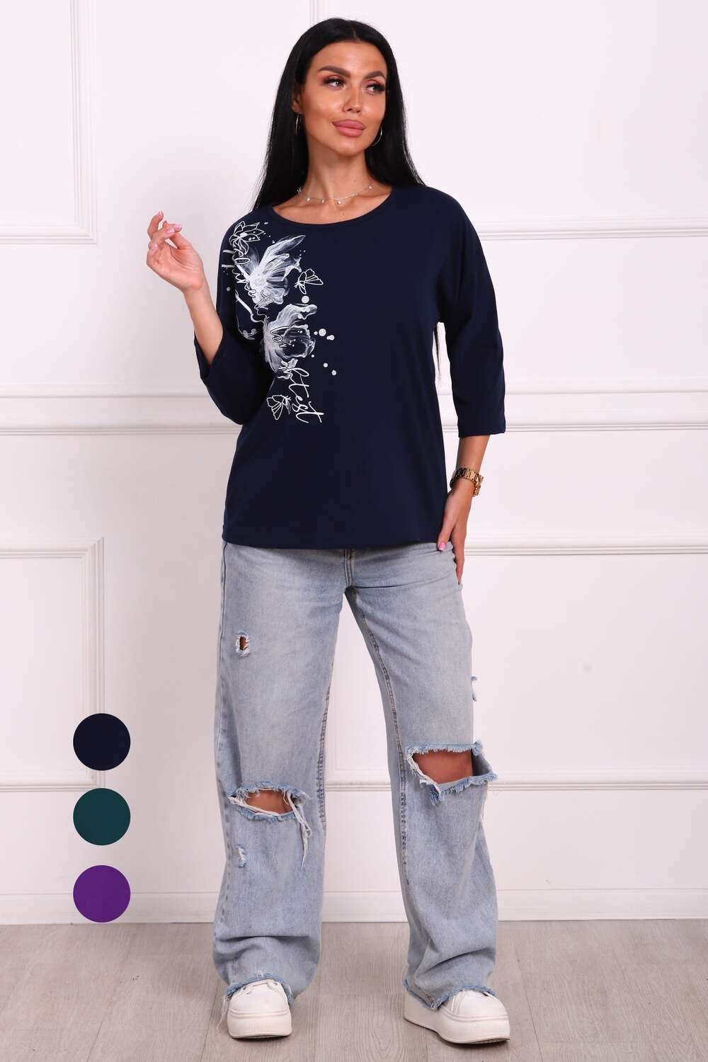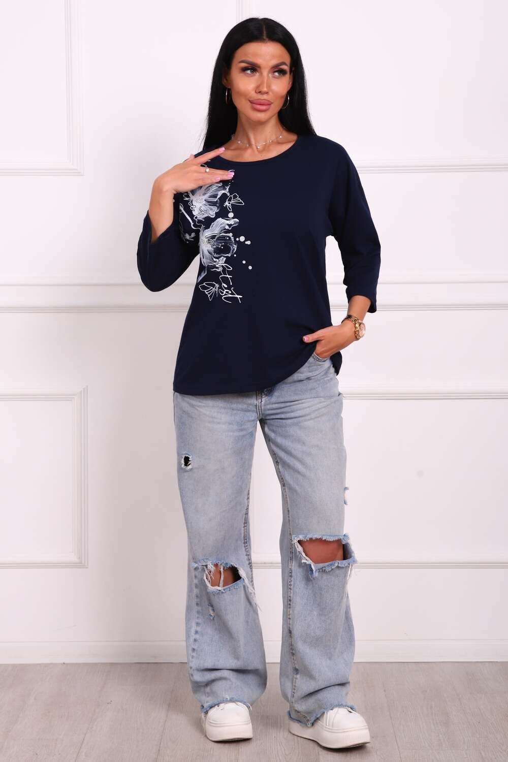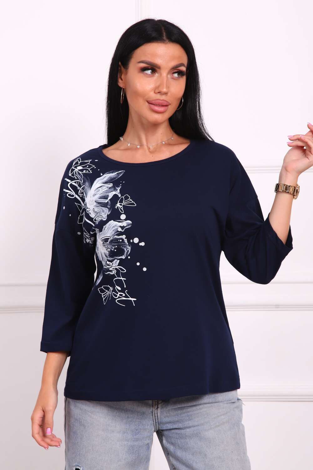 Туника женская. Ткань кулирка, хлопок 100%. Крой свободный, горловина круглой формы, обработана окантовкой. Линия плеч спущена. Длинна рукава 3/4, со швом по локтю. Низ изделия прямой. На полочке принт, шелкография.