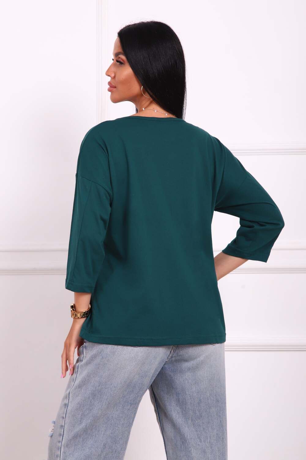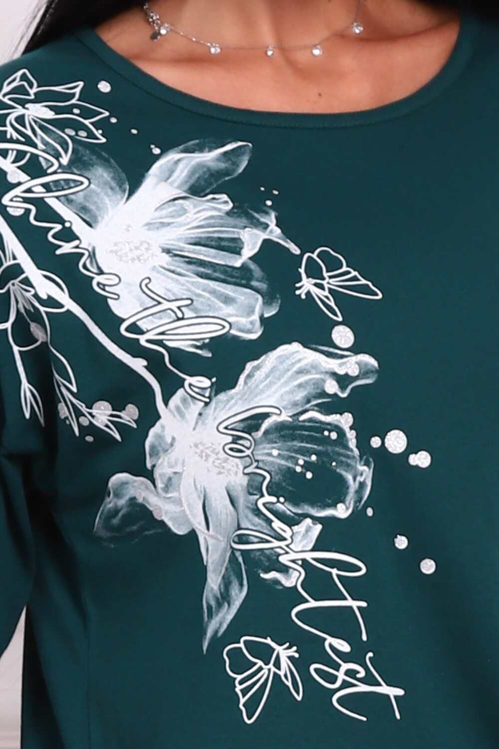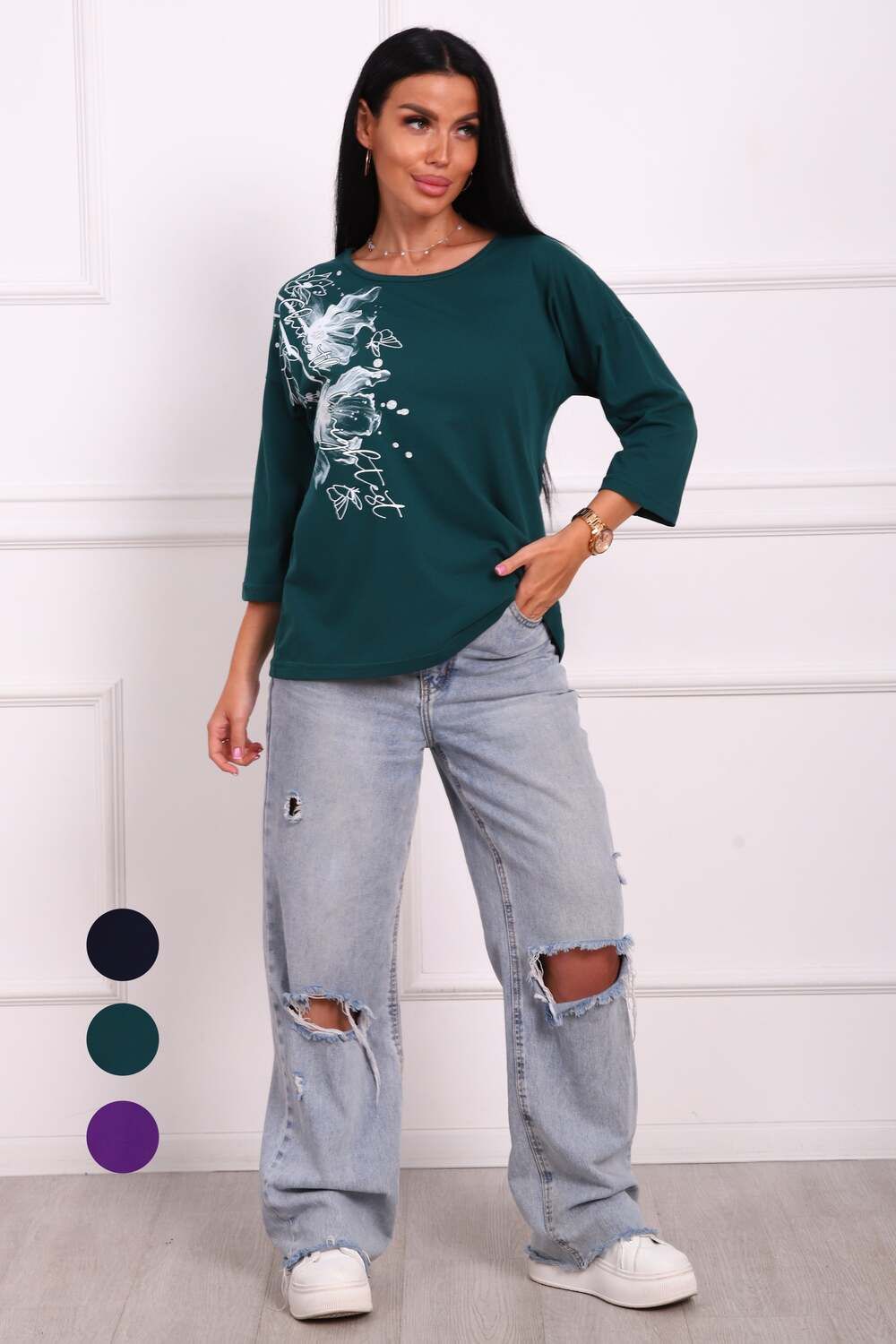 Туника женская. Ткань кулирка, хлопок 100%. Крой свободный, горловина круглой формы, обработана окантовкой. Линия плеч спущена. Длинна рукава 3/4, со швом по локтю. Низ изделия прямой. На полочке принт, шелкография.