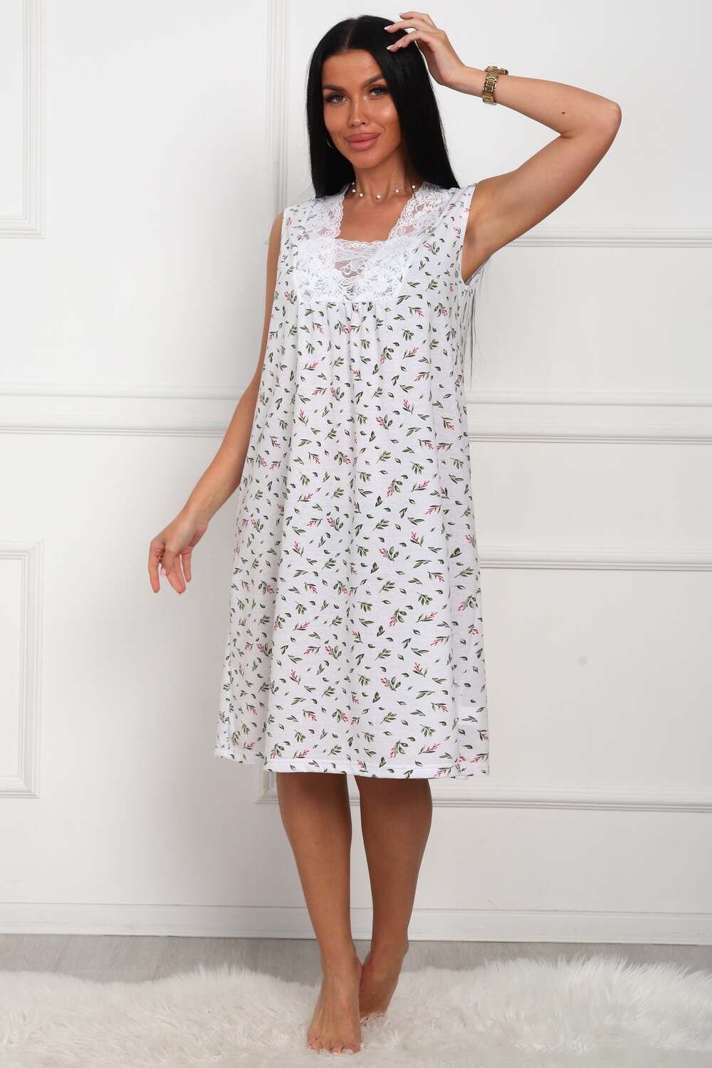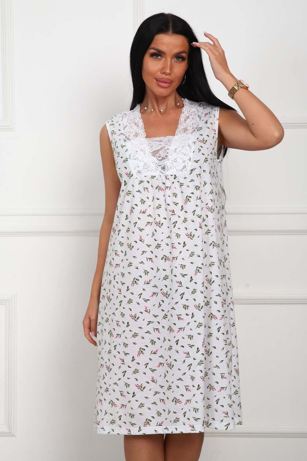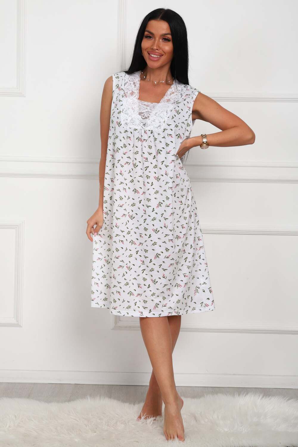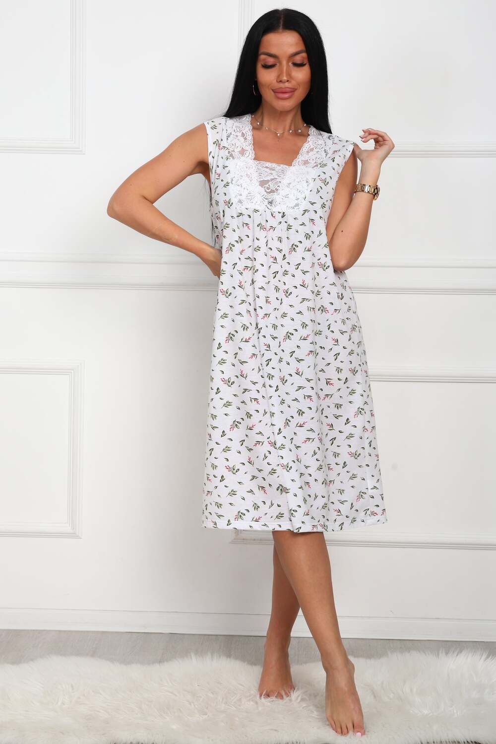 Сорочка женская из натурального набивного полотна. Хлопок 100%. Силуэт прямой. Длинна чуть ниже колена. Горловина фигурной формы, отделана кружевом. По линии груди легкая сборка. По спинке рельефы. Без рукава. Пройма и горловина спинки обработаны окантовкой. Низ изделия прямой.