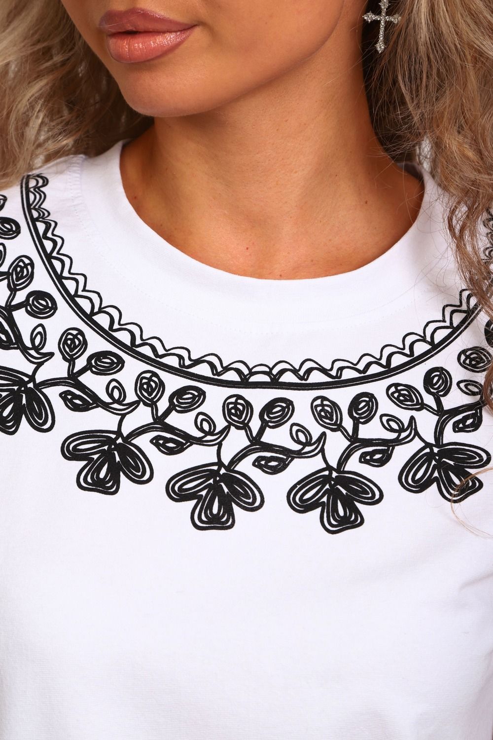 Футболка женская прямого силуэта. Низ изделия прямой. Длинна до середины бедра, плечо на естественном месте, рукав короткий. Горловина круглой формы, обработана планкой . Принт (шелкография пуф) в виде кружевного воротника.