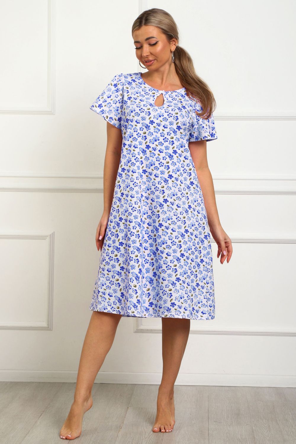 Сорочка женская из натурального набивного трикотажа, хлопок 100%. Силуэт свободный, расширенный к низу. Горловина круглой формы с капелькой по центру. Обработана окантовкой. Отделкой служит бантик. Рукав короткий, свободный. В верхней части оката выполнена небольшая сборка. Низ изделия прямой. Длина ниже колена.