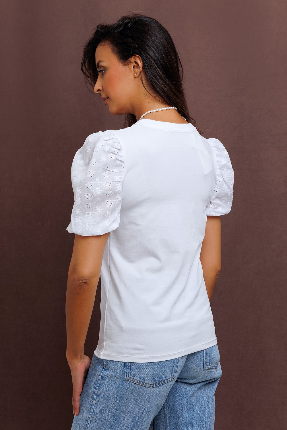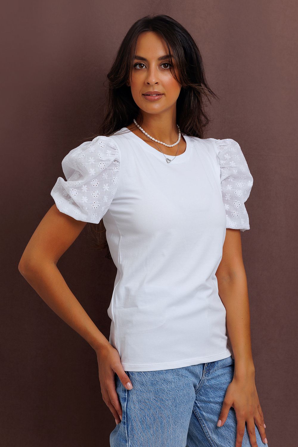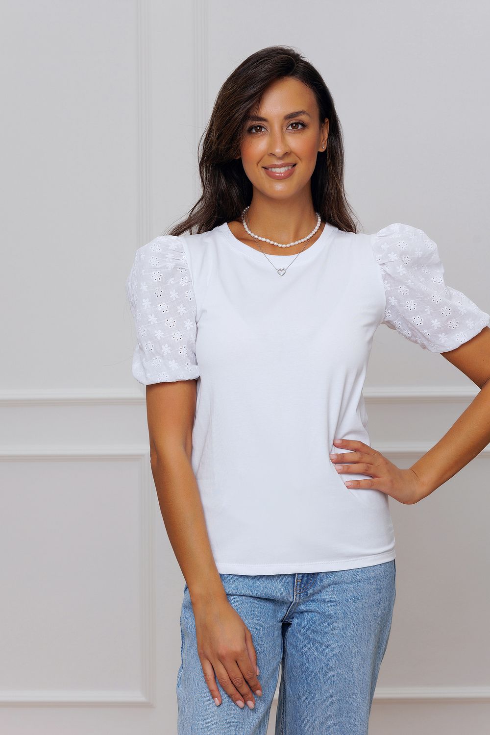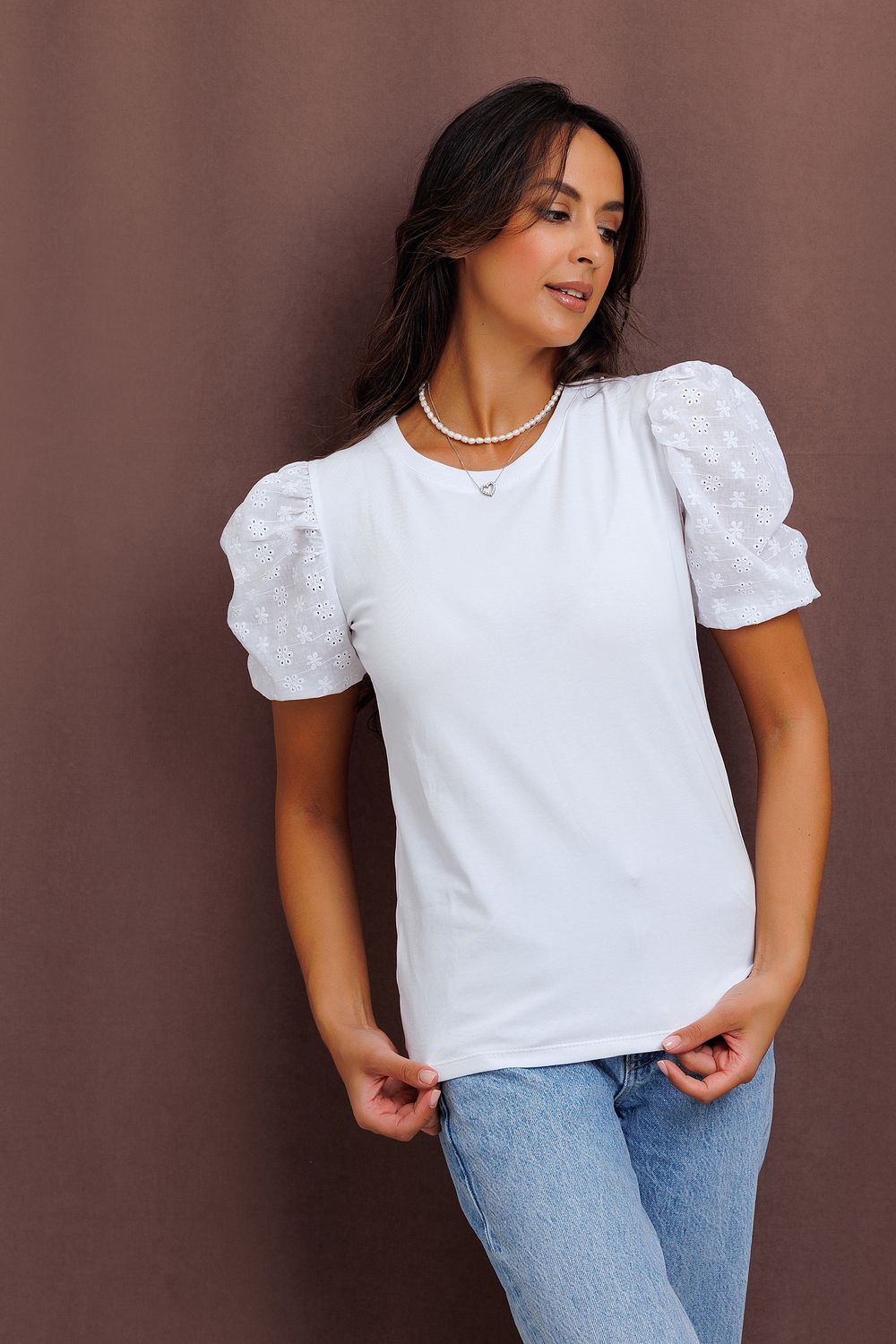 Женская футболка премиум качества из мягкого трикотажа свободного силуэта. Горловина округлая. Изюминкой эту модель делают объемные и рукава из перкали с шитьем, создавая кружевной эффект. Такая модель - отличная база для создания брендовых луков в стиле casual. Приобретите легкость, комфорт и свободу на каждый день, ведь эта вещь полюбится Вами с первого прикосновения. Рекомендуем сочетать с брюками и джинсами пастельной цветовой гаммы. Все товары бренда Raposa производятся в России (Иваново), используются только ткани премиального качества. Ограниченная коллекция только для этой весны!