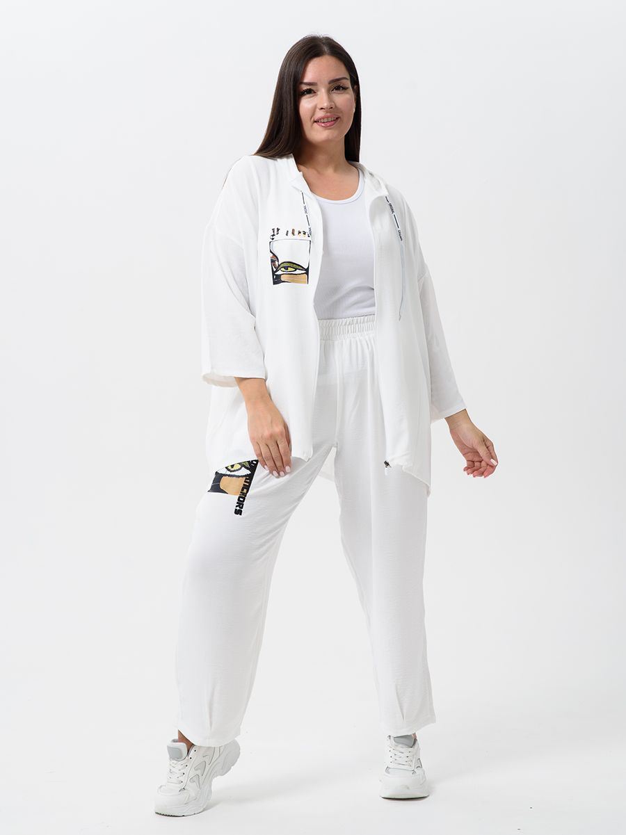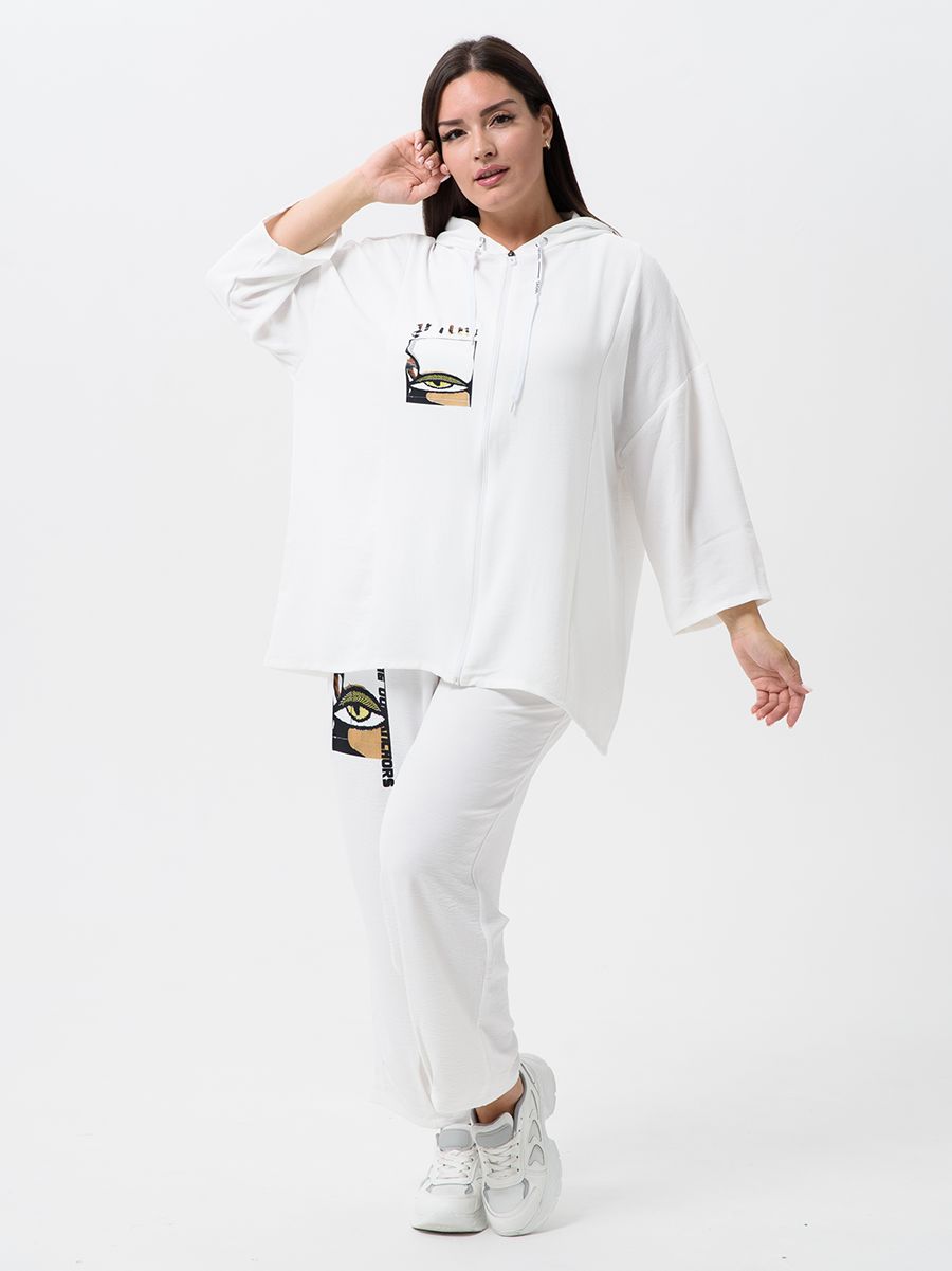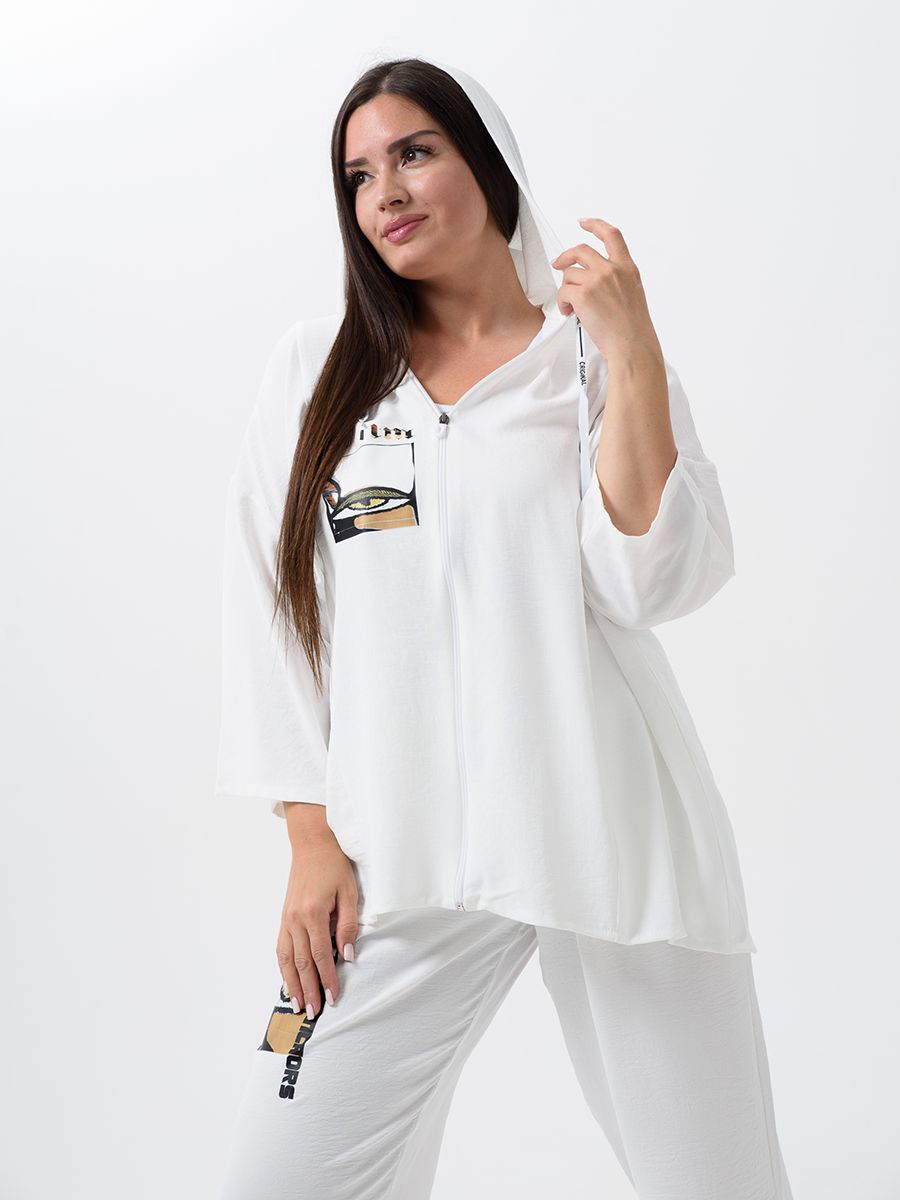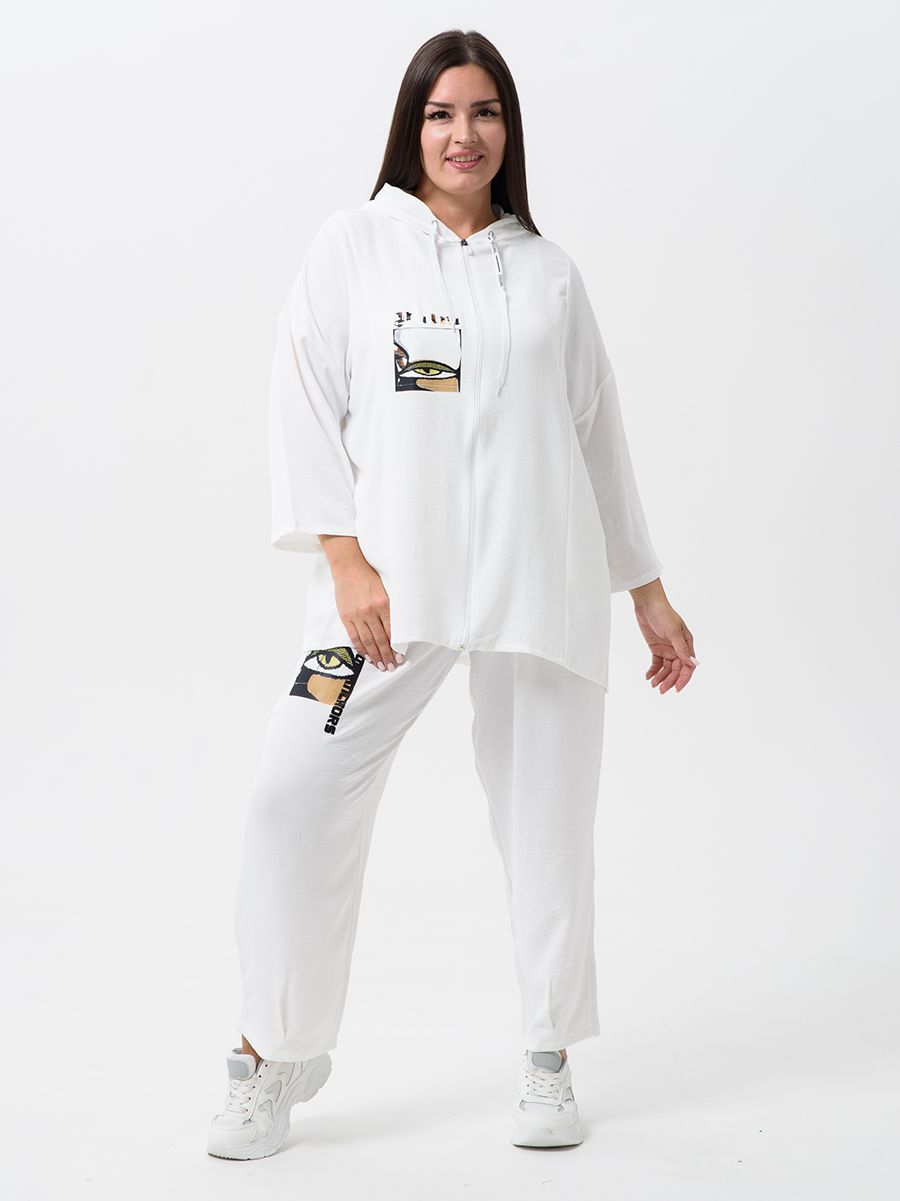 Женский стильный костюм из легкой ткани - сингапур - самое то для жаркого лета. Вверх изделия - удлинненый оверсайз кофточка на молнии с капюшоном, рукава спущенные - длина до запястья (длина рукава указана от горловины). Низ - свободные брюки с карманами, пояс на резинке, снизу имеется защипка, которая слегка заужает штаны. Костюм декорирован принтом. Свободный и стильный, не сковывает движения. Двойка на каждый день в приятных расцветках - хорошая находка для вашего гардероба!