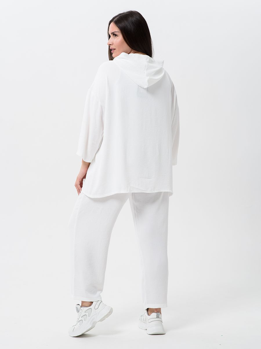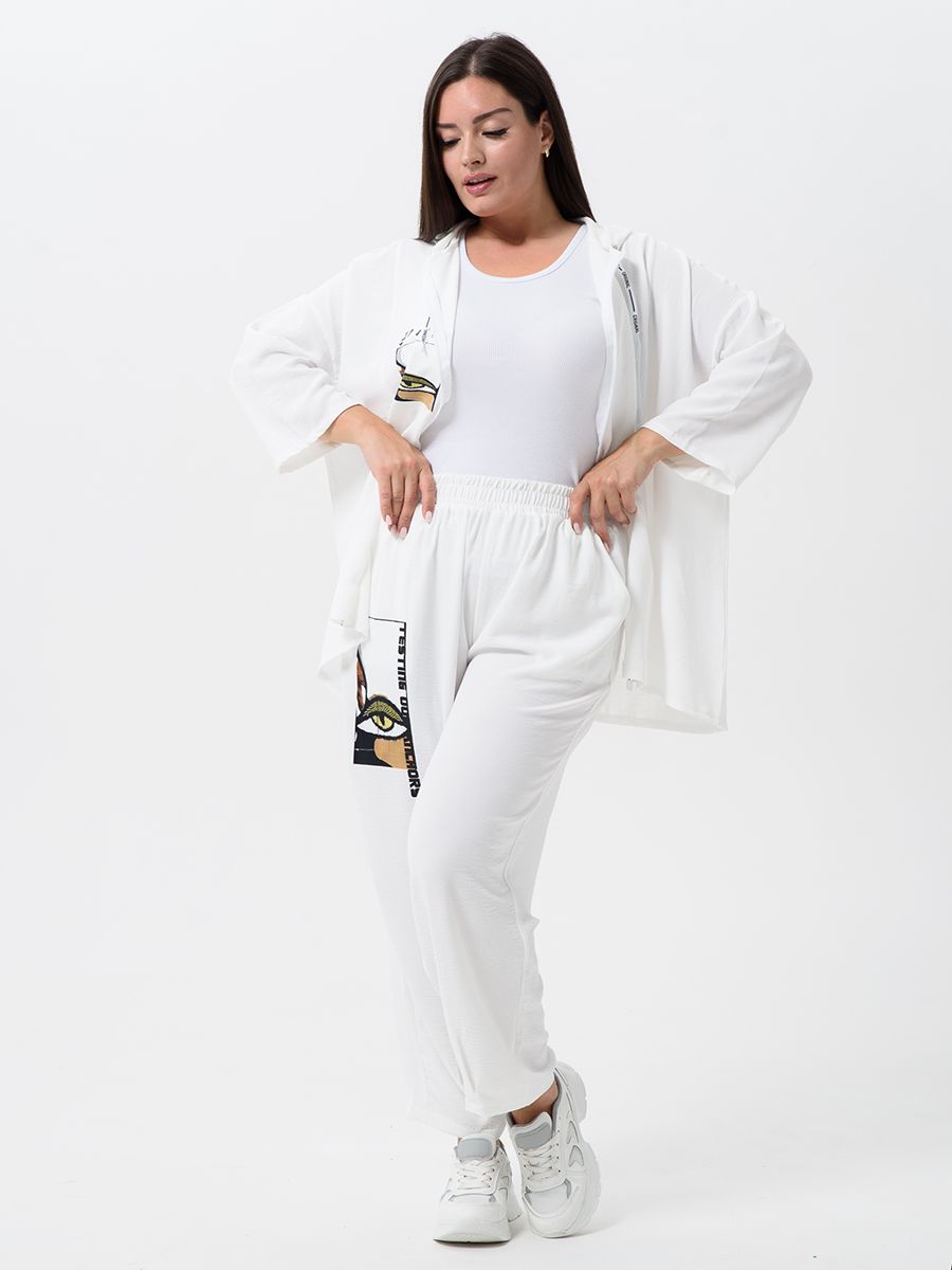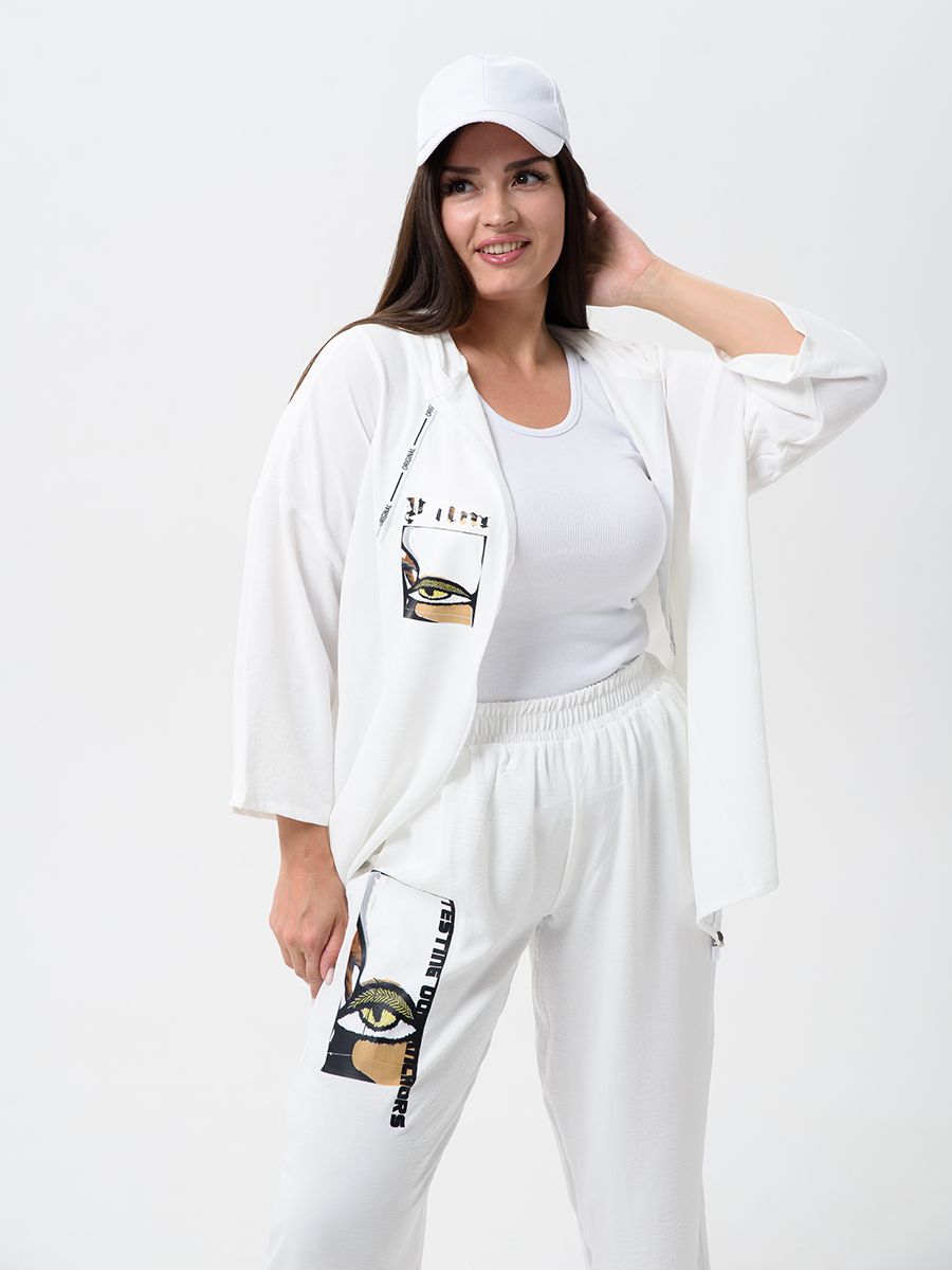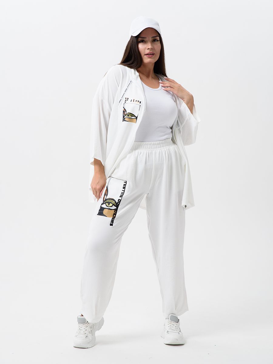 Женский стильный костюм из легкой ткани - сингапур - самое то для жаркого лета. Вверх изделия - удлинненый оверсайз кофточка на молнии с капюшоном, рукава спущенные - длина до запястья (длина рукава указана от горловины). Низ - свободные брюки с карманами, пояс на резинке, снизу имеется защипка, которая слегка заужает штаны. Костюм декорирован принтом. Свободный и стильный, не сковывает движения. Двойка на каждый день в приятных расцветках - хорошая находка для вашего гардероба!