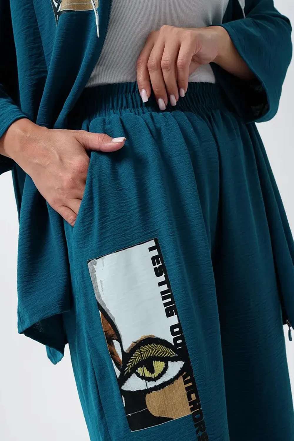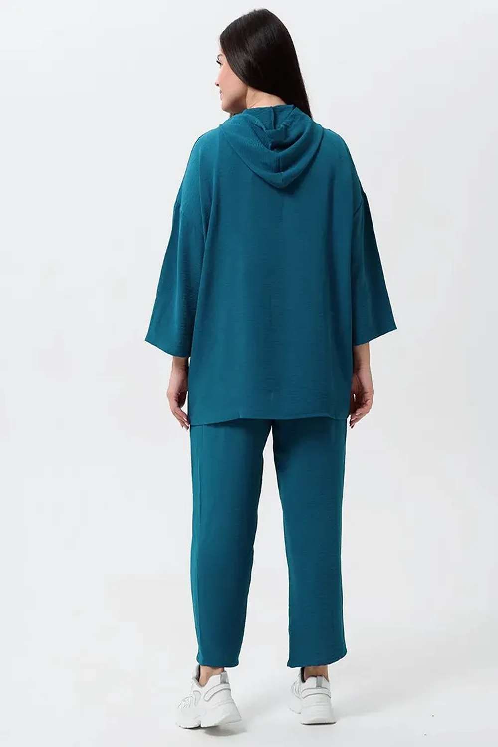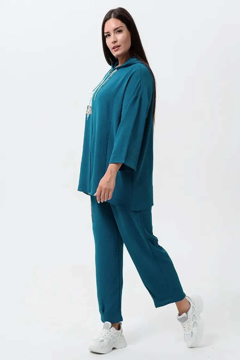Женский стильный костюм из легкой ткани - сингапур - самое то для жаркого лета. Вверх изделия - удлинненый оверсайз кофточка на молнии с капюшоном, рукава спущенные - длина до запястья (длина рукава указана от горловины). Низ - свободные брюки с карманами, пояс на резинке, снизу имеется защипка, которая слегка заужает штаны. Костюм декорирован принтом. Свободный и стильный, не сковывает движения. Двойка на каждый день в приятных расцветках - хорошая находка для вашего гардероба!