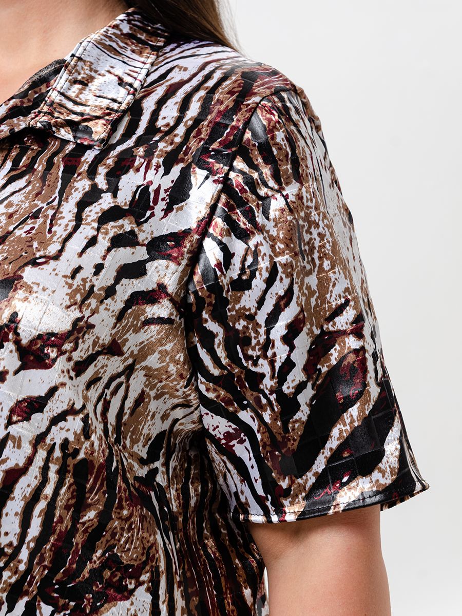 Женская летняя туника свободного кроя. Изделие с воротником рубашечного типа с планками, удлиненная спинка со "складной". Туника больших размеров. Подойдет для повседневной носки.