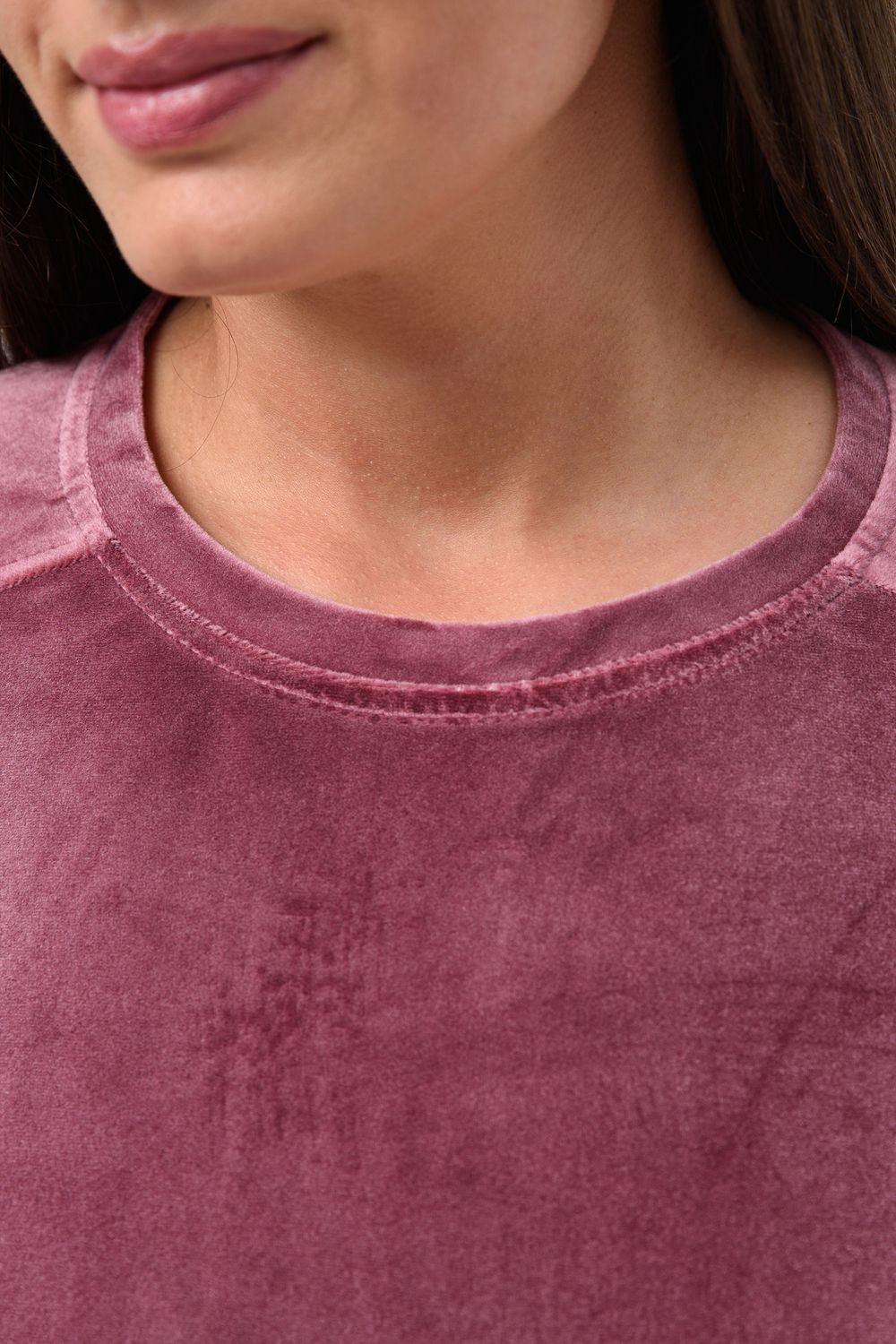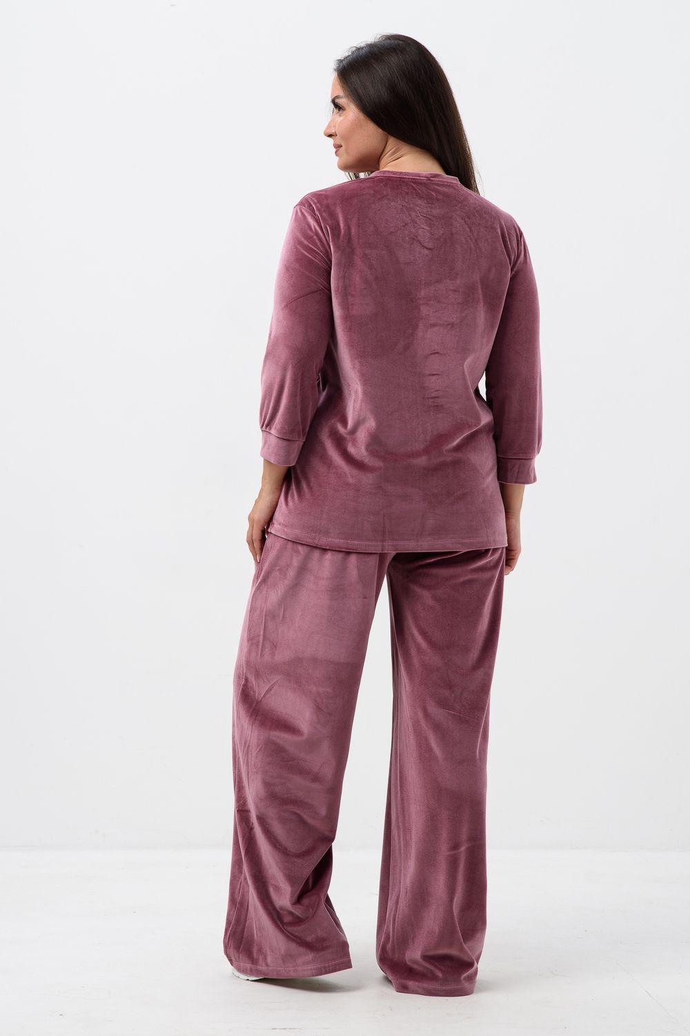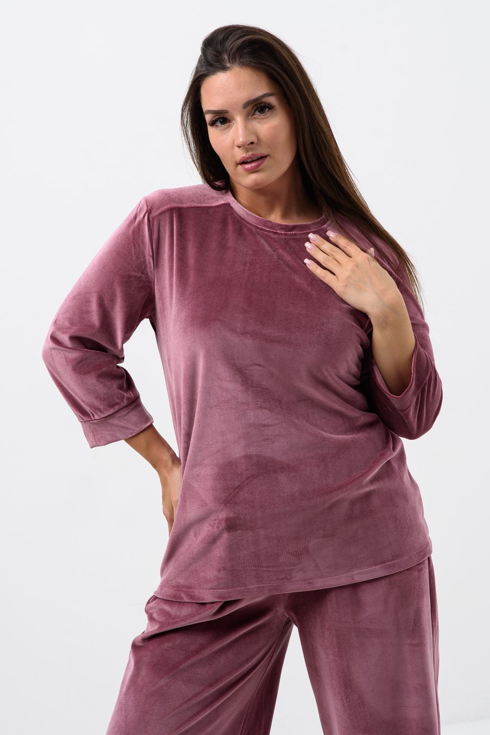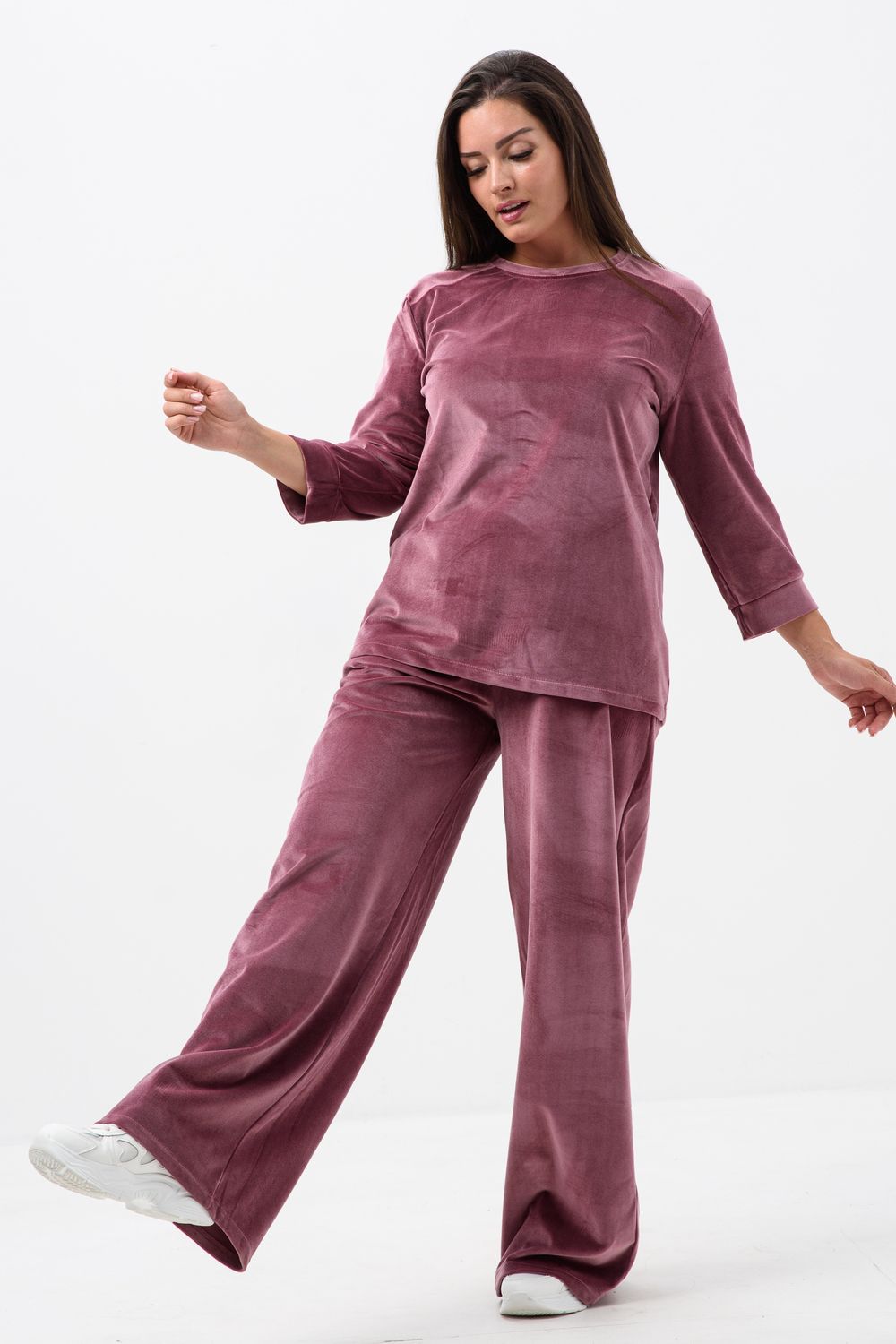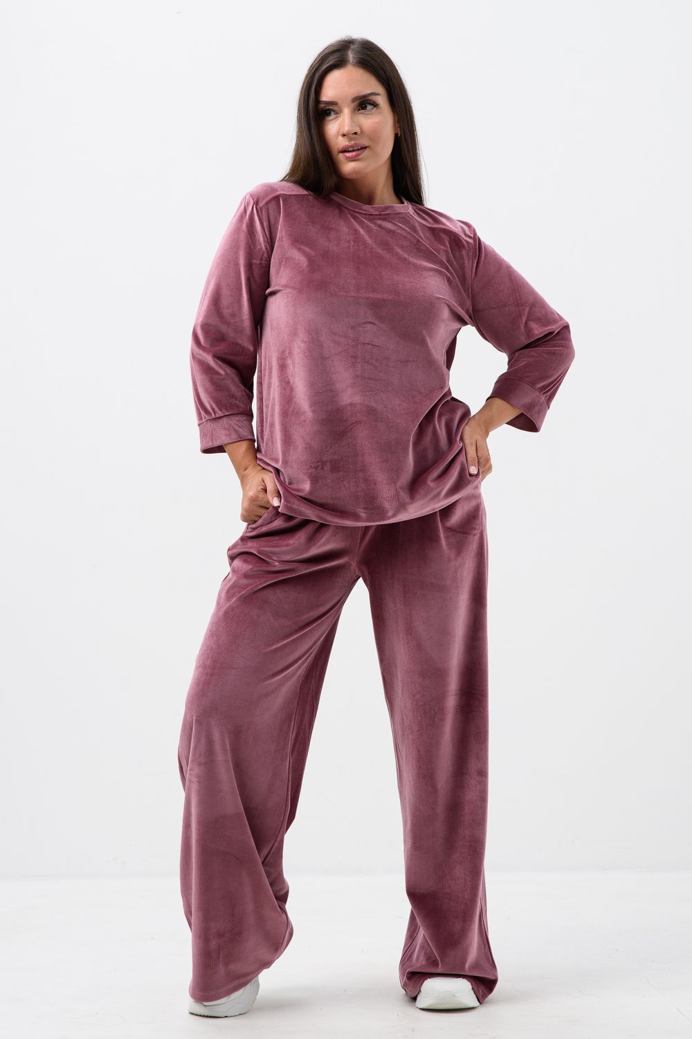 Костюм женский двойка штаны + кофта выполнен из плотной и мягкой ткани велюр. Брюки с карманами и поясом на резинке, у кофты округлый воротник и рукав 3/4 на манжете. Комплект прямого свободного силуэта, Идеального подходит для повседневной носки.