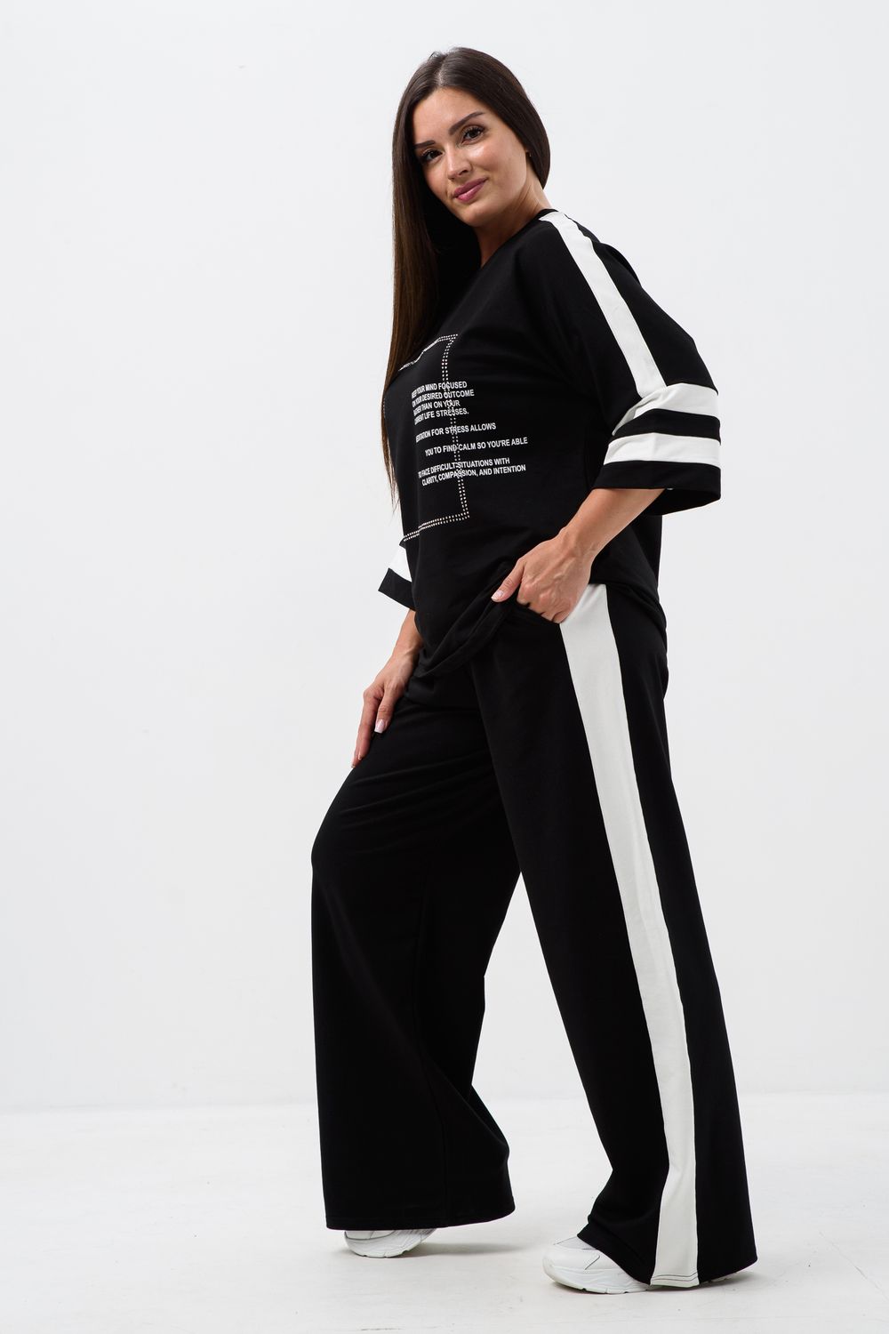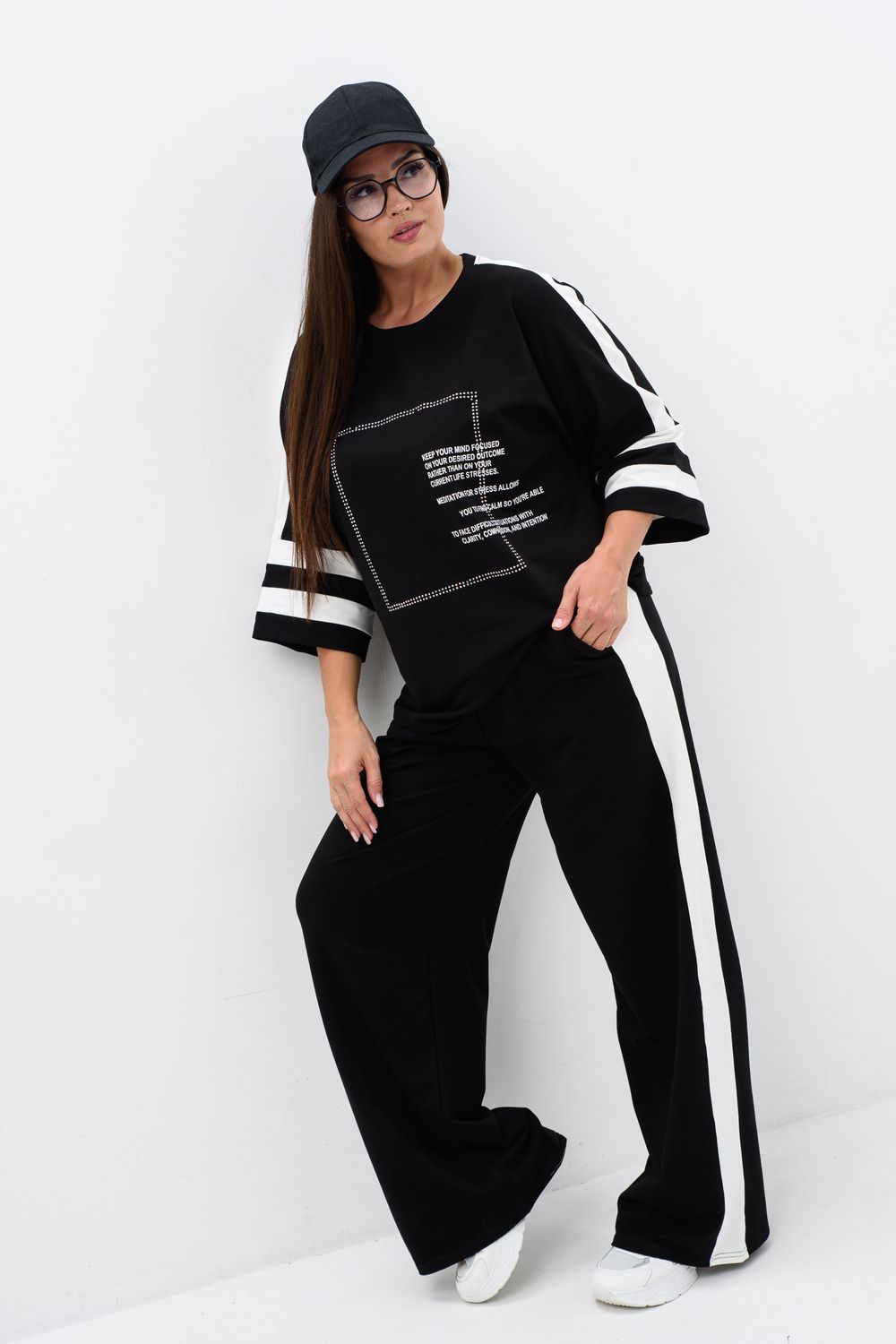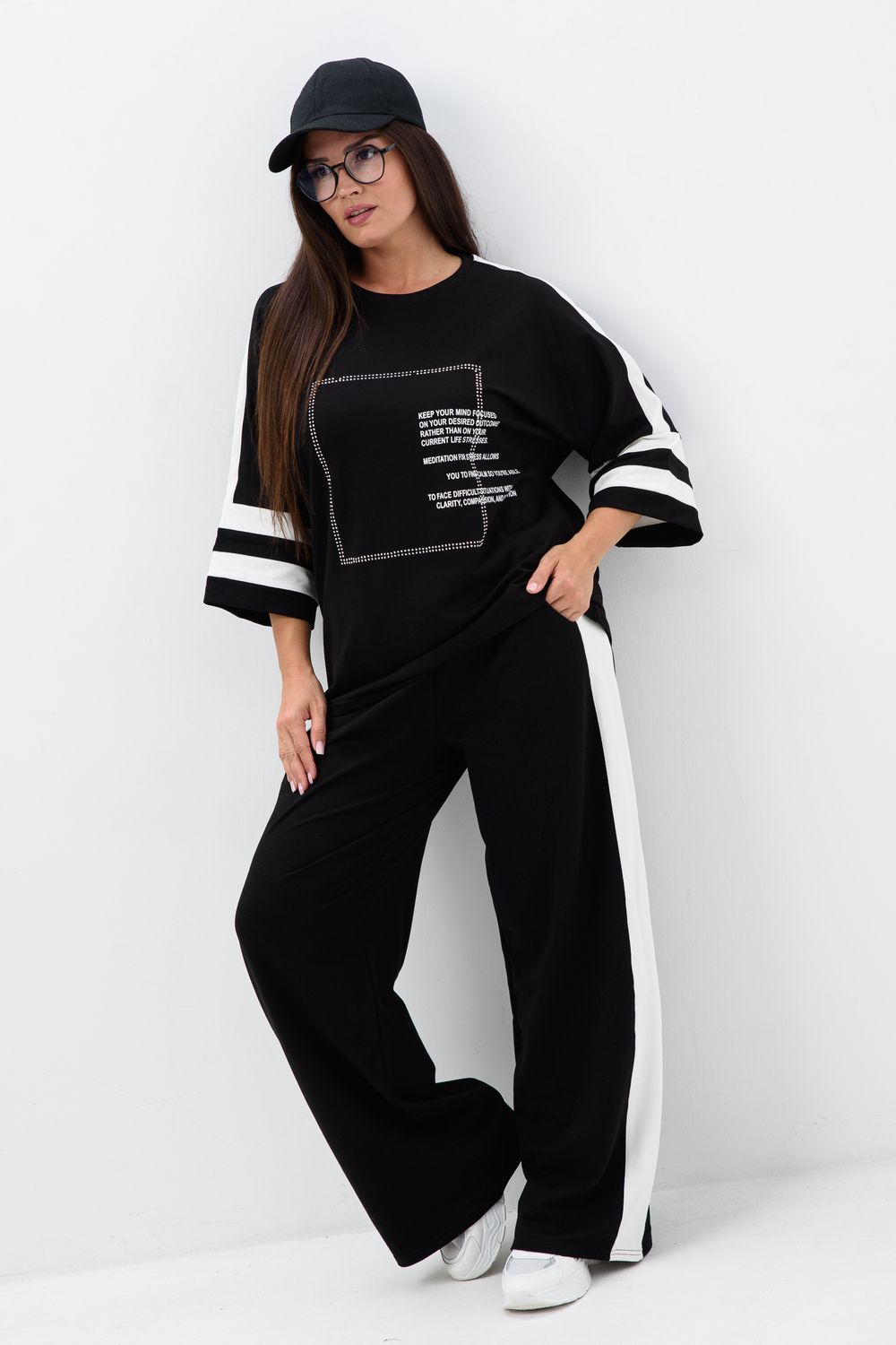 Стильный и модный костюм из футера двунитки - идеальный выбор для вашего гардероба. Этот костюм состоит из кофты с принтом и стразами, прямых брюк. Легкий и свободный крой делает его идеальным для повседневного использования. Вы будете выглядеть стильно и молодежно, независимо от вашего возраста. Футер - это тонкий трикотажный материал, который отлично подходит для демисезонного периода. Он приятен к телу, не сковывает движения и обеспечивает комфорт в течение всего дня. Этот комплект подойдет как для отдыха на природе, так и для дома.