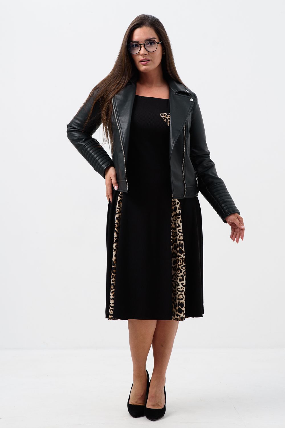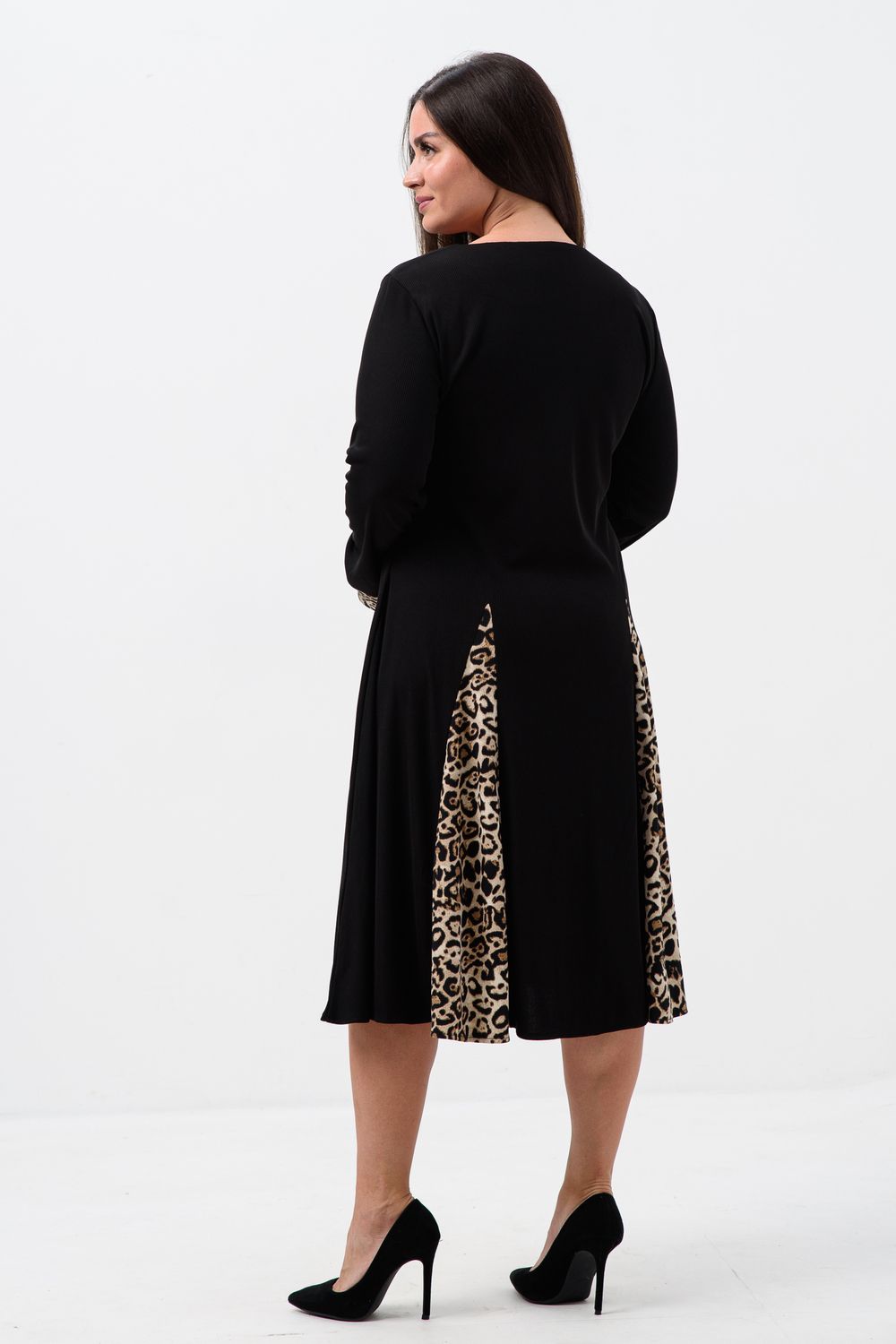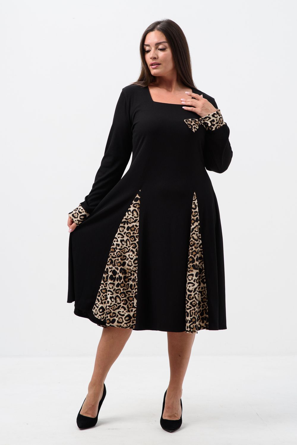 Элегантное женское платье, выполнено из приятной ткани лапша, которая хорошо тянется и идеально сядет по фигуре, Изделие с длинным рукавом, что хорошо для прохладной погоды, низ свободный с леопардовыми вставками - тренд сезона, имеется декоративный элемент - бант. Наше платье идеально подойдет как праздничное на любой повод, на работу, и просто повседневное.