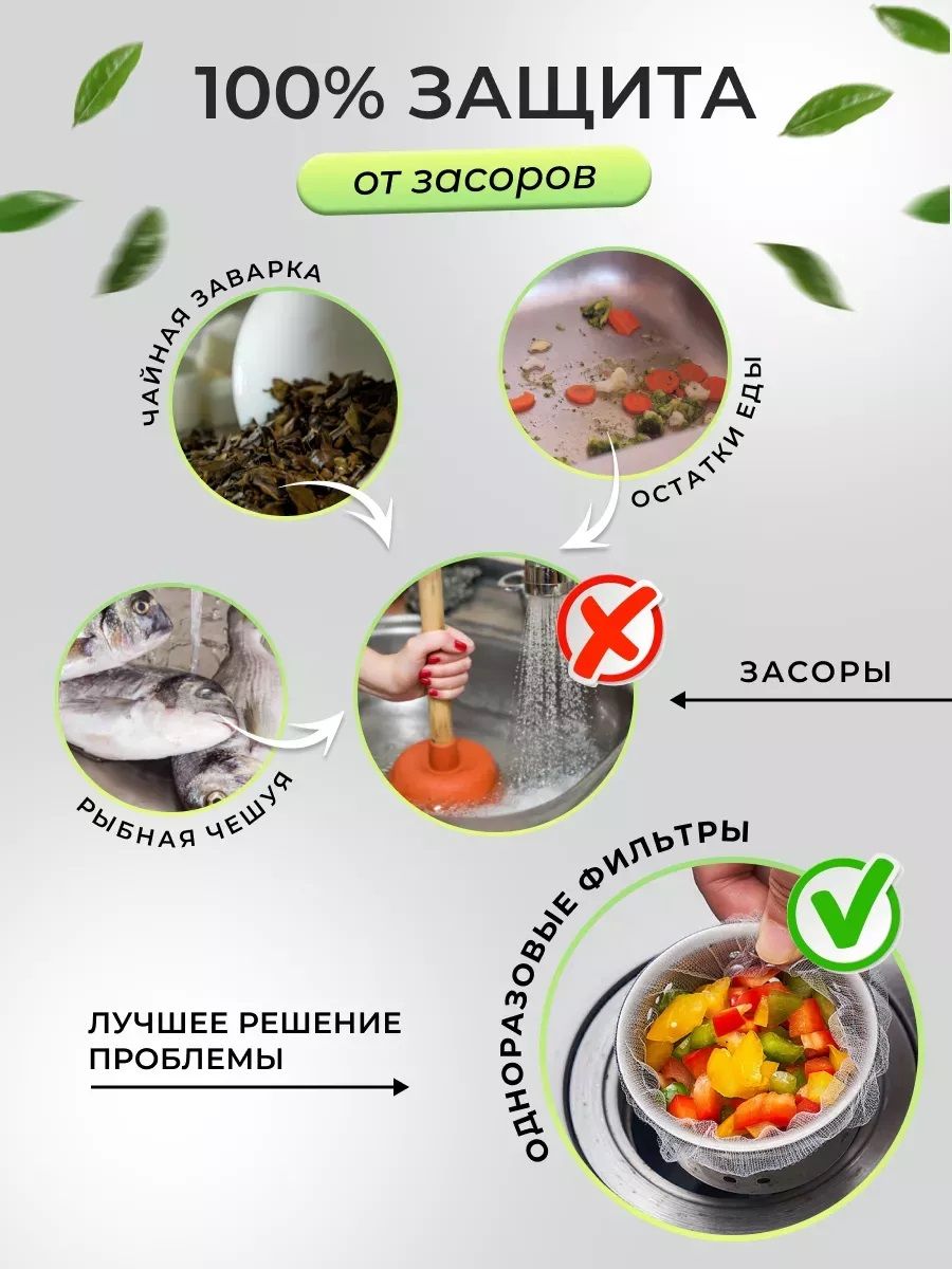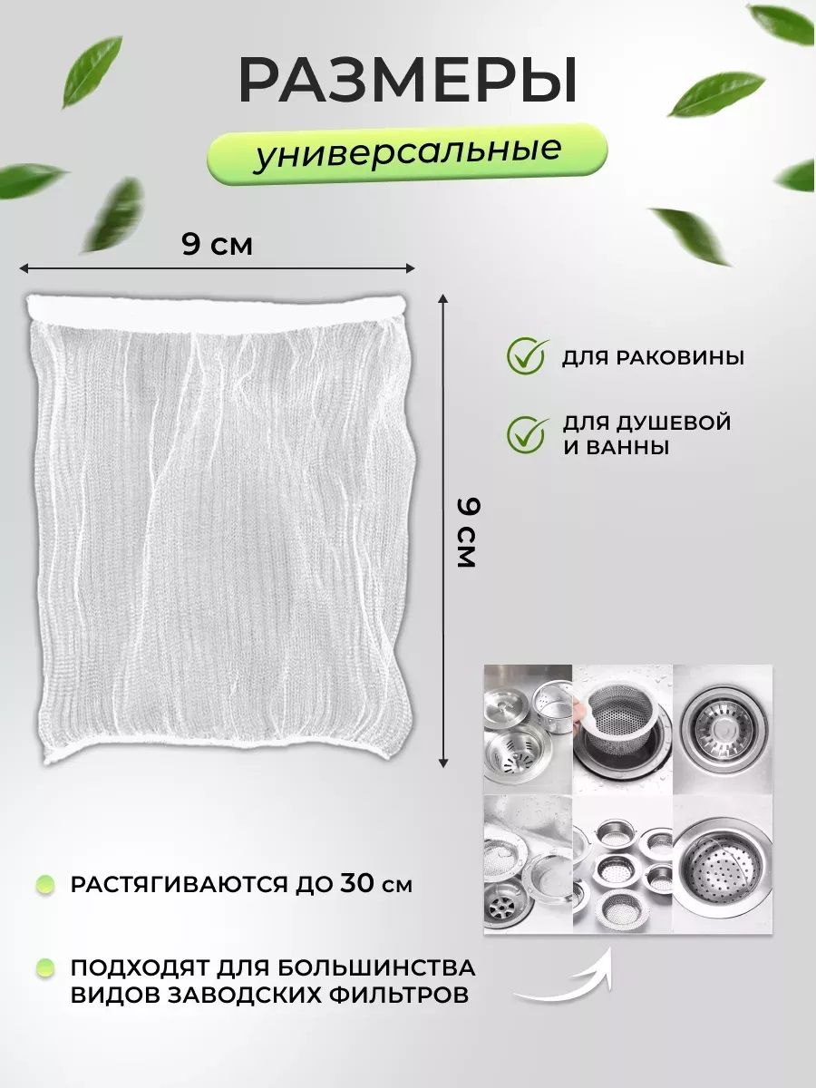 Набор одноразовых фильтров от засоров в раковину 100 штук. Универсальная сетка фильтр на слив в раковину является удобным и эффективным способом предотвратить засорение раковины ванной комнаты или кухни. Она улавливает мелкие частицы и отходы, такие как волосы, пищевые остатки и другие загрязнения отходы, которые могут попасть в мойку при использовании. После установки, сеточка фильтр начинает свою работу, задерживая загрязнения и предотвращая их попадание в трубы. Ситечко подходит под мусор в раковине. Продлевает срок использования сантехники. Сетка фильтр на раковину, в ванну или душ является эффективным способом поддержания чистоты и предотвращения засоров в ваших трубах. Она также может быть использована как дополнительная защита для сливающихся предметов, таких как кольца или серьги, чтобы они не попали в трубы и не были потеряны. Использование сетки фильтра на раковину является простым и эффективным способом поддержания чистоты и предотвращения засоров в ваших трубах. Кухонный сетчатый чехол для слива сливной. Круглый фильтр для воды. Улавливатель волос. Удобная сантехника для ванной и кухни под раковину.