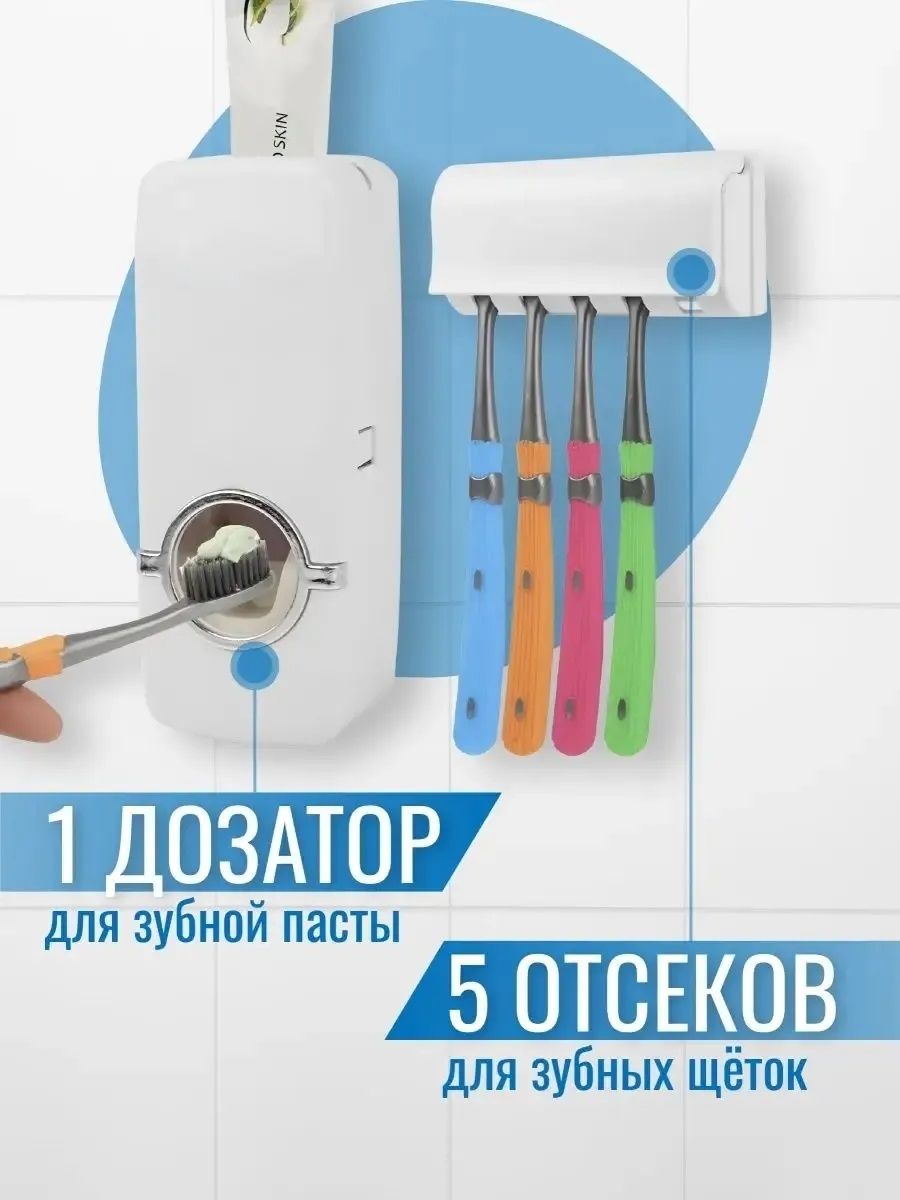 Данный дозатор для зубной пасты с держателем для щеток (в количестве до 5 штук )является настенным. Подходит для большой семьи. Набор будет идеальным дополнением для вашей ванной комнаты и сделает вашу жизнь более комфортной. Принцип работы аналогичен тому, что используется в диспенсерах для жидкого мыла. Зубные щетки находятся под крышкой, что позволяет им быстро сохнуть и быть защищенными от загрязнений. Данный распределитель делает процесс утренней гигиены увлекательной и абсолютно безопасной для маленьких детей. Он ограничивает количество пасты и выдает только столько, сколько нужно для чистки зубов. Он компактен и легко устанавливается, так как требуется всего лишь клеевое крепление, что исключает необходимость сверления или повреждения стен. Свободно разбирается и моется, когда это необходимо. Белый дизайн прост и элегантен, поэтому отлично впишется в любой интерьер.