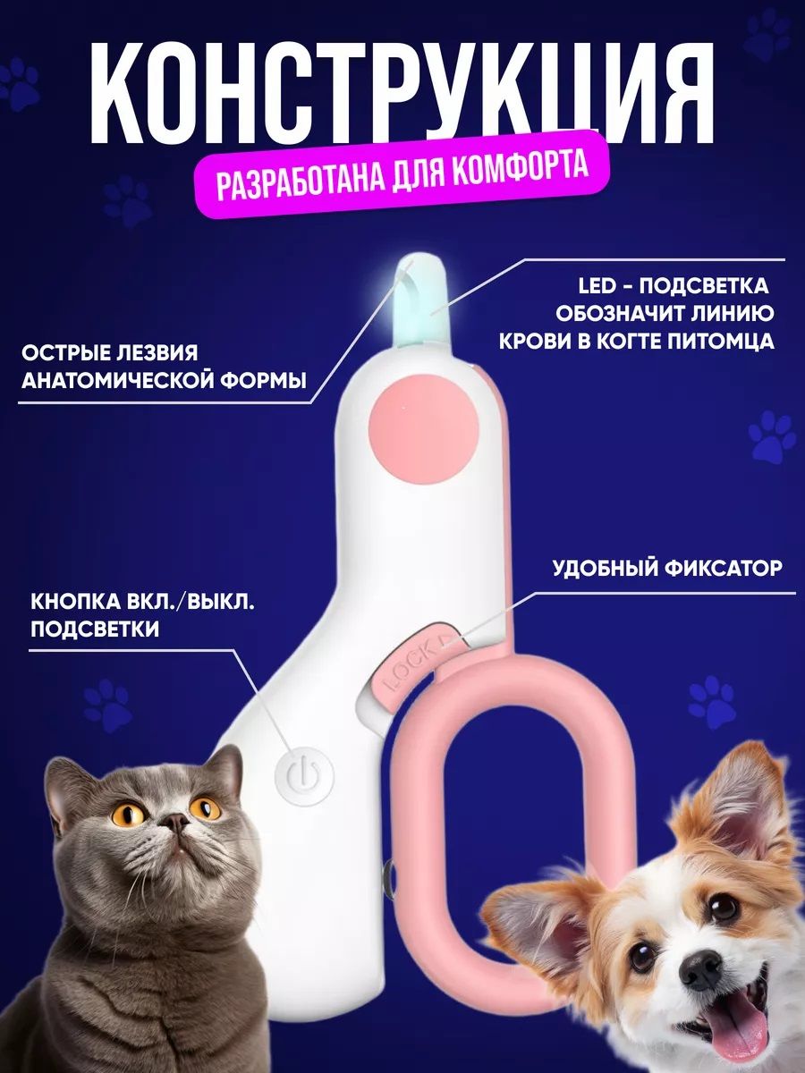 Когтерез для кошек и собак любых пород. Не расслаивает когти. Встроенная LED-подсветка позволяет безопасного стричь когти, в отличие от других когтерезов. Удобные ножницы для кошек и собак и прочих инструментов для груминга животных, а также царапки для кошек. Причины почему это последний когтерез, который вы купите: Острые лезвия изготовлены из нержавеющей стали и не тупятся спустя годы. Подсветка когтереза позволяет точно увидеть место среза и не повредить коготь питомца. Ножницы для когтей занимают мало места. Груминг и уход без боли. Без стресса. Ваша кошка и собака будут довольны этой игрушке.