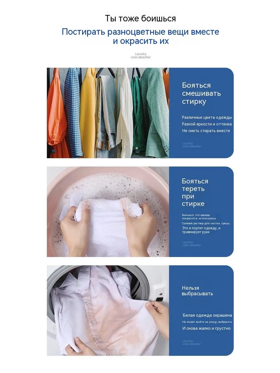 Салфетки ловушки цвета эффективно защищают вещи от окрашивания при стирке в стиральной машине. Впитывая лишние красители позволяют добиться идеального состояния цветных и белых вещей. Салфетки без ворсовые, одноразовые, пропитаны специальным составом, который притягивает нестойкие красители из цветных тканей и защищает от случайного окрашивания более светлое белье. В комплекте 50 штук салфеток, которые позволяют одновременно стирать белые и цветные вещи, не опасаясь линьки и потери внешнего вида. В процессе стирки ловушка притягивает на себя красители, способствуя более эффективной стирке и чистоте вещей. Салфетки для стирки от окрашивания. Салфетки для одежды при стирке белья действуют как уловитель и блокатор цвета. Эффективная защита белья от окрашивания и восстановление цвета. Магнитные салфетки подходят для стирки не только повседневного, но и постельного белья, пуховика и верхней одежды. Подходят для стирки против окрашивания, восстанавливают цвет. Благодаря магнитам цвета можно не сортировать одежду, распределяя на черные, цветные и белые. Очищающие пластинки это отличный способ ухода и чистки одежды. Помогают удалению пятен, усиливая пятновыводящие свойства других средств. 50шт в упаковке