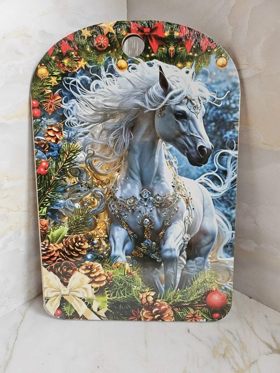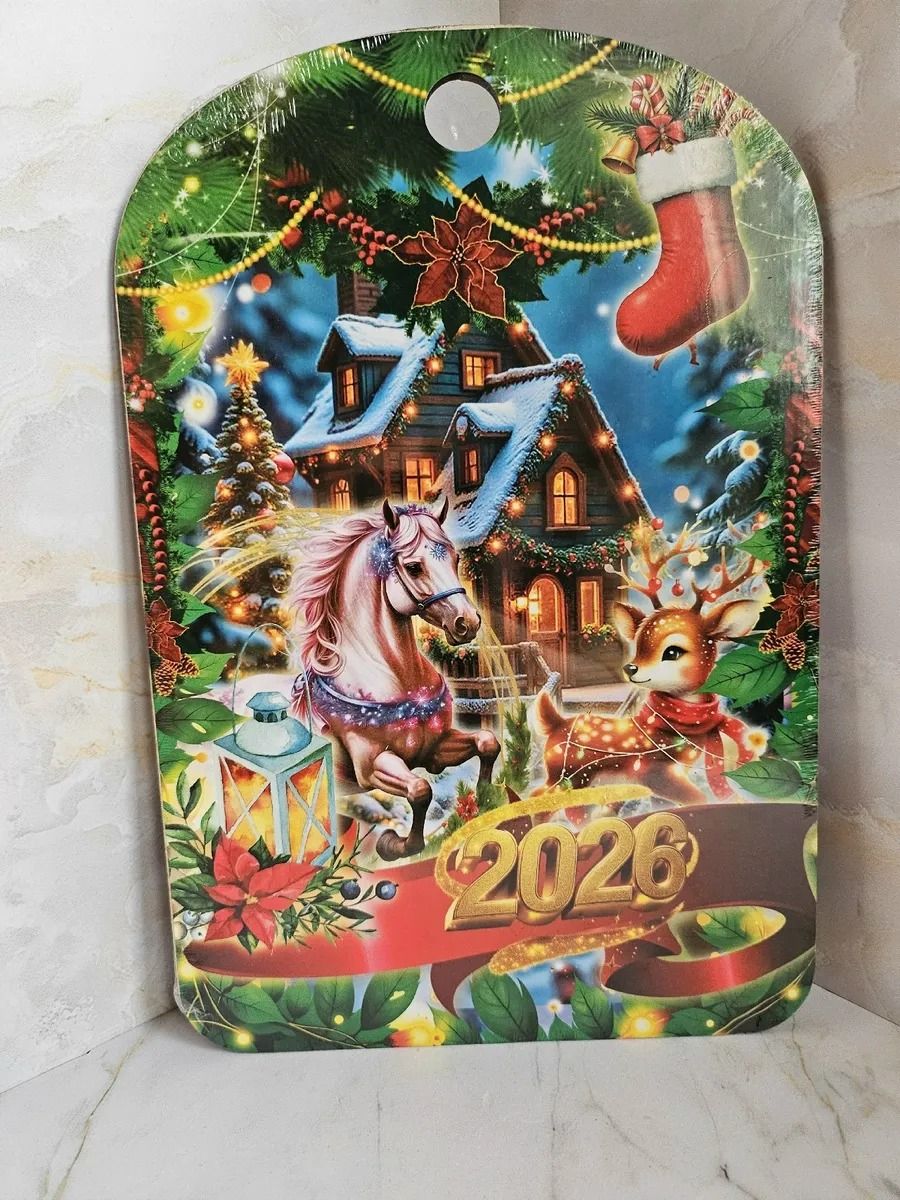 Красивая декоративная, сувенирная, разделочная доска на Новый год 2026 с символом года - лошадью. Выполнена из экологически чистого материала - дерева, что делает досточку прочной и долговечной. Досточка с ярким и запоминающимся рисунком будет прекрасным дополнением Вашего новогоднего интерьера. Доска идеально подойдет в качестве подарка Вам и Вашим близким. Она может стать как отдельным подарком, так и послужить прекрасным дополнением. Вы можете использовать ее непосредственно по назначению либо в качестве элемента декора, повесив на стену. Яркая печать с символикой нового года 2026. Обратную сторону можно использовать как подставку под горячее или для нарезки хлебобулочных изделий. Размер 27*18.