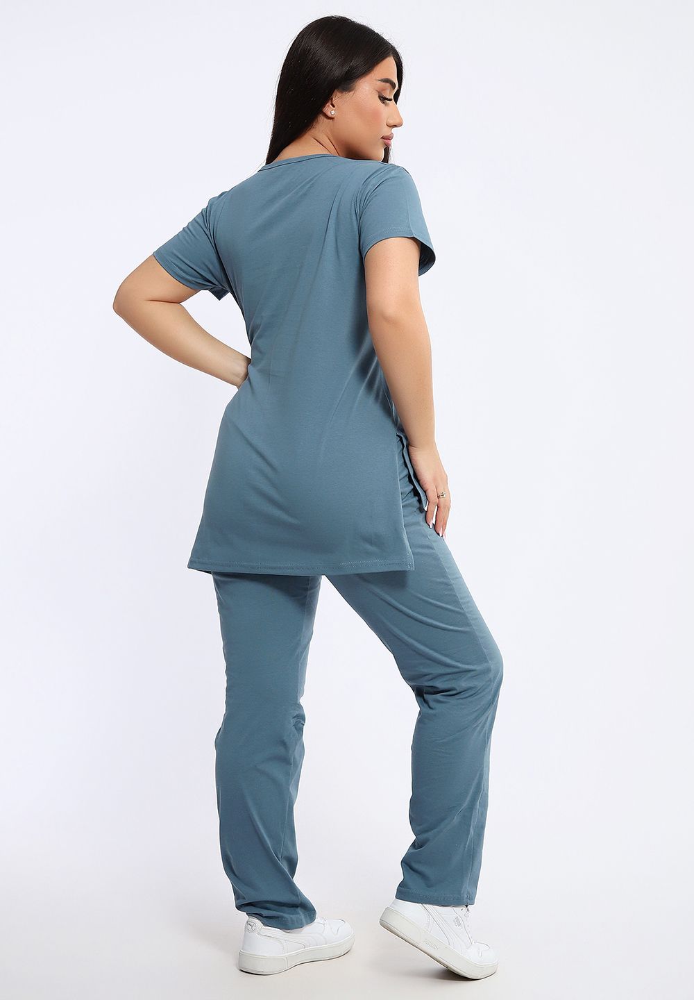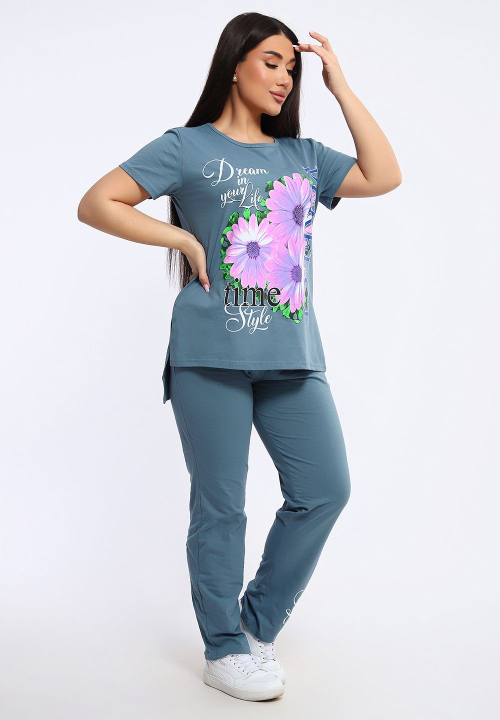 Посмотрите какая нежность. Женский костюм с брюками включает в себя стильный верх - футболку с удлиненной спинкой и двумя боковыми разрезами, украшенную красивым цветочным принтом. Брюки в комплекте длинные и свободные, также имеют оригинальный принт с надписями в нижней части.