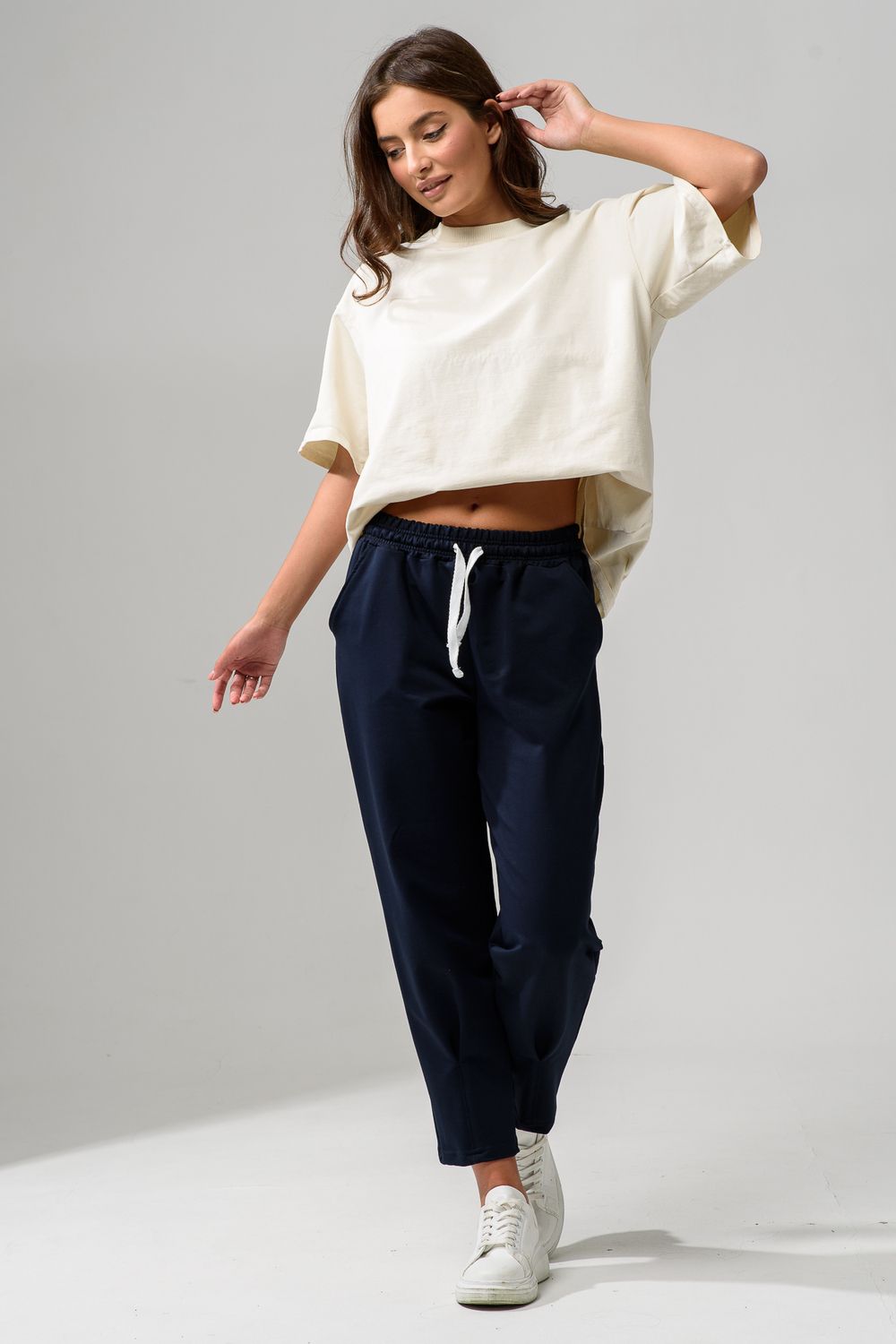 Брюки - бананы. Эластичный пояс с завязками для удобной посадки. Два глубоких боковых кармана. Защипы внизу штанин удлиняют ноги и создают женственный силуэт. Подходят всем. Широкая размерная линейка от 42-58. Для любого типа фигуры.