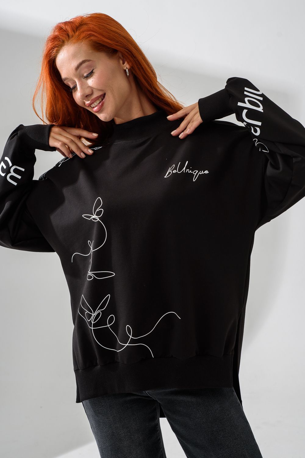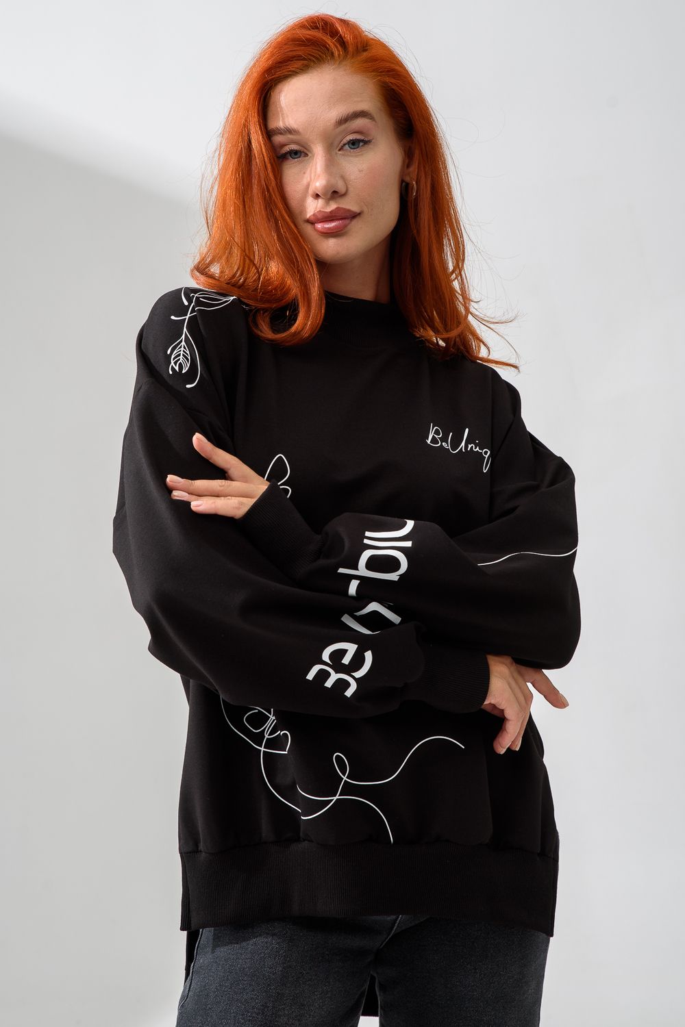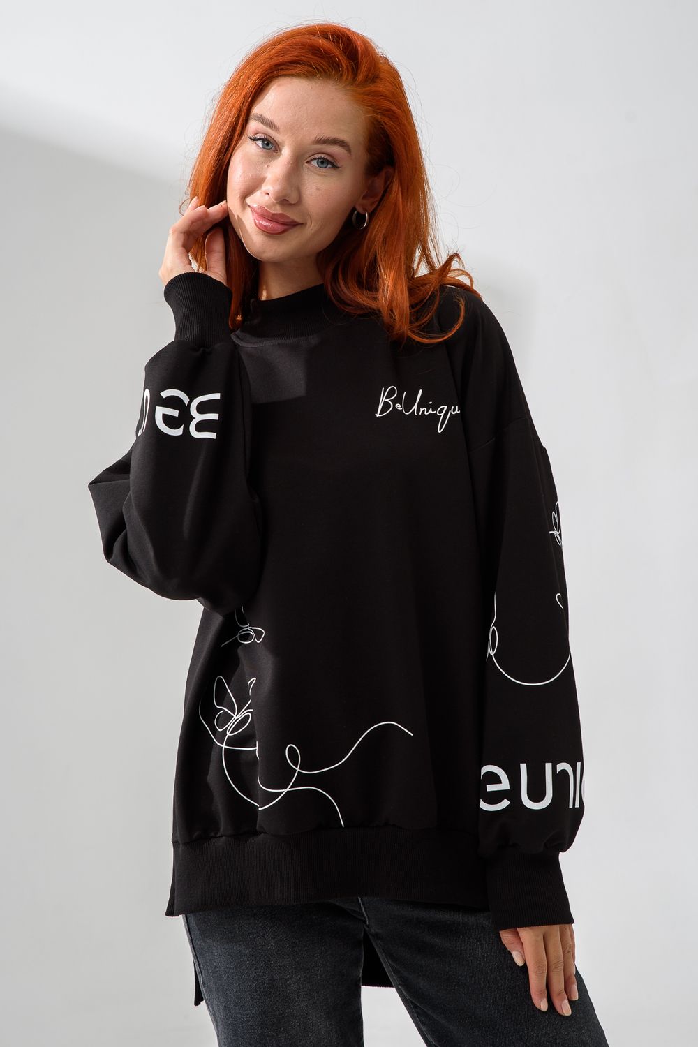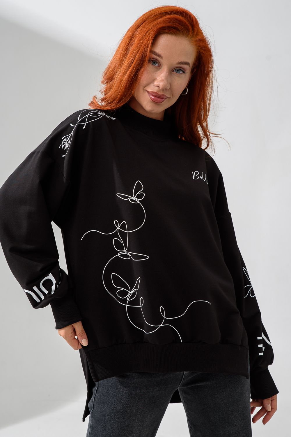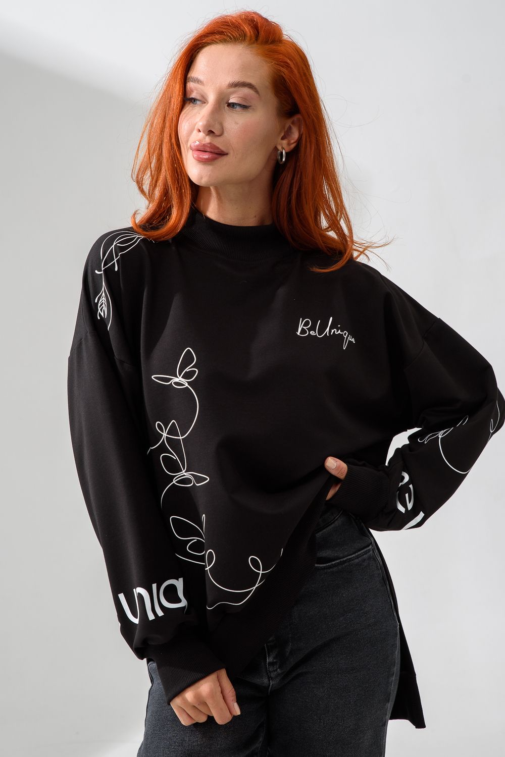 Женский свитшот оверсайз в универсальном черном цвете! Эта модная удлиненная толстовка не просто согреет вас в прохладную погоду, но и подчеркнет вашу индивидуальность благодаря уникальному дизайну и вдохновляющей надписи. На груди расположена стильная надпись "Be Unique" (Будь уникальной), которая вдохновляет и добавляет изделию индивидуальности. По рукавам и по бокам свитшот украшен минималистичным линейным рисунком в виде изящных бабочек и абстрактных линий. Свитшот с высокой горловиной (или воротником-стойкой) обеспечивает дополнительную защиту от ветра и холода. .Модный удлиненный силуэт с элегантными боковыми разрезами по низу делает свитшот более динамичным и позволяет носить его как навыпуск, так и частично заправленным. Разрезы также добавляют свободы движений. Теплый свитшот отлично пропускает воздух, сохраняет форму после стирок и обеспечивает комфорт в течение всего дня