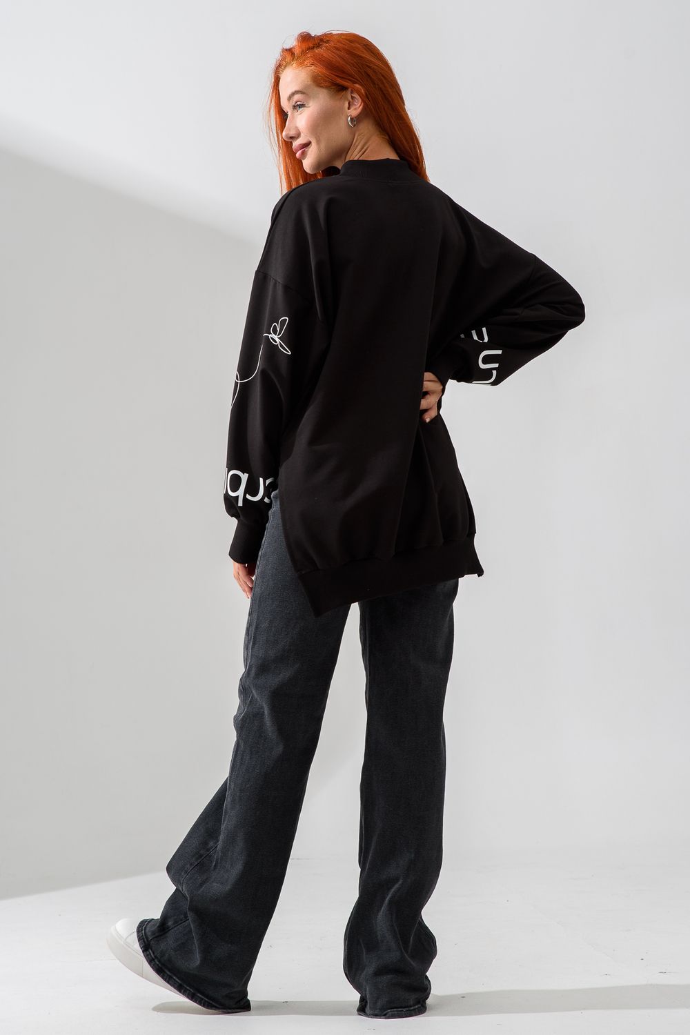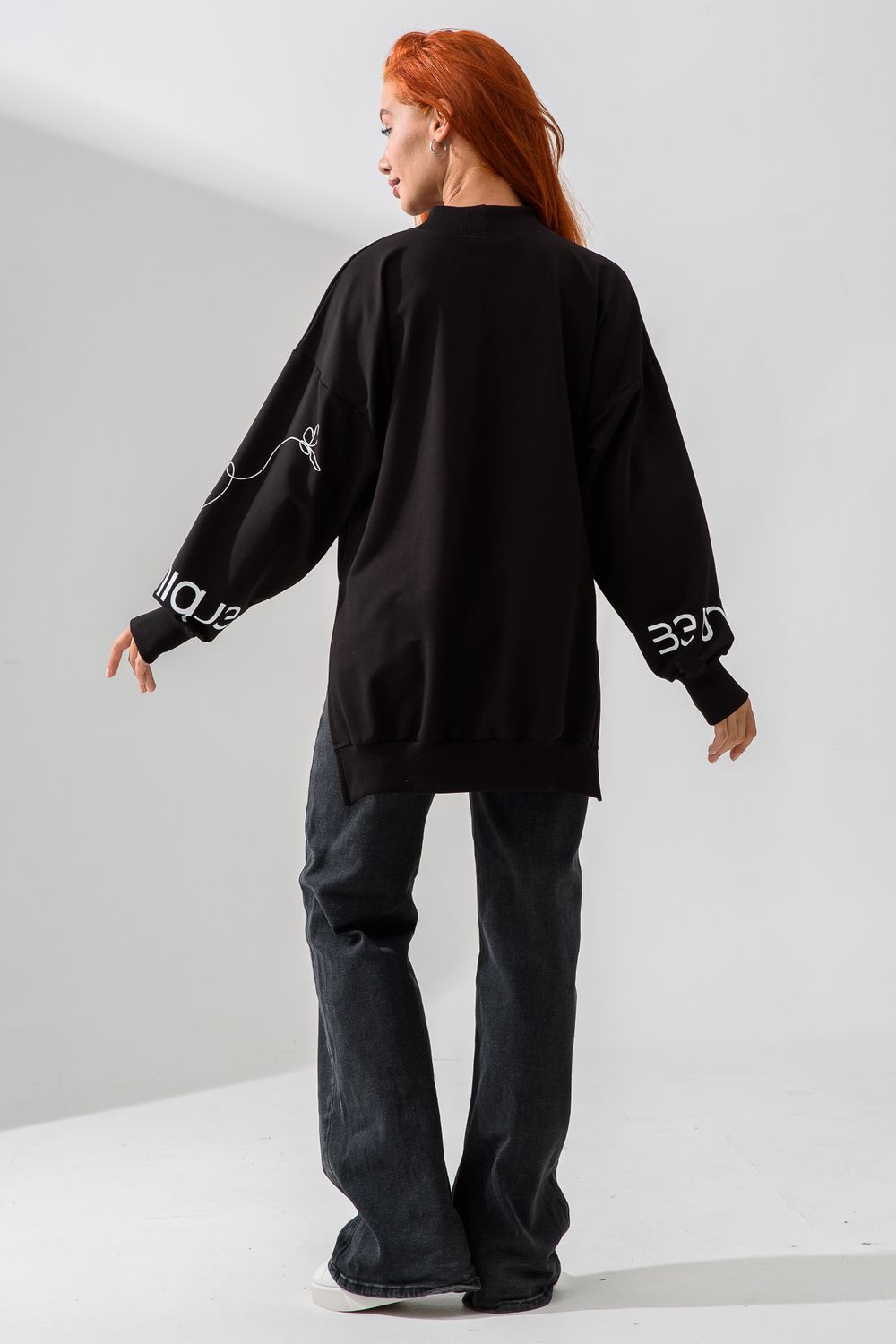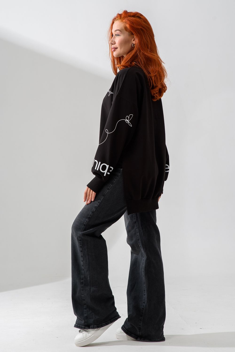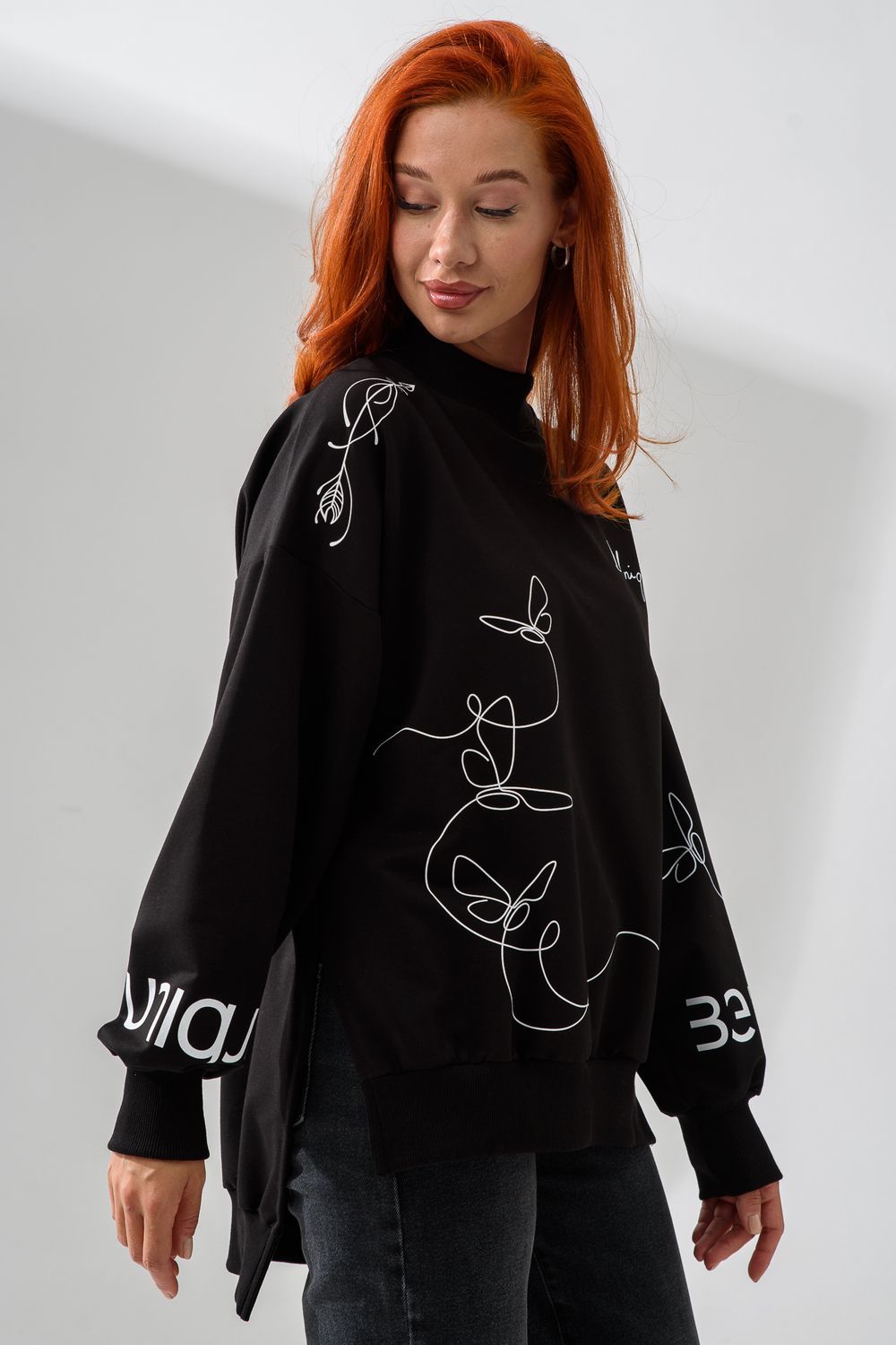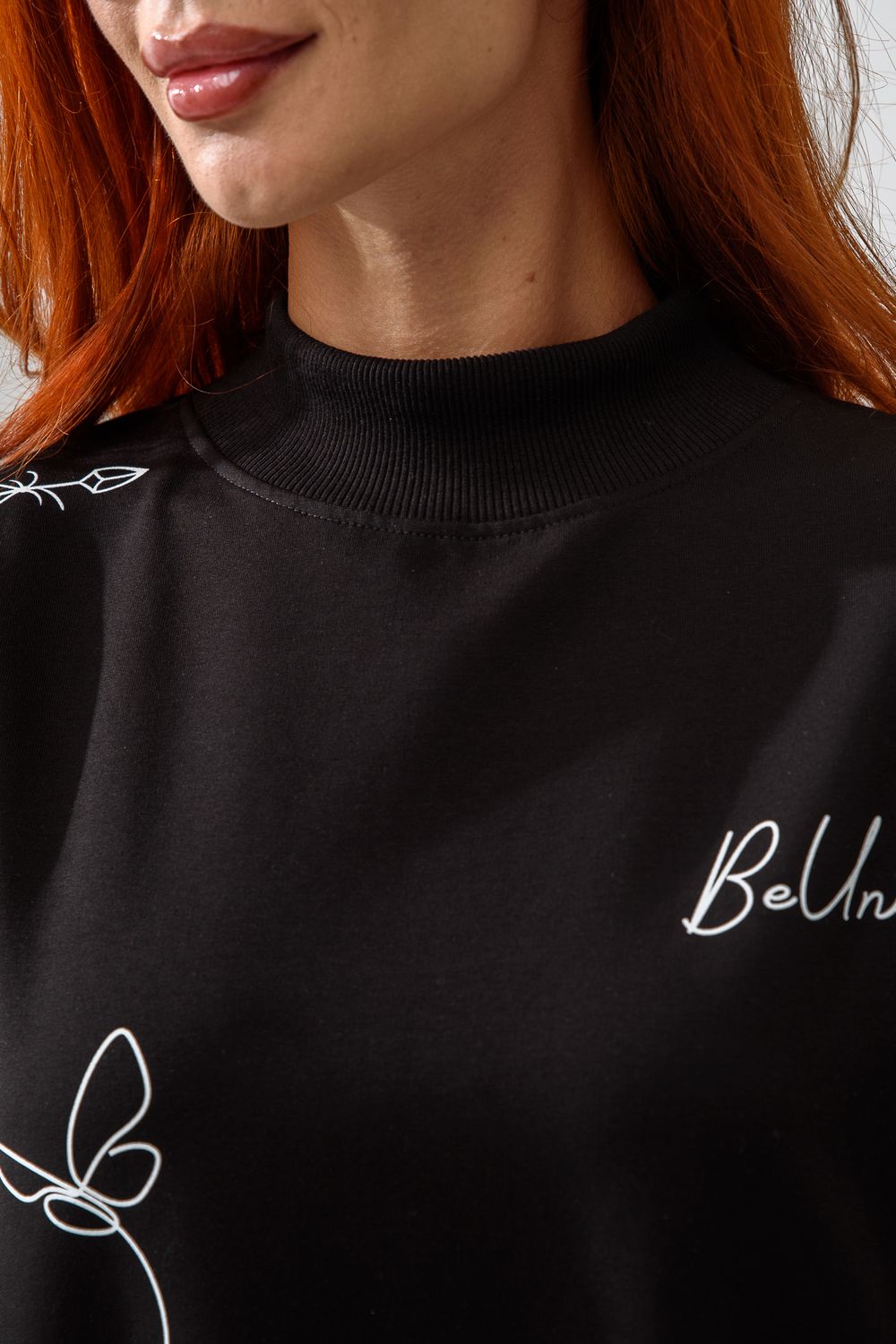 Женский свитшот оверсайз в универсальном черном цвете! Эта модная удлиненная толстовка не просто согреет вас в прохладную погоду, но и подчеркнет вашу индивидуальность благодаря уникальному дизайну и вдохновляющей надписи. На груди расположена стильная надпись "Be Unique" (Будь уникальной), которая вдохновляет и добавляет изделию индивидуальности. По рукавам и по бокам свитшот украшен минималистичным линейным рисунком в виде изящных бабочек и абстрактных линий. Свитшот с высокой горловиной (или воротником-стойкой) обеспечивает дополнительную защиту от ветра и холода. .Модный удлиненный силуэт с элегантными боковыми разрезами по низу делает свитшот более динамичным и позволяет носить его как навыпуск, так и частично заправленным. Разрезы также добавляют свободы движений. Теплый свитшот отлично пропускает воздух, сохраняет форму после стирок и обеспечивает комфорт в течение всего дня