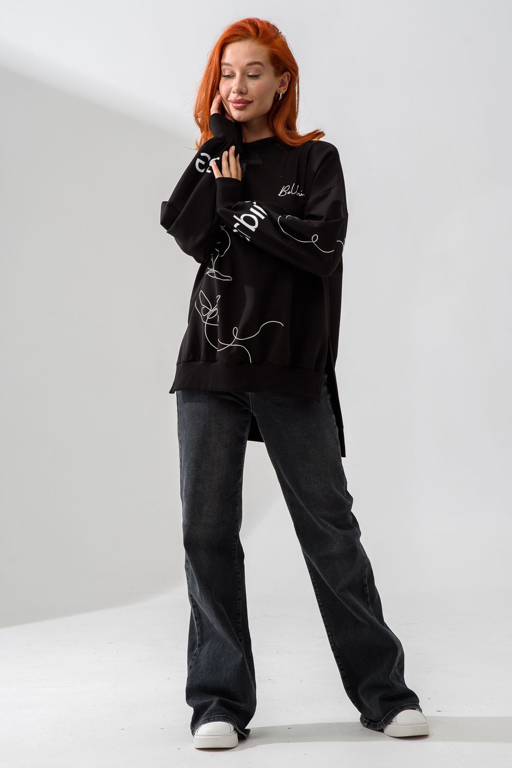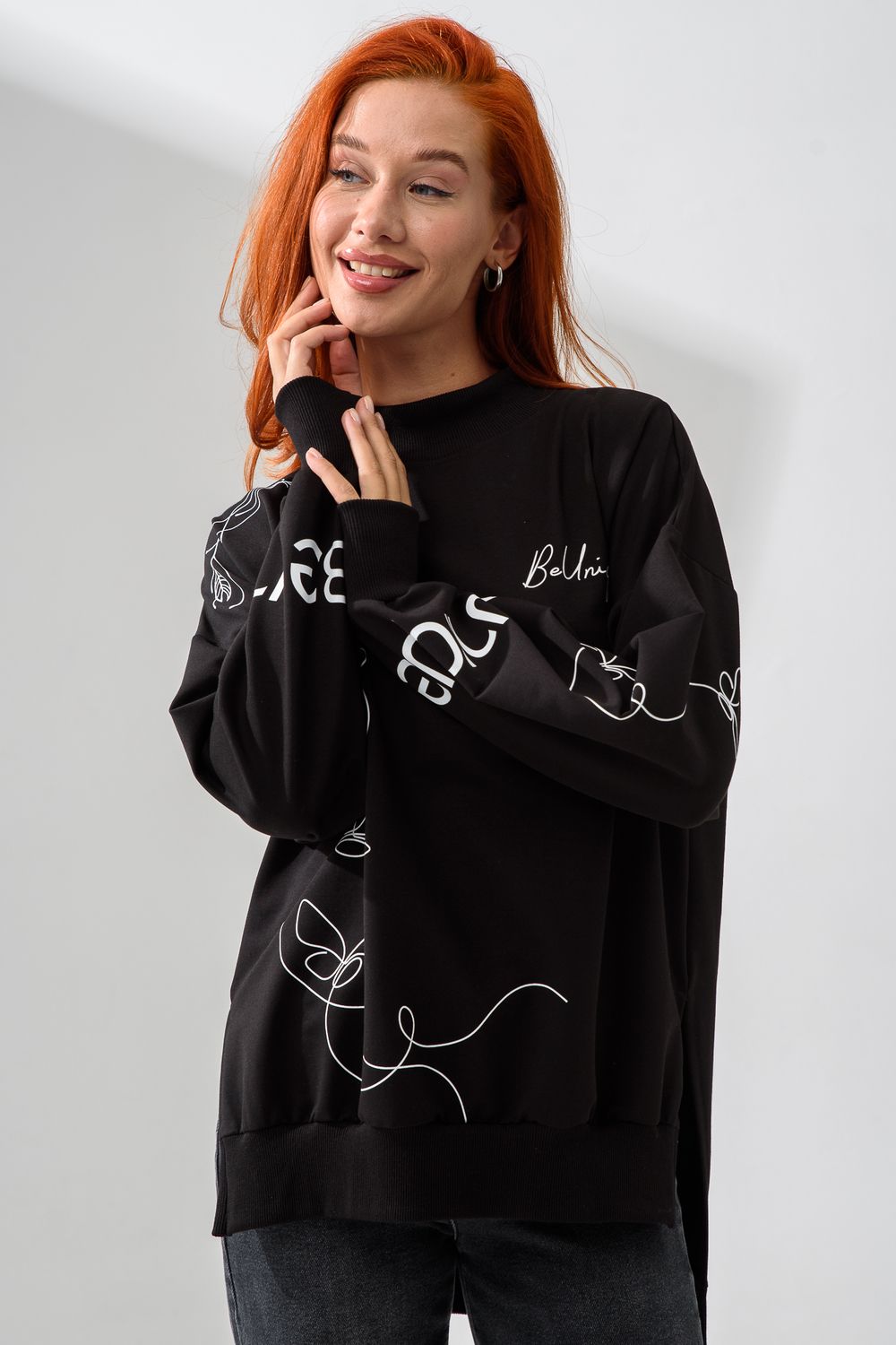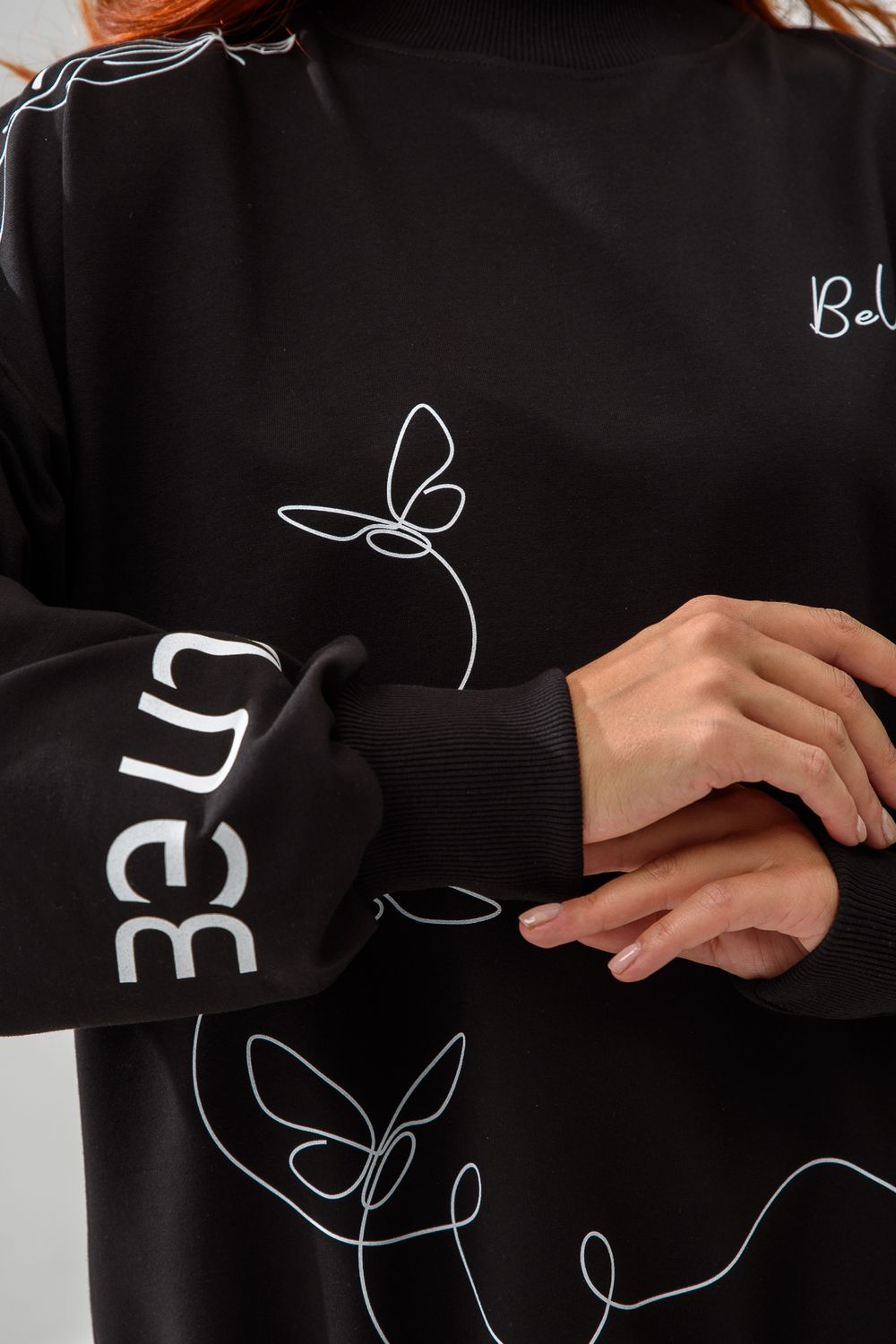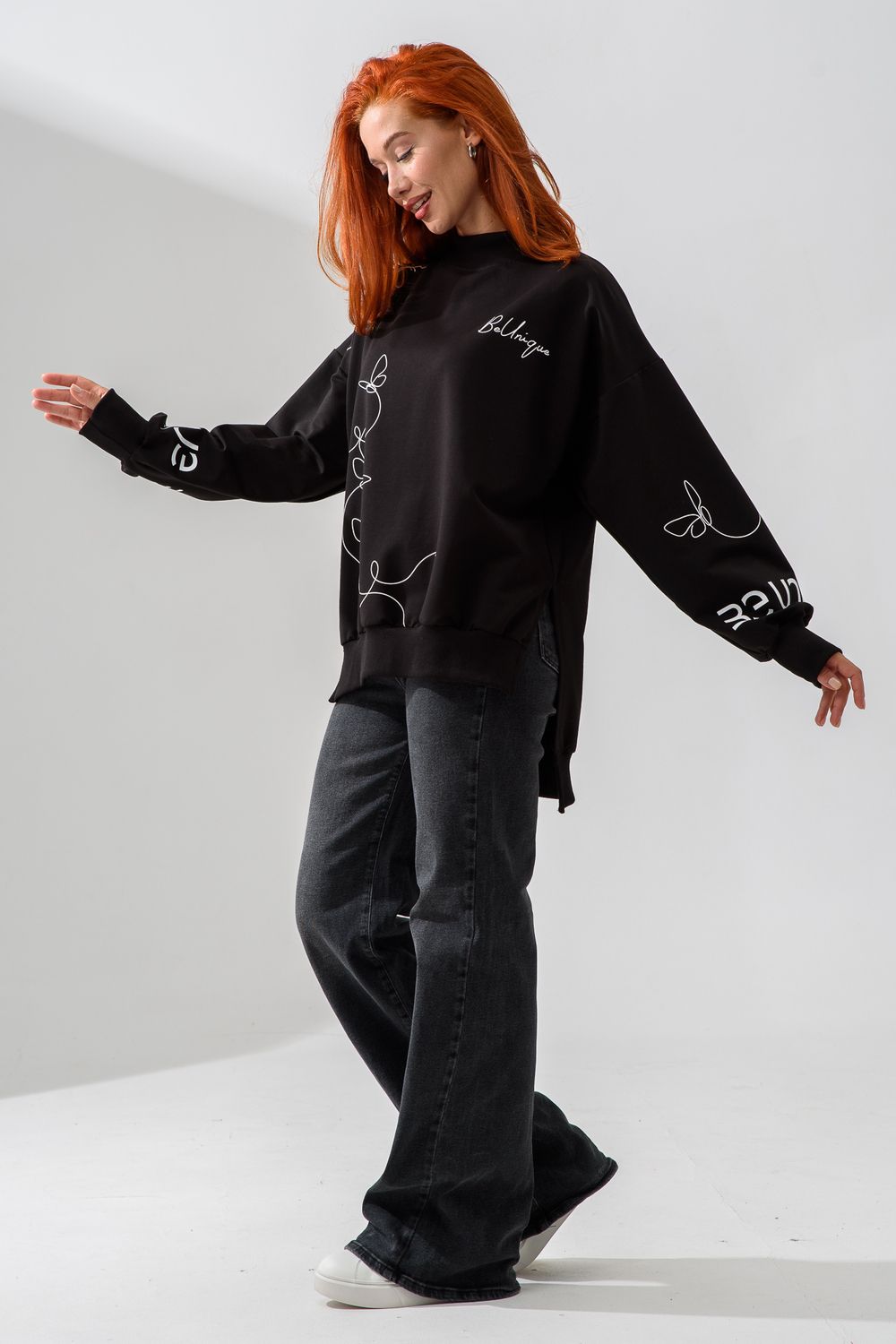 Женский свитшот оверсайз в универсальном черном цвете! Эта модная удлиненная толстовка не просто согреет вас в прохладную погоду, но и подчеркнет вашу индивидуальность благодаря уникальному дизайну и вдохновляющей надписи. На груди расположена стильная надпись "Be Unique" (Будь уникальной), которая вдохновляет и добавляет изделию индивидуальности. По рукавам и по бокам свитшот украшен минималистичным линейным рисунком в виде изящных бабочек и абстрактных линий. Свитшот с высокой горловиной (или воротником-стойкой) обеспечивает дополнительную защиту от ветра и холода. .Модный удлиненный силуэт с элегантными боковыми разрезами по низу делает свитшот более динамичным и позволяет носить его как навыпуск, так и частично заправленным. Разрезы также добавляют свободы движений. Теплый свитшот отлично пропускает воздух, сохраняет форму после стирок и обеспечивает комфорт в течение всего дня