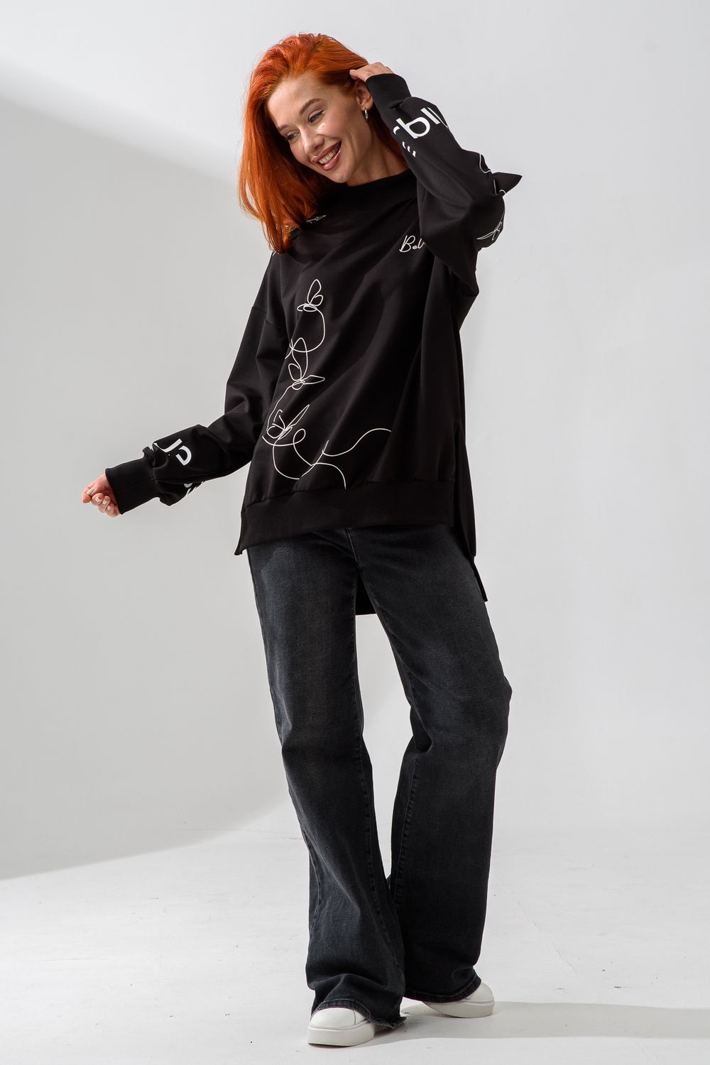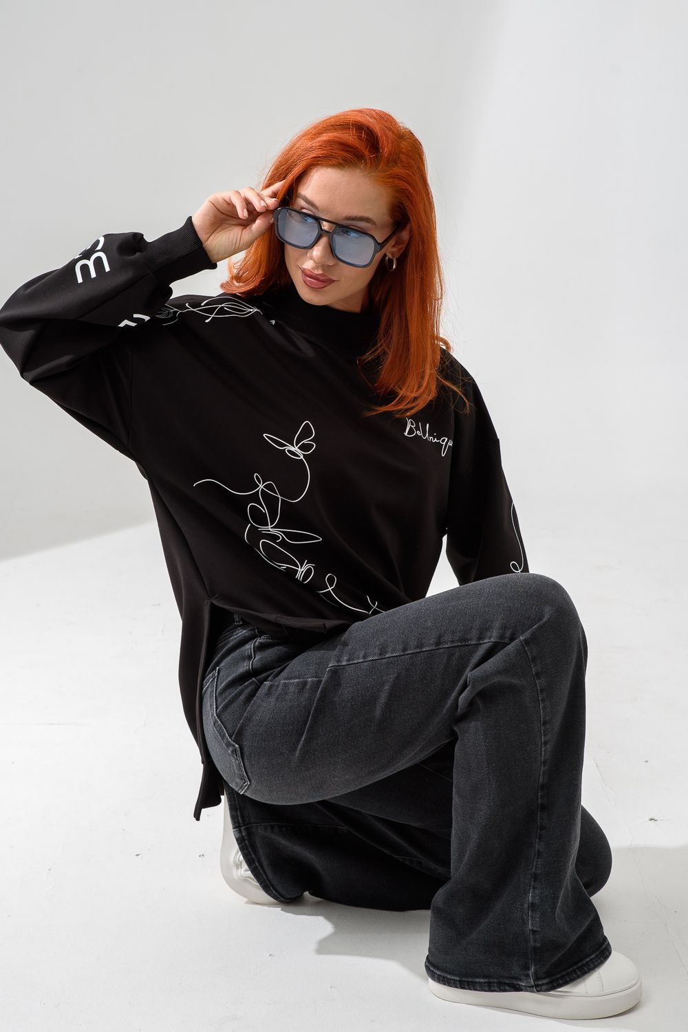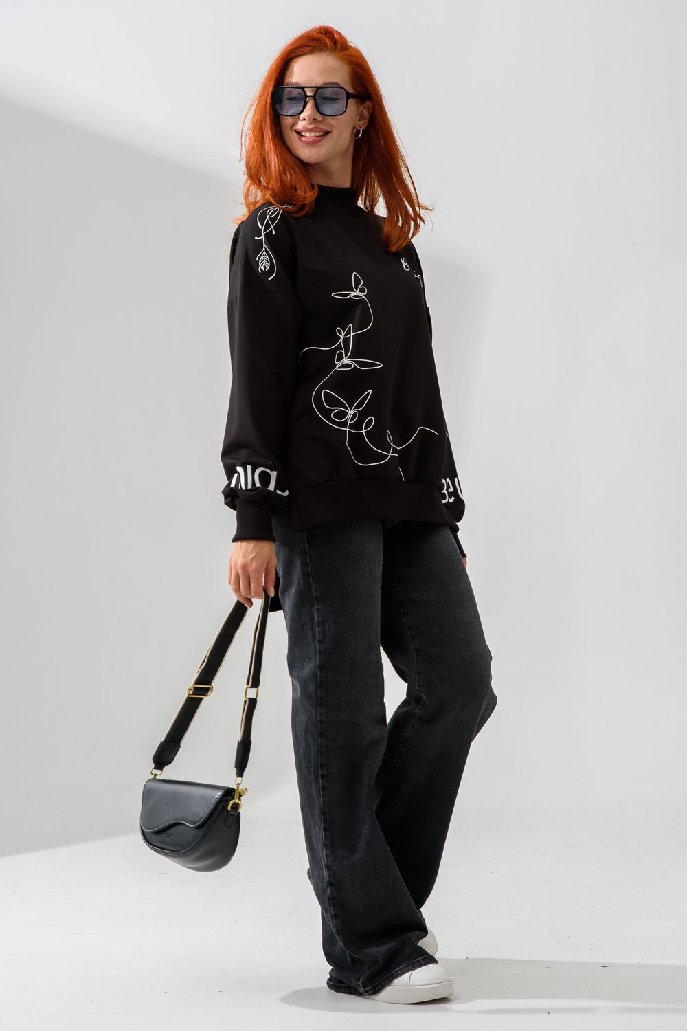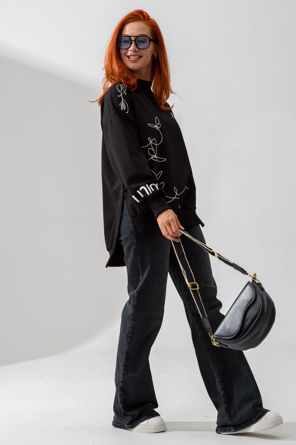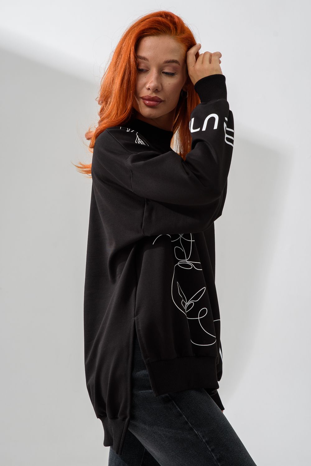 Женский свитшот оверсайз в универсальном черном цвете! Эта модная удлиненная толстовка не просто согреет вас в прохладную погоду, но и подчеркнет вашу индивидуальность благодаря уникальному дизайну и вдохновляющей надписи. На груди расположена стильная надпись "Be Unique" (Будь уникальной), которая вдохновляет и добавляет изделию индивидуальности. По рукавам и по бокам свитшот украшен минималистичным линейным рисунком в виде изящных бабочек и абстрактных линий. Свитшот с высокой горловиной (или воротником-стойкой) обеспечивает дополнительную защиту от ветра и холода. .Модный удлиненный силуэт с элегантными боковыми разрезами по низу делает свитшот более динамичным и позволяет носить его как навыпуск, так и частично заправленным. Разрезы также добавляют свободы движений. Теплый свитшот отлично пропускает воздух, сохраняет форму после стирок и обеспечивает комфорт в течение всего дня
