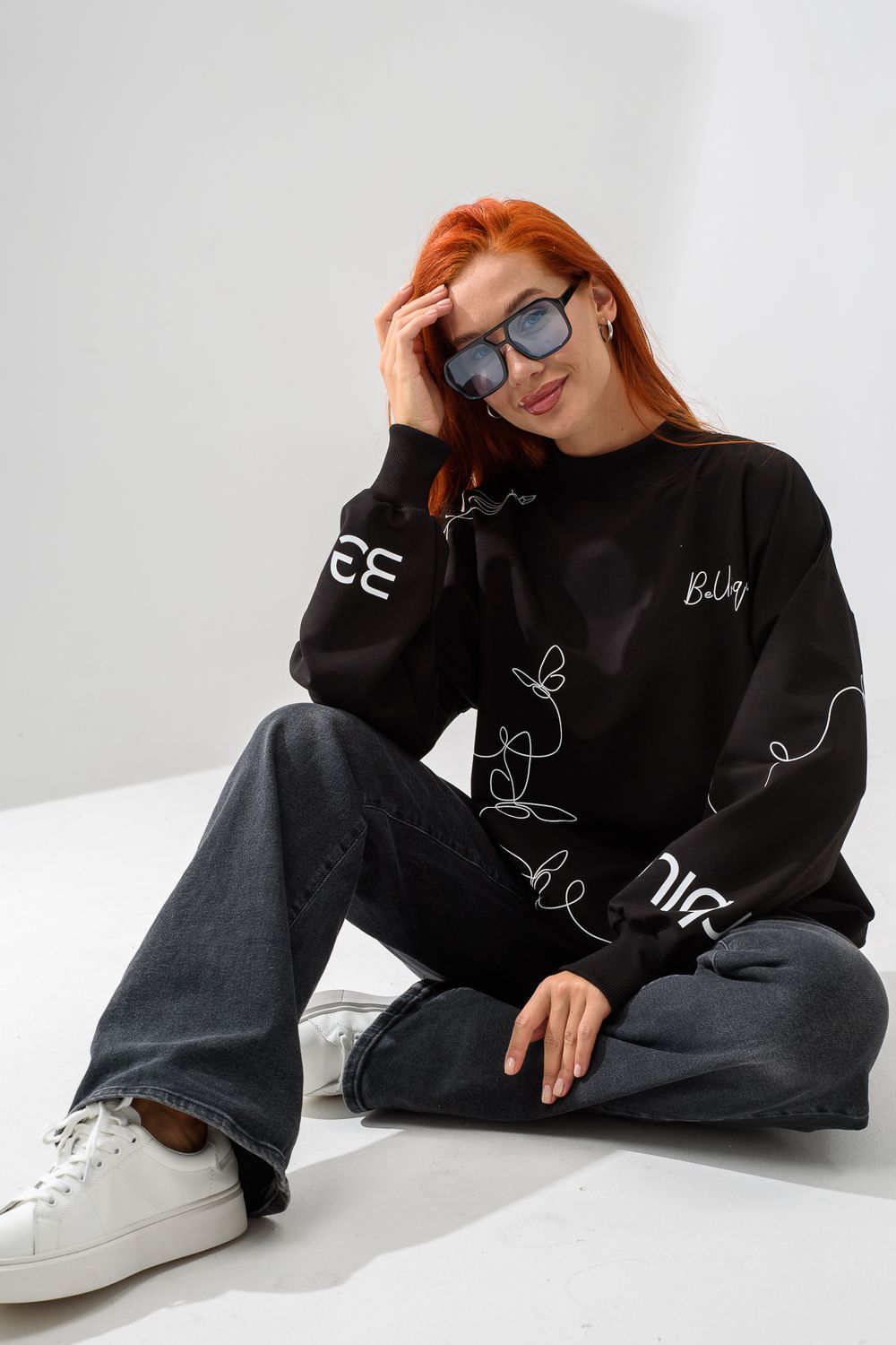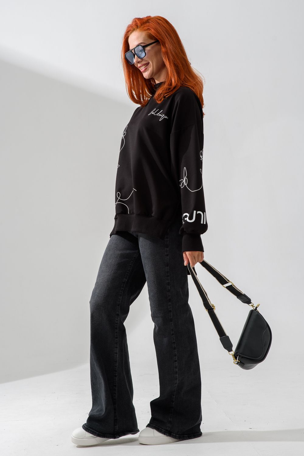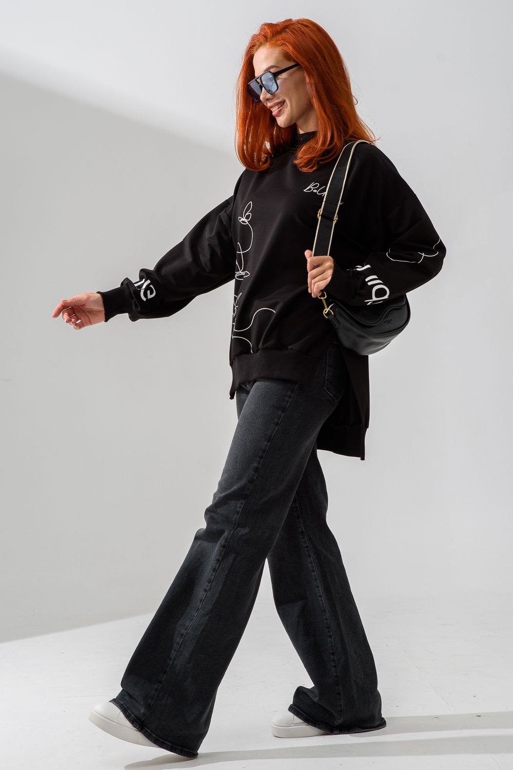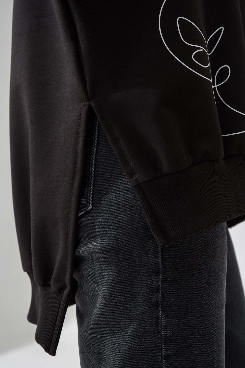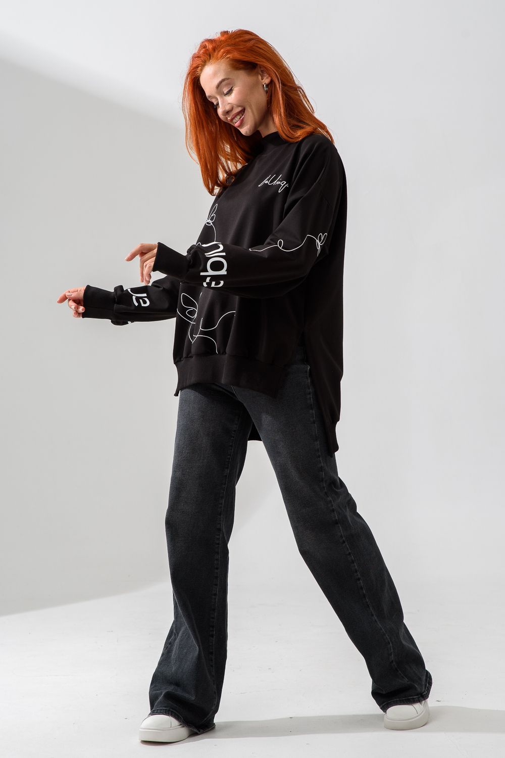 Женский свитшот оверсайз в универсальном черном цвете! Эта модная удлиненная толстовка не просто согреет вас в прохладную погоду, но и подчеркнет вашу индивидуальность благодаря уникальному дизайну и вдохновляющей надписи. На груди расположена стильная надпись "Be Unique" (Будь уникальной), которая вдохновляет и добавляет изделию индивидуальности. По рукавам и по бокам свитшот украшен минималистичным линейным рисунком в виде изящных бабочек и абстрактных линий. Свитшот с высокой горловиной (или воротником-стойкой) обеспечивает дополнительную защиту от ветра и холода. .Модный удлиненный силуэт с элегантными боковыми разрезами по низу делает свитшот более динамичным и позволяет носить его как навыпуск, так и частично заправленным. Разрезы также добавляют свободы движений. Теплый свитшот отлично пропускает воздух, сохраняет форму после стирок и обеспечивает комфорт в течение всего дня