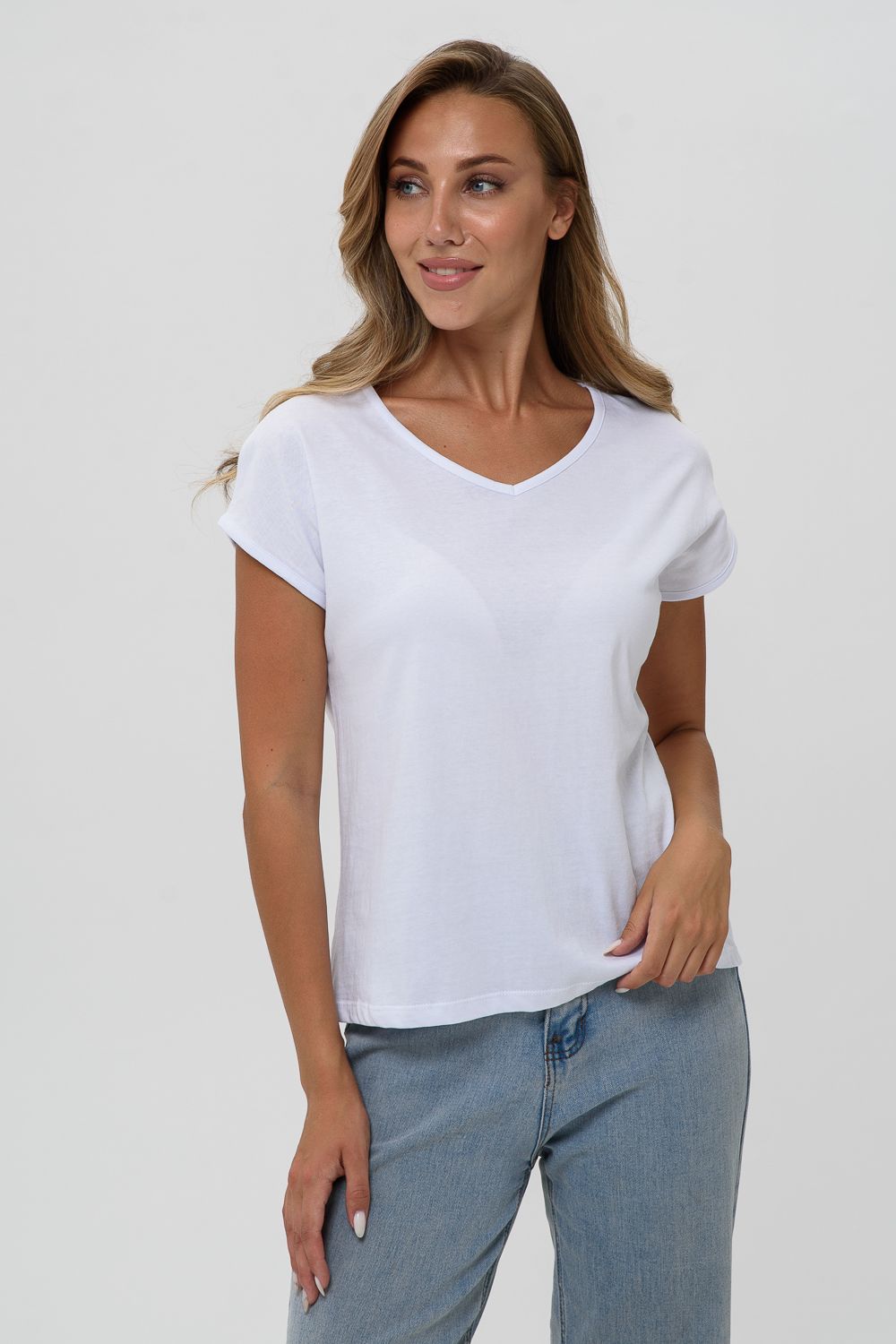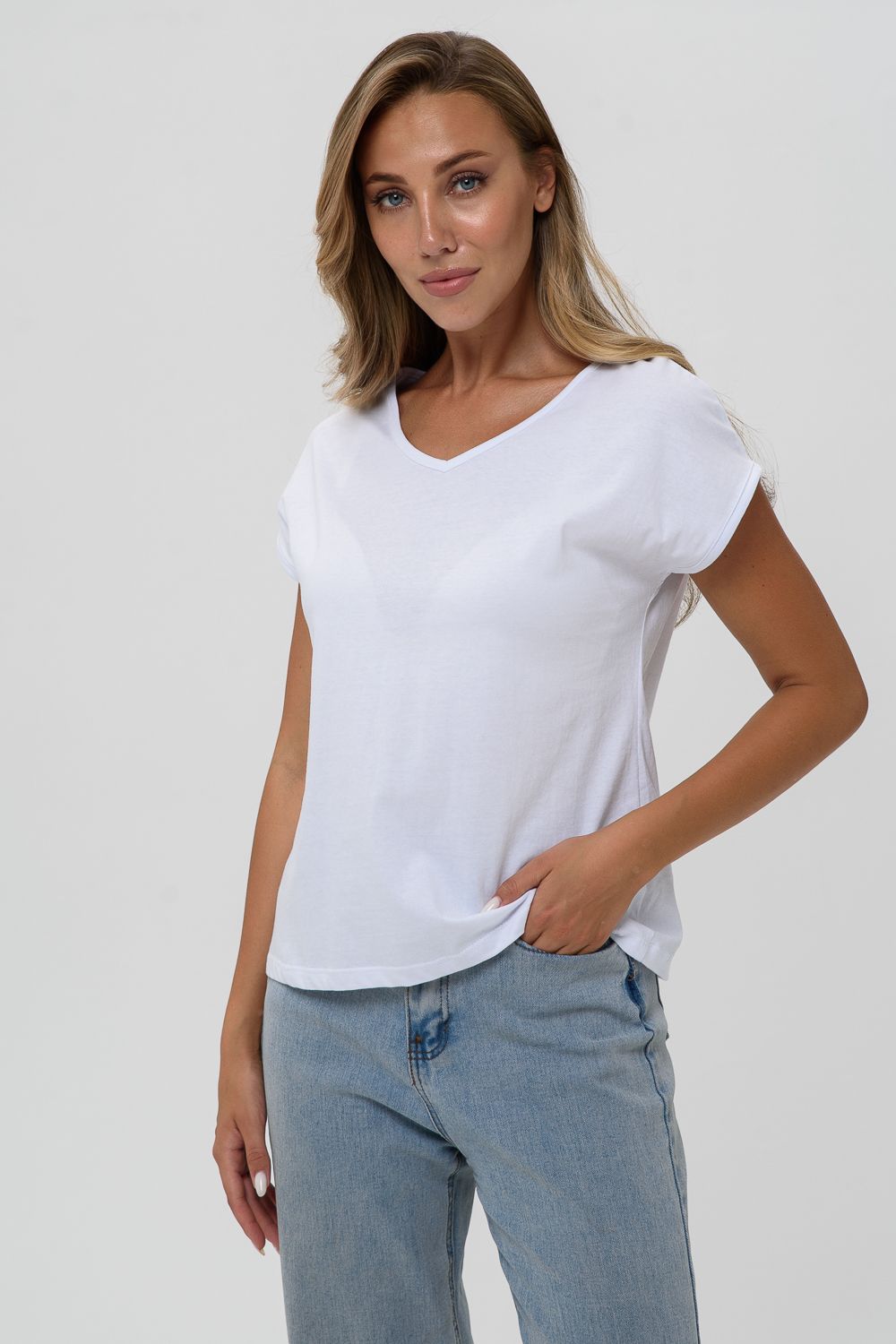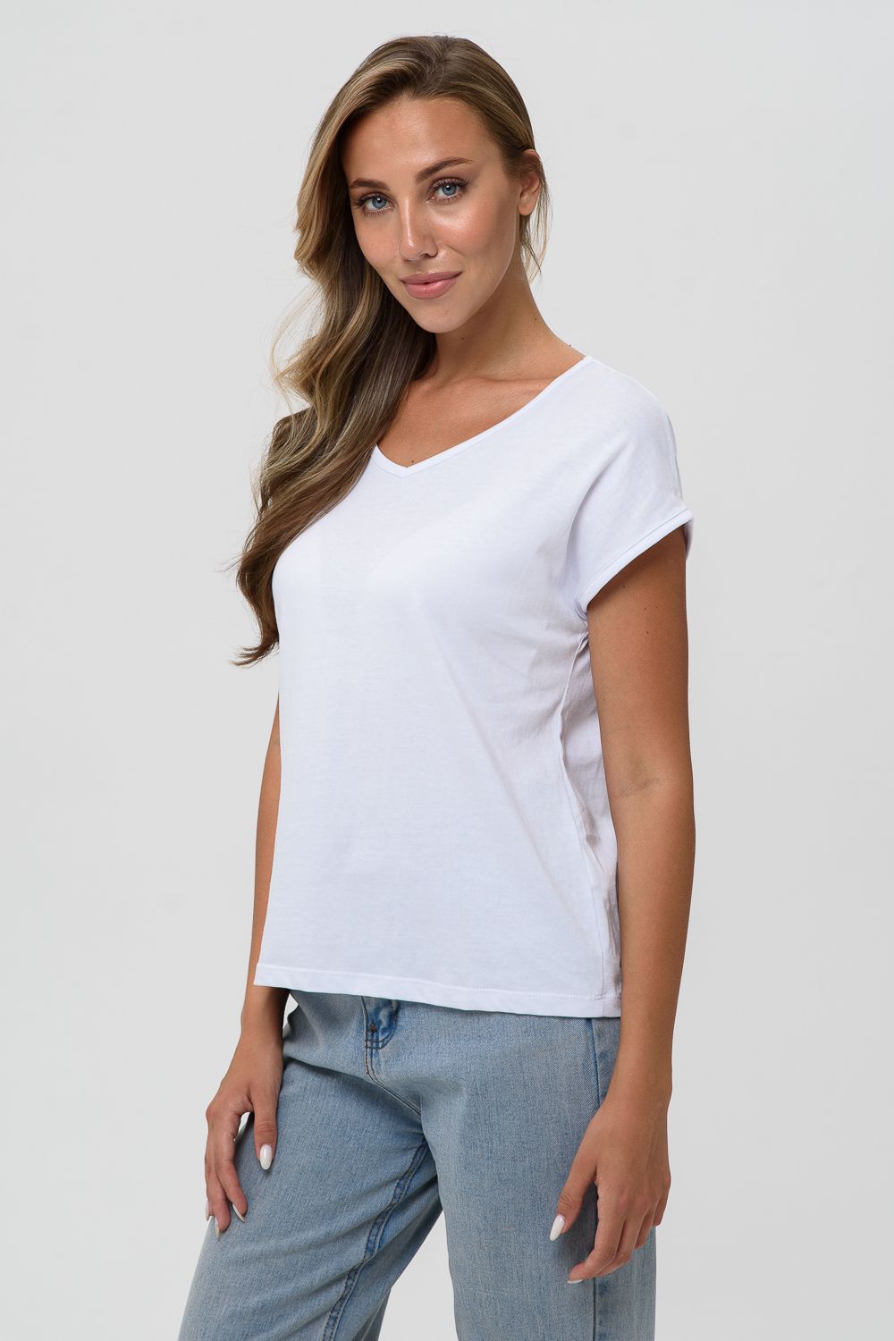 Футболка полуприлегающего силуэта, средней длины, с V-образной горловиной. Рукав цельнокроеный, короткий. Горловина и пройма обработаны бейкой из основного полотна.