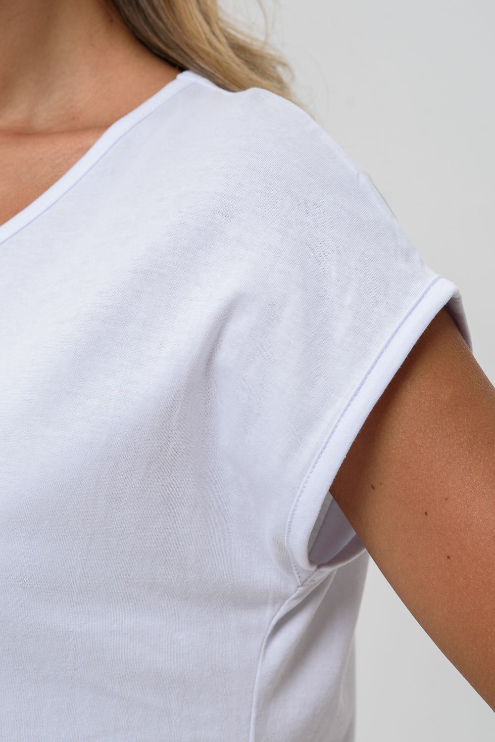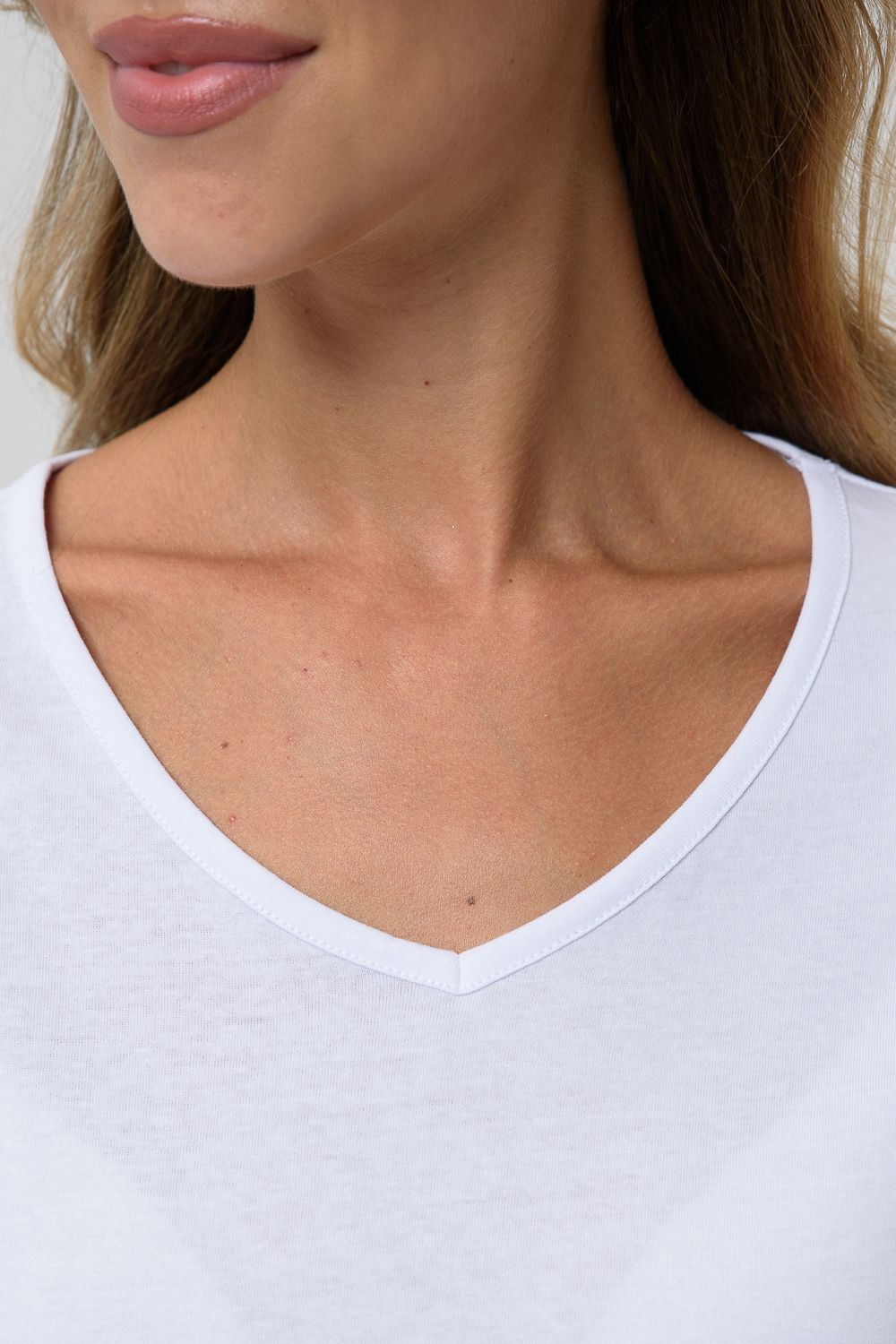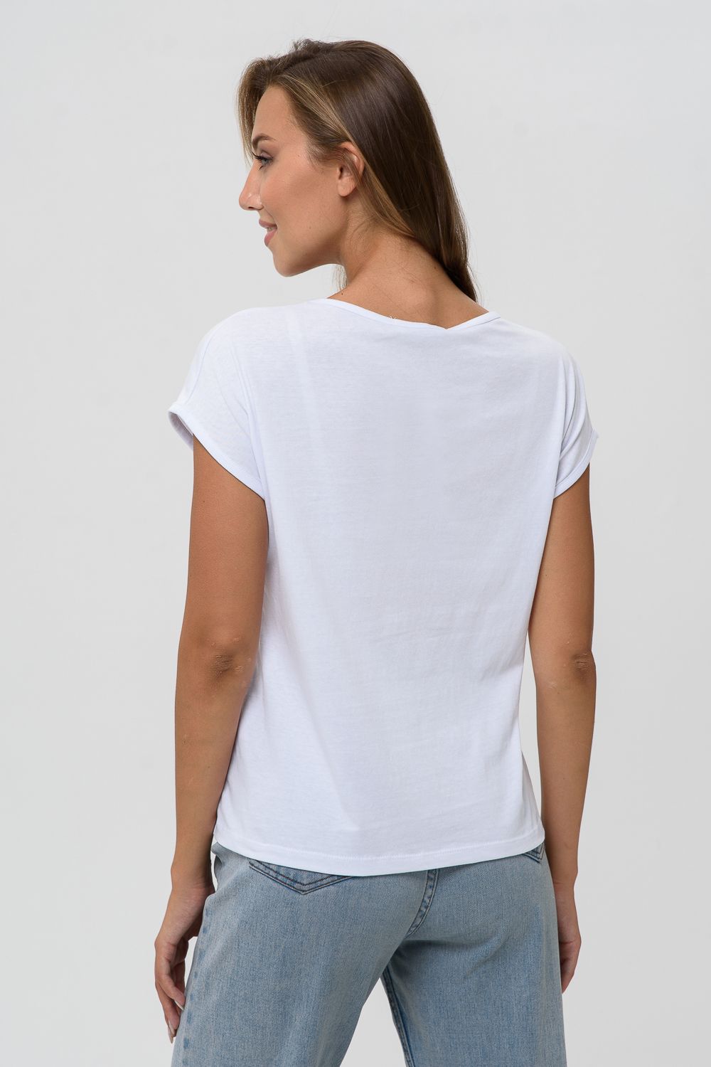 Футболка полуприлегающего силуэта, средней длины, с V-образной горловиной. Рукав цельнокроеный, короткий. Горловина и пройма обработаны бейкой из основного полотна.
