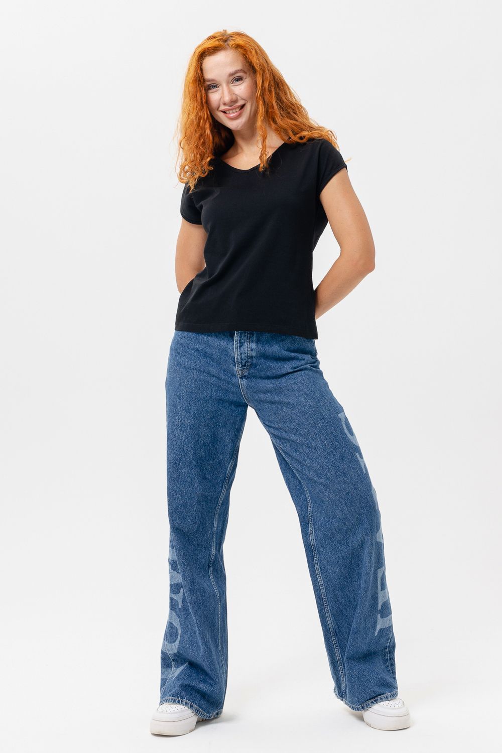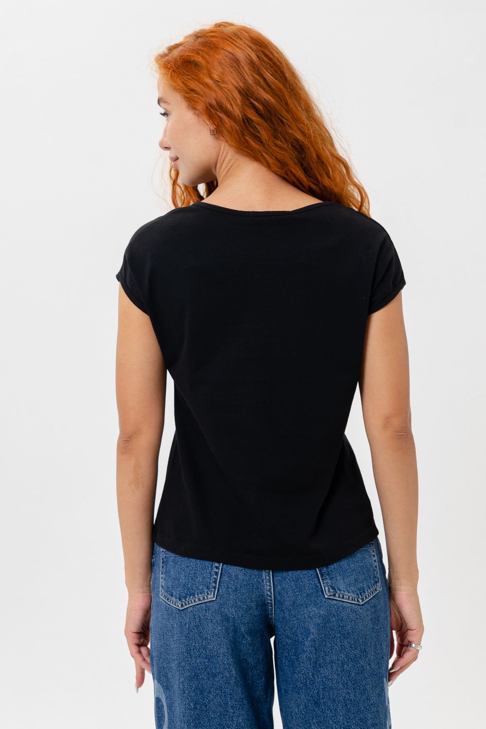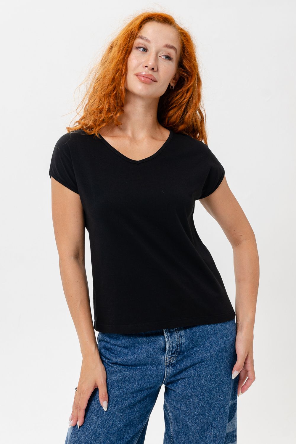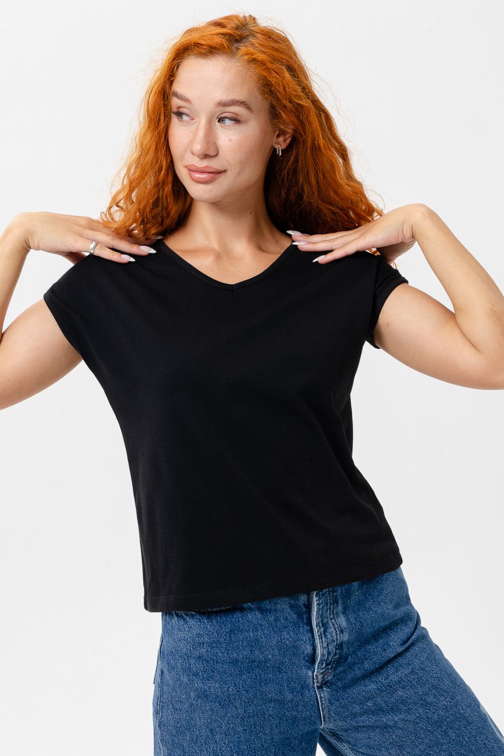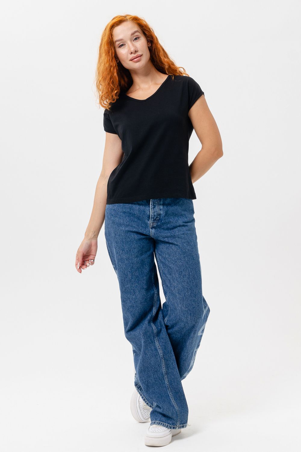 Футболка полуприлегающего силуэта, средней длины, с V-образной горловиной. Рукав цельнокроеный, короткий. Горловина и пройма обработаны бейкой из основного полотна.
