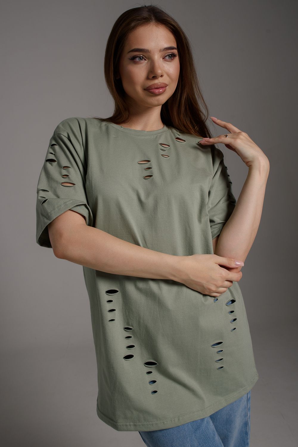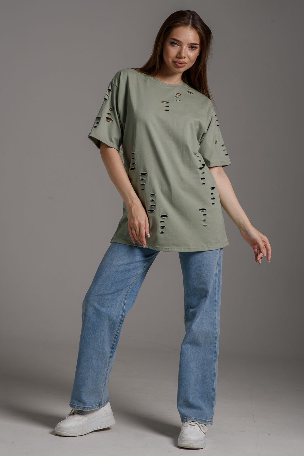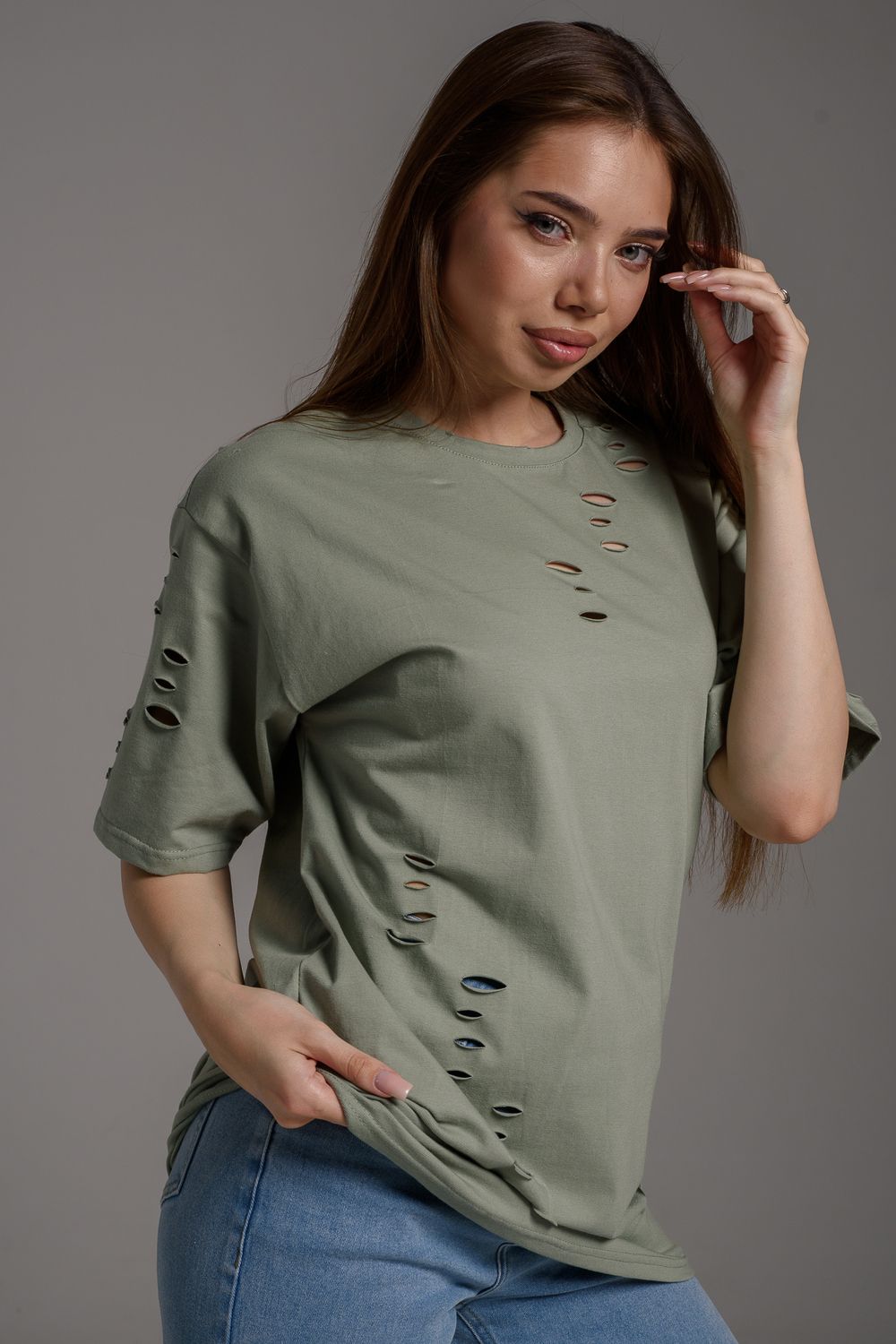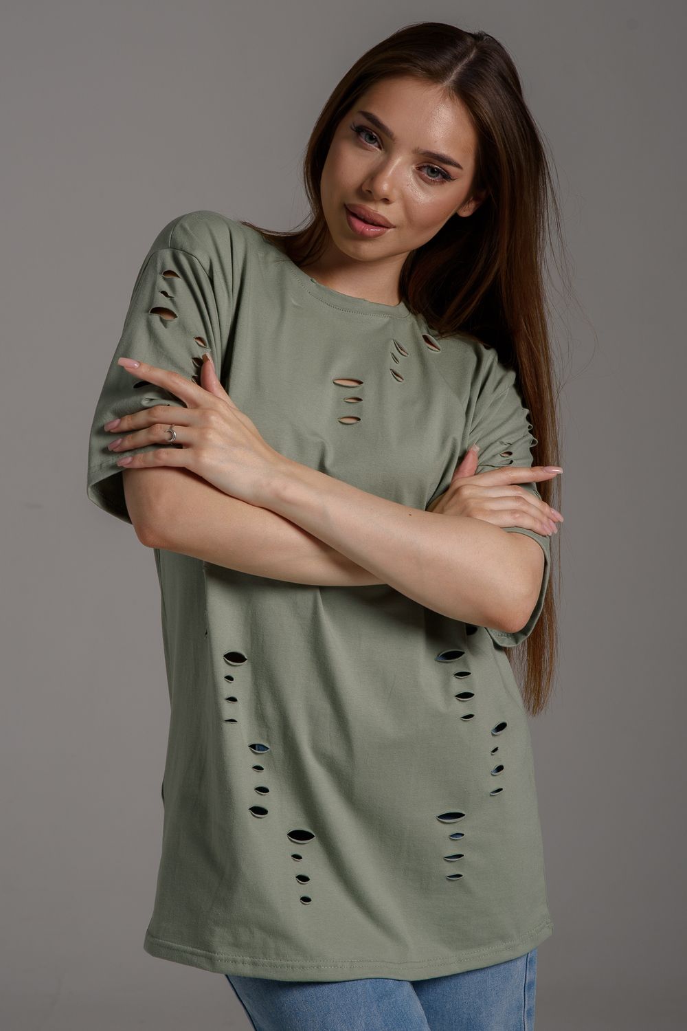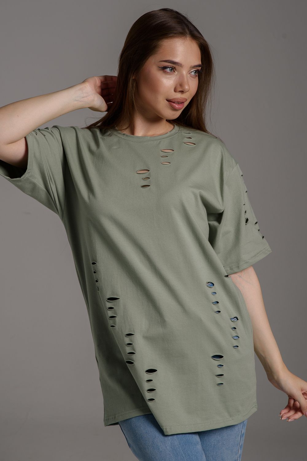Красивая и необычная хлопковая футболка дополнена оригинальными разрезами. Натуральный состав трикотажа позволяет коже дышать и подарит ощущение комфорта. Идеальный выбор для создания модных и ярких образов!