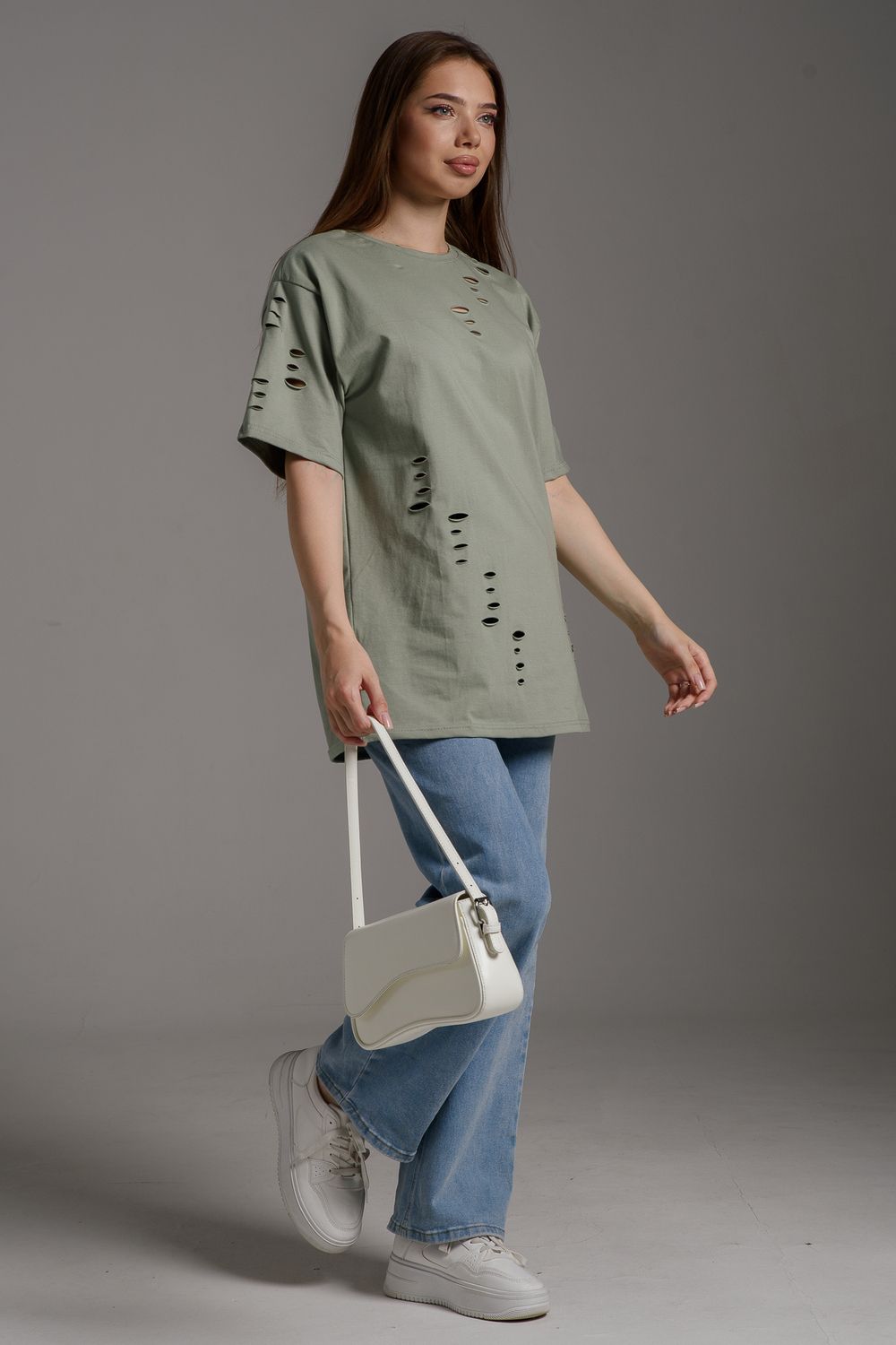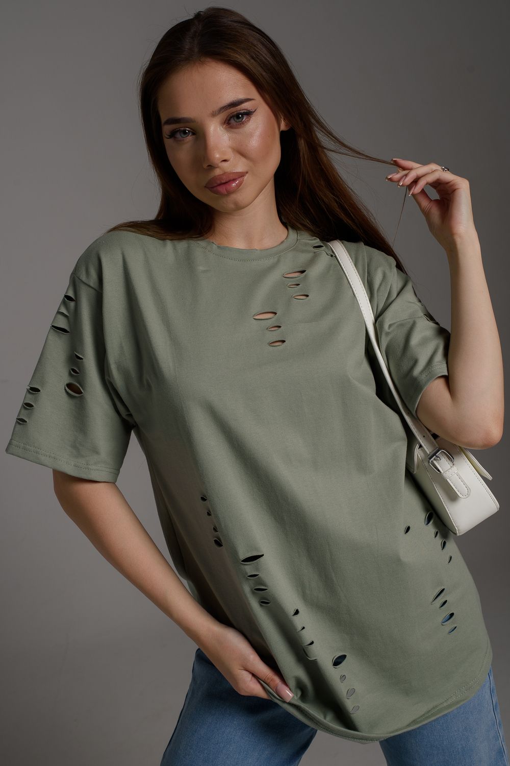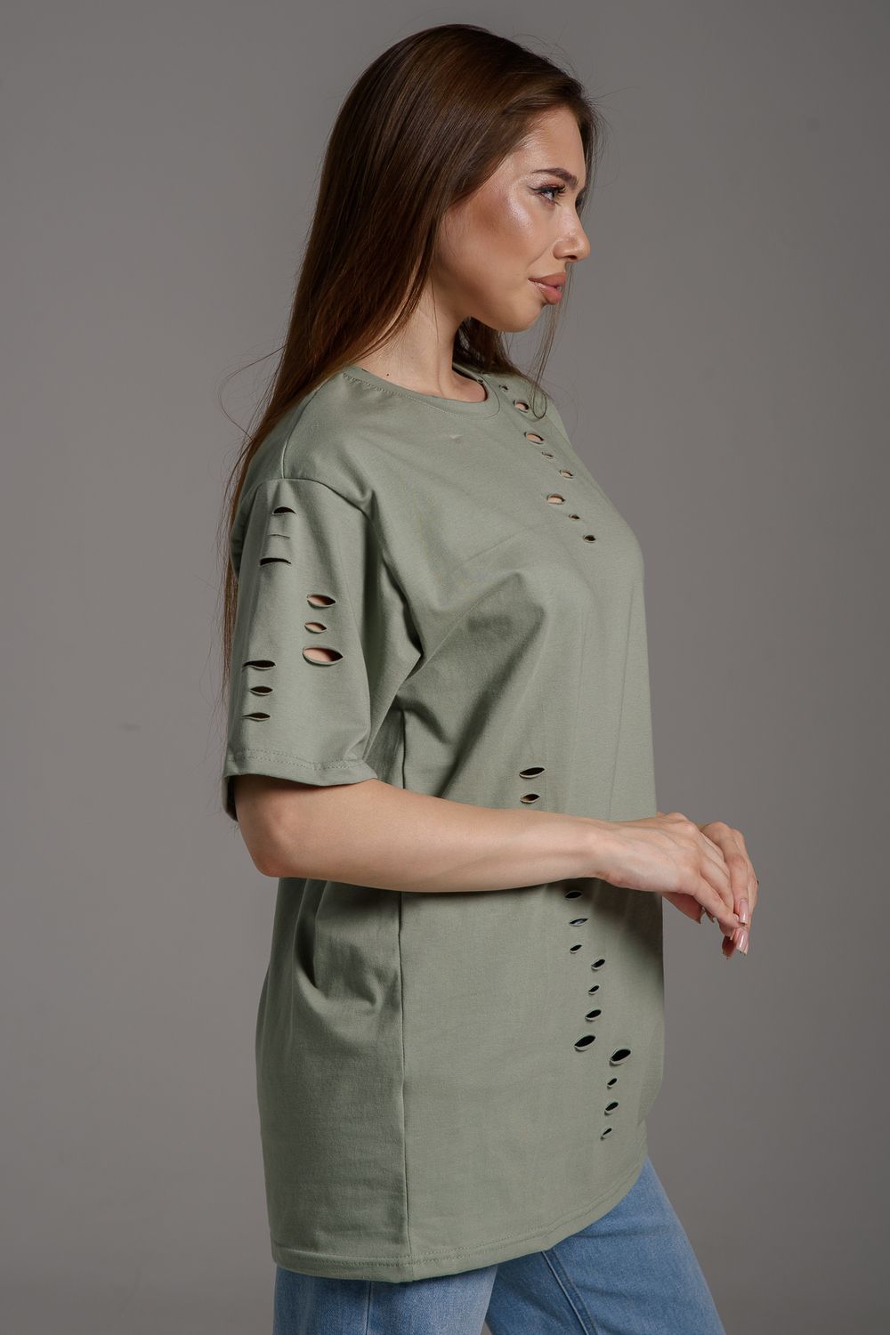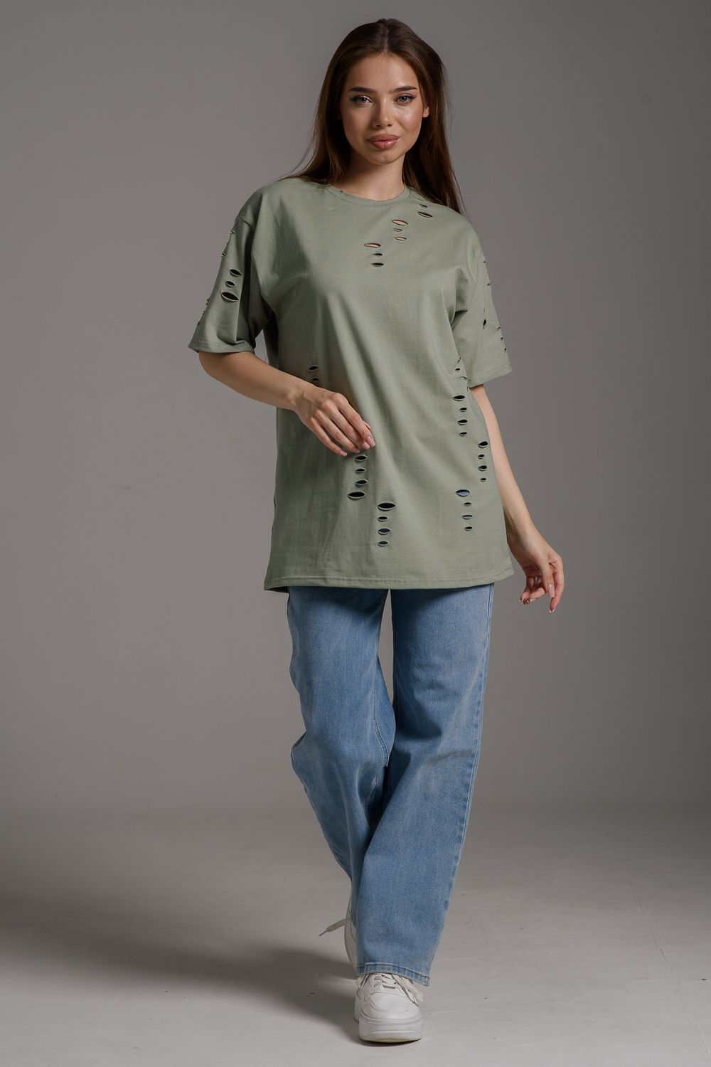 Красивая и необычная хлопковая футболка дополнена оригинальными разрезами. Натуральный состав трикотажа позволяет коже дышать и подарит ощущение комфорта. Идеальный выбор для создания модных и ярких образов!