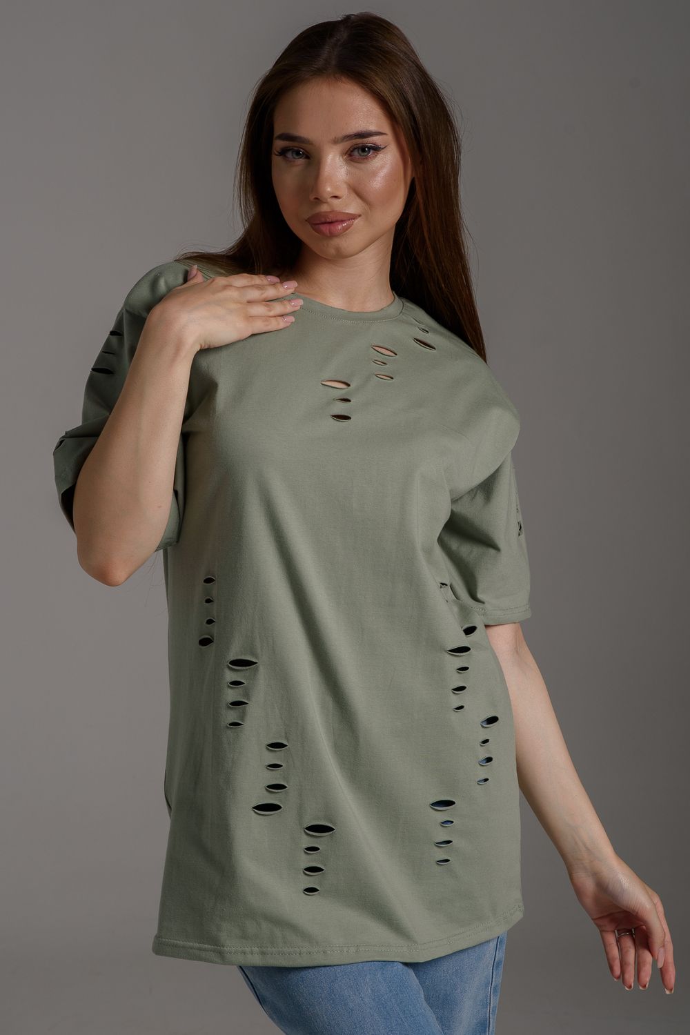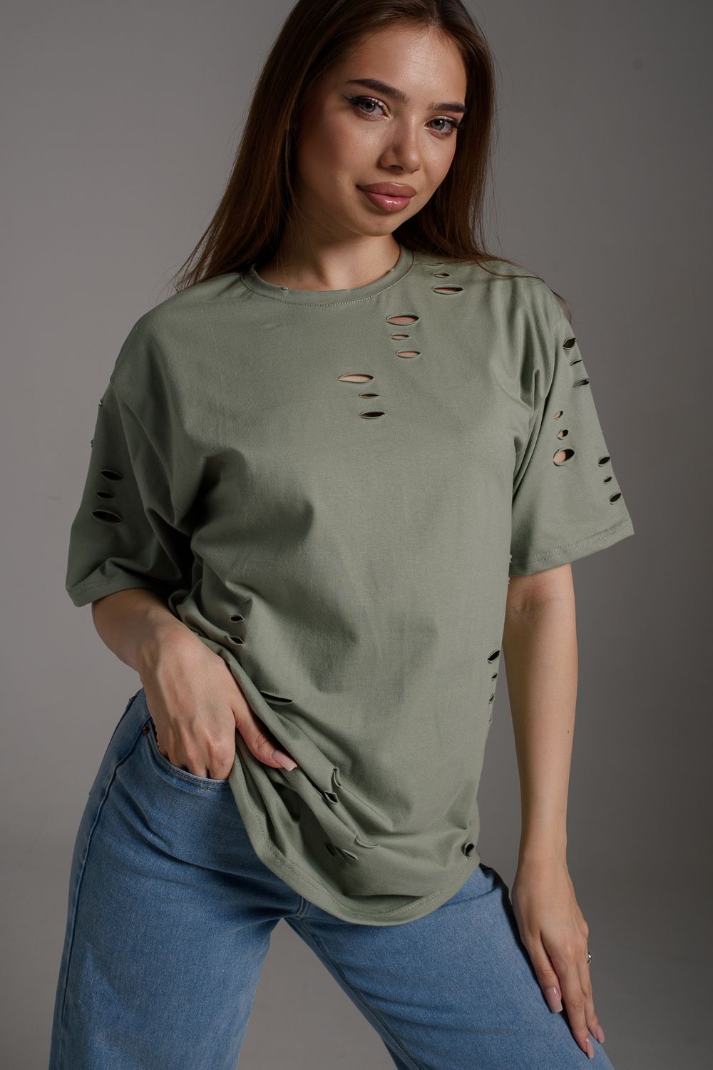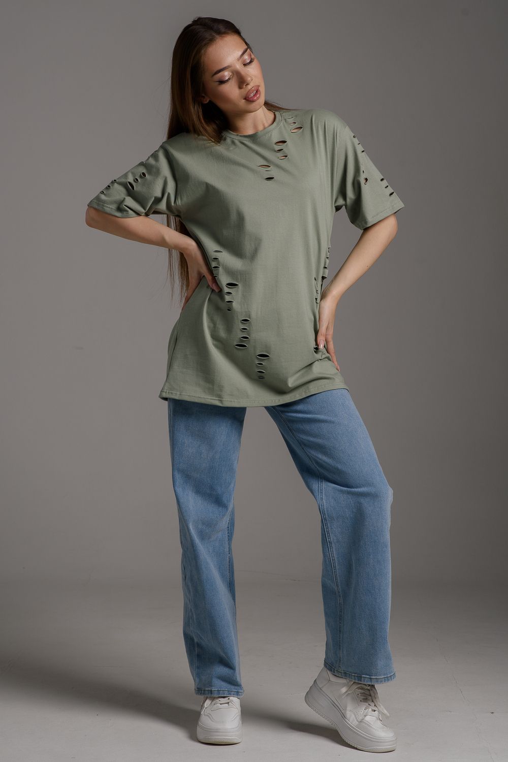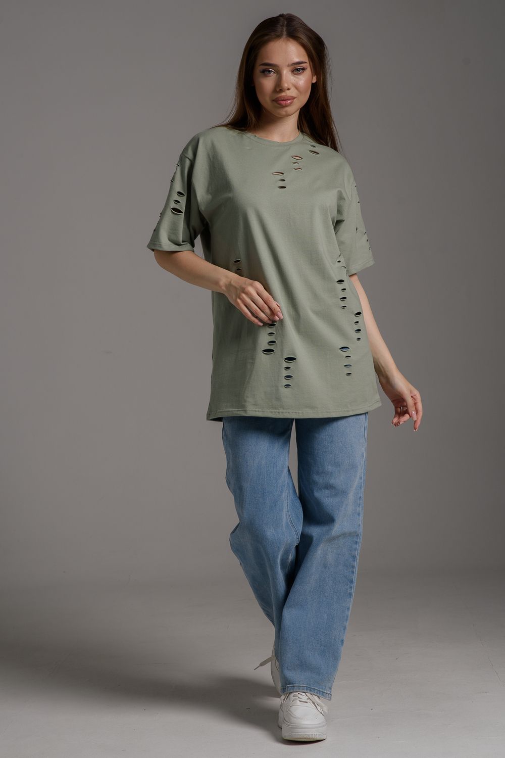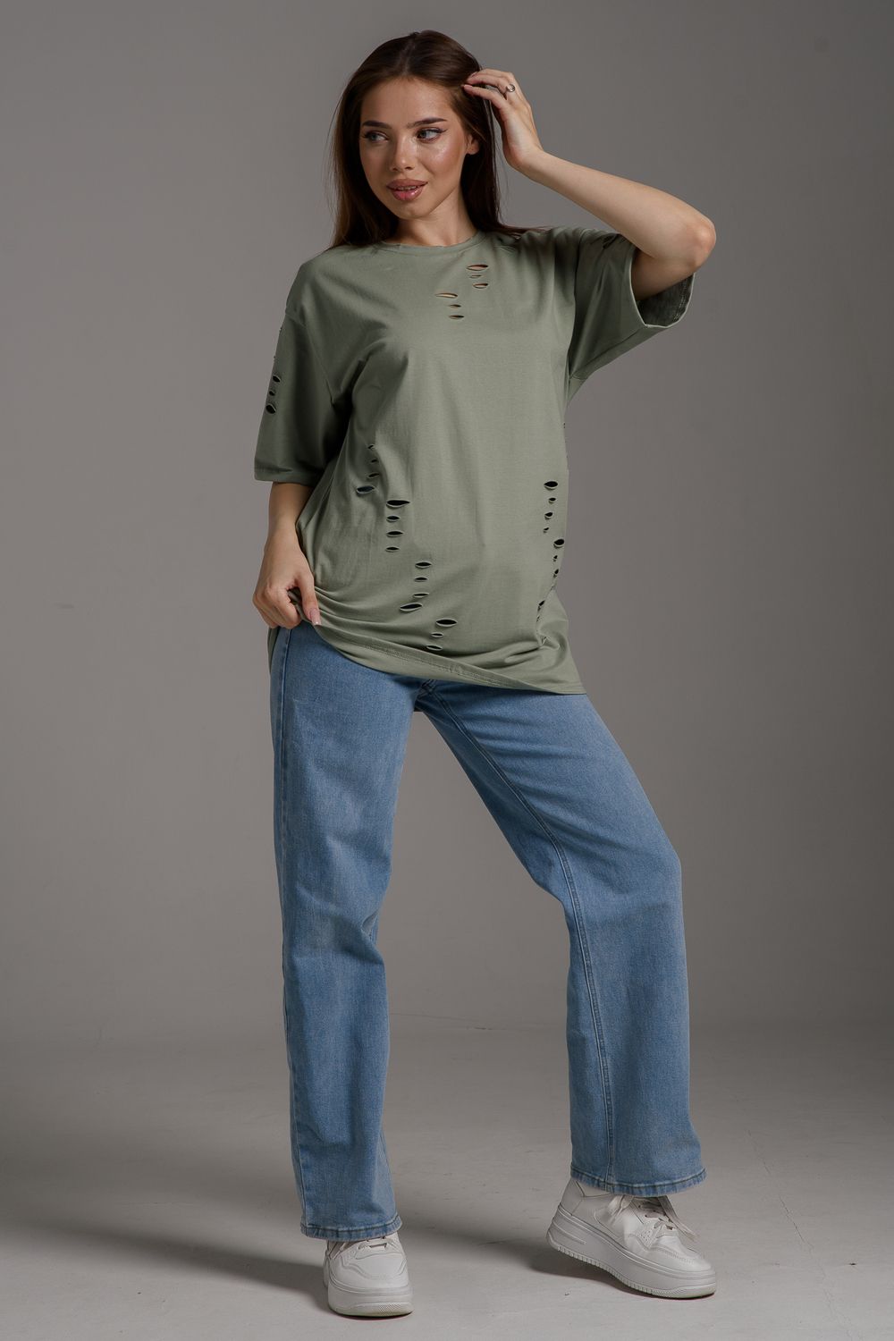 Красивая и необычная хлопковая футболка дополнена оригинальными разрезами. Натуральный состав трикотажа позволяет коже дышать и подарит ощущение комфорта. Идеальный выбор для создания модных и ярких образов!
