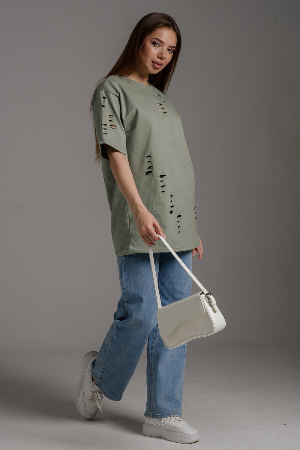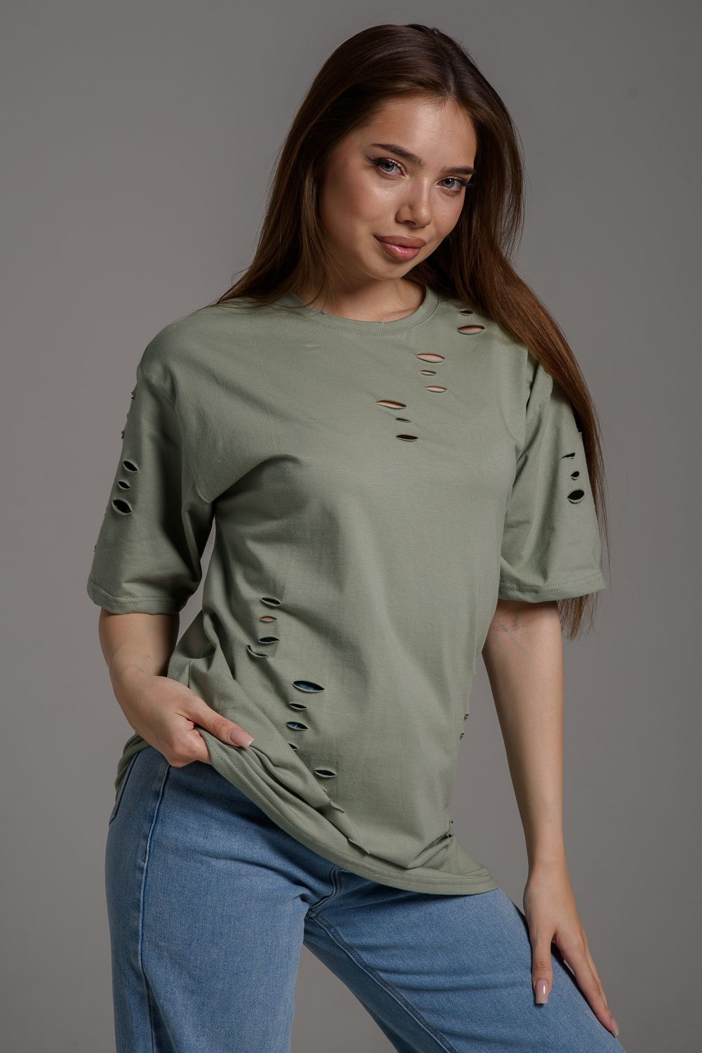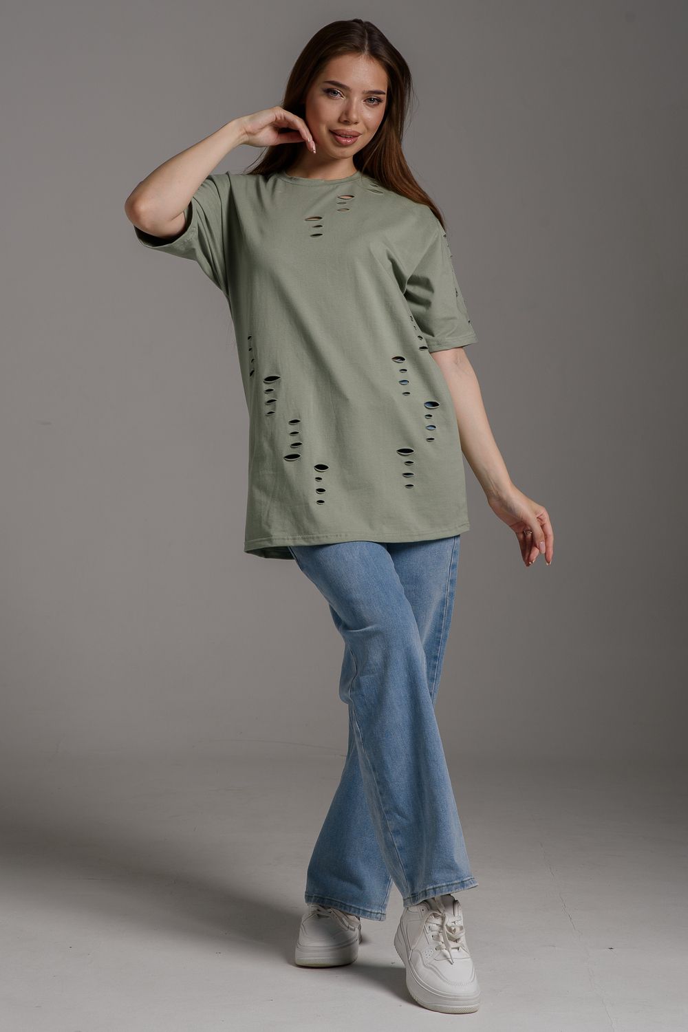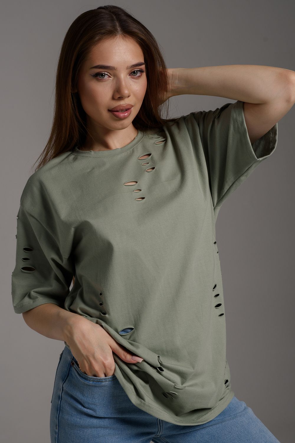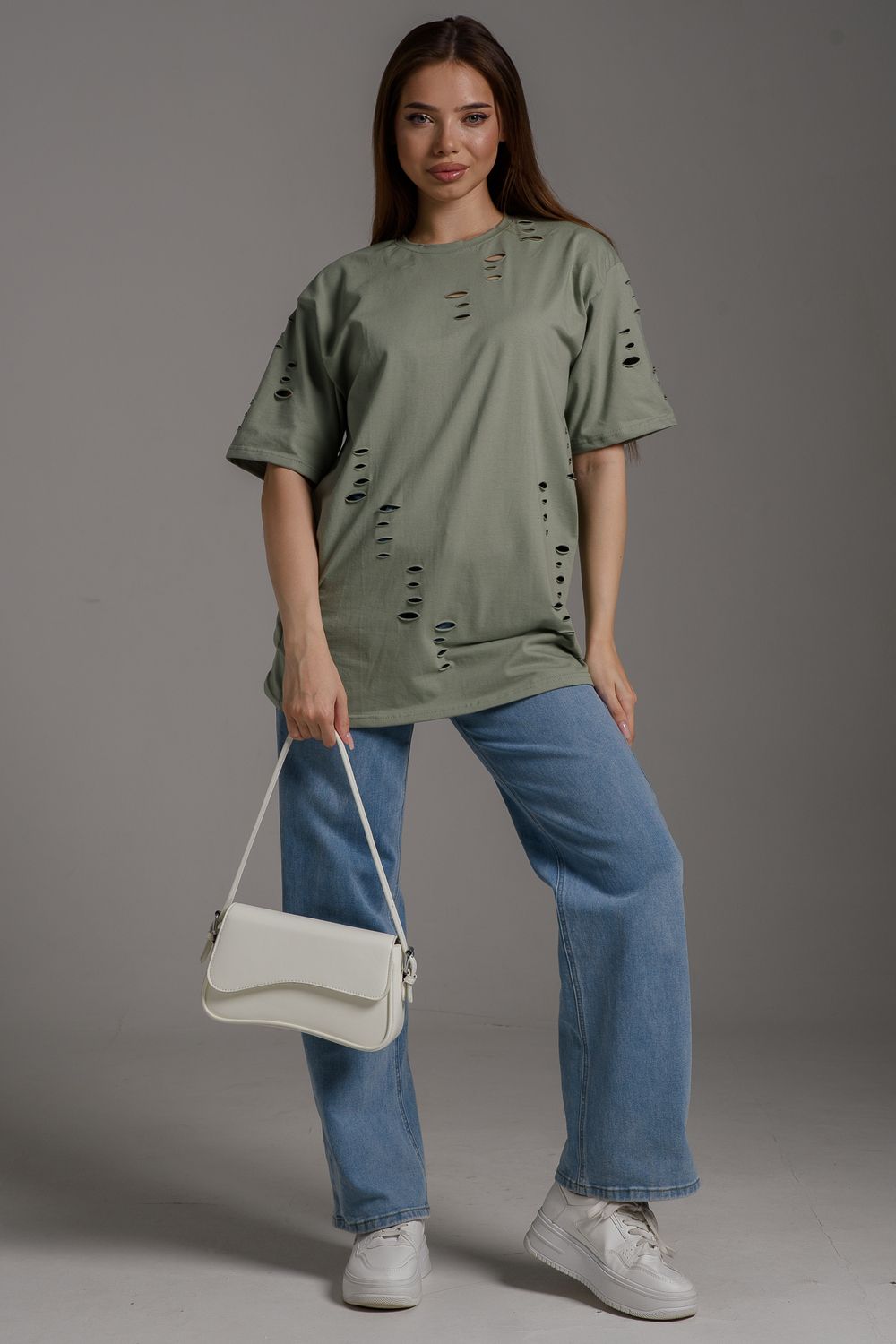 Красивая и необычная хлопковая футболка дополнена оригинальными разрезами. Натуральный состав трикотажа позволяет коже дышать и подарит ощущение комфорта. Идеальный выбор для создания модных и ярких образов!
