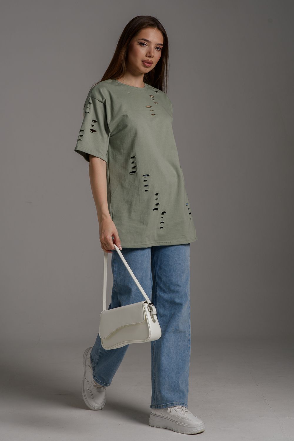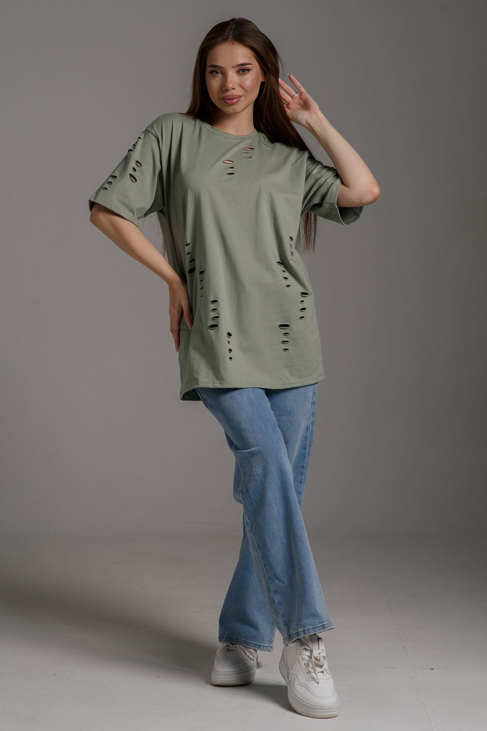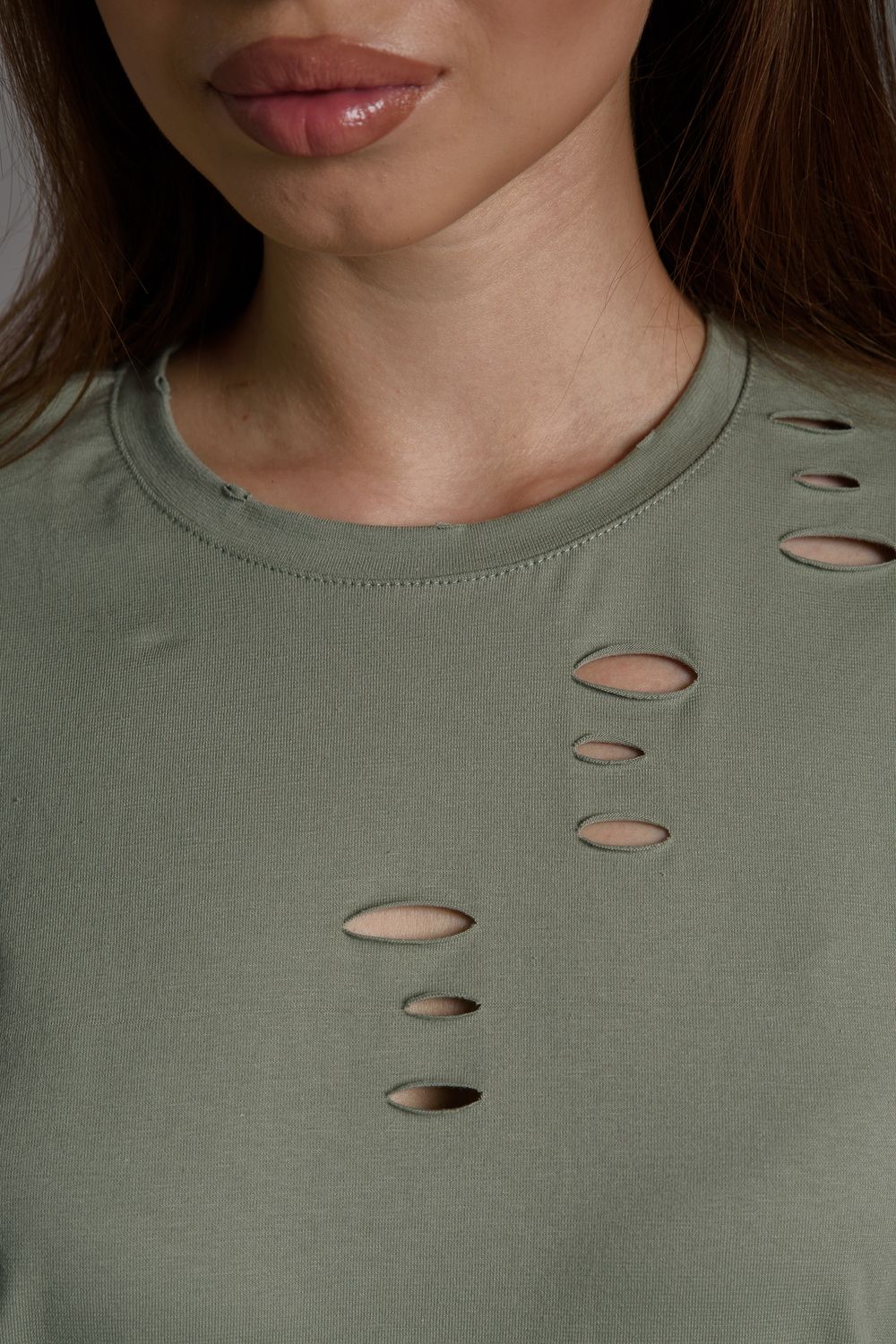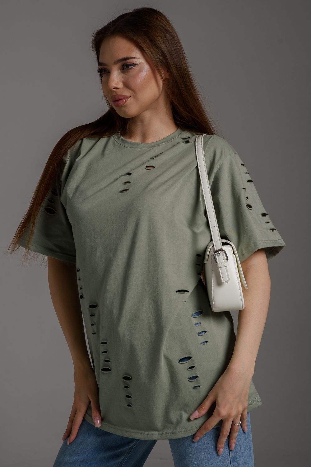Красивая и необычная хлопковая футболка дополнена оригинальными разрезами. Натуральный состав трикотажа позволяет коже дышать и подарит ощущение комфорта. Идеальный выбор для создания модных и ярких образов!