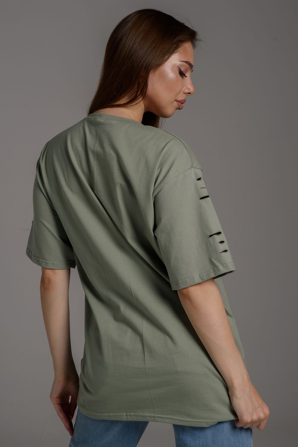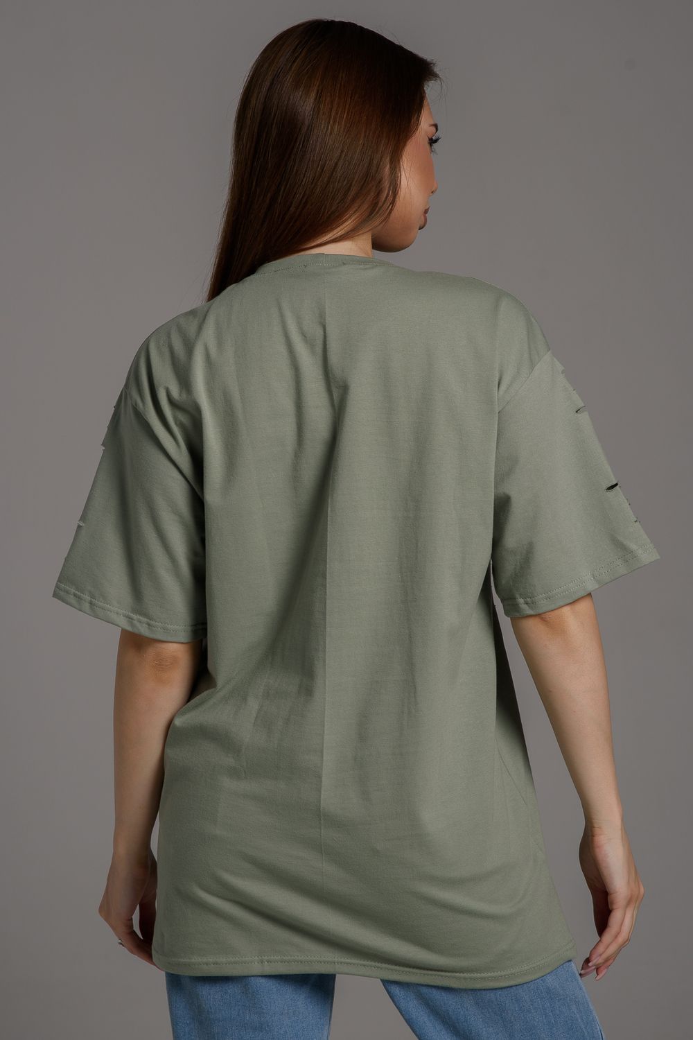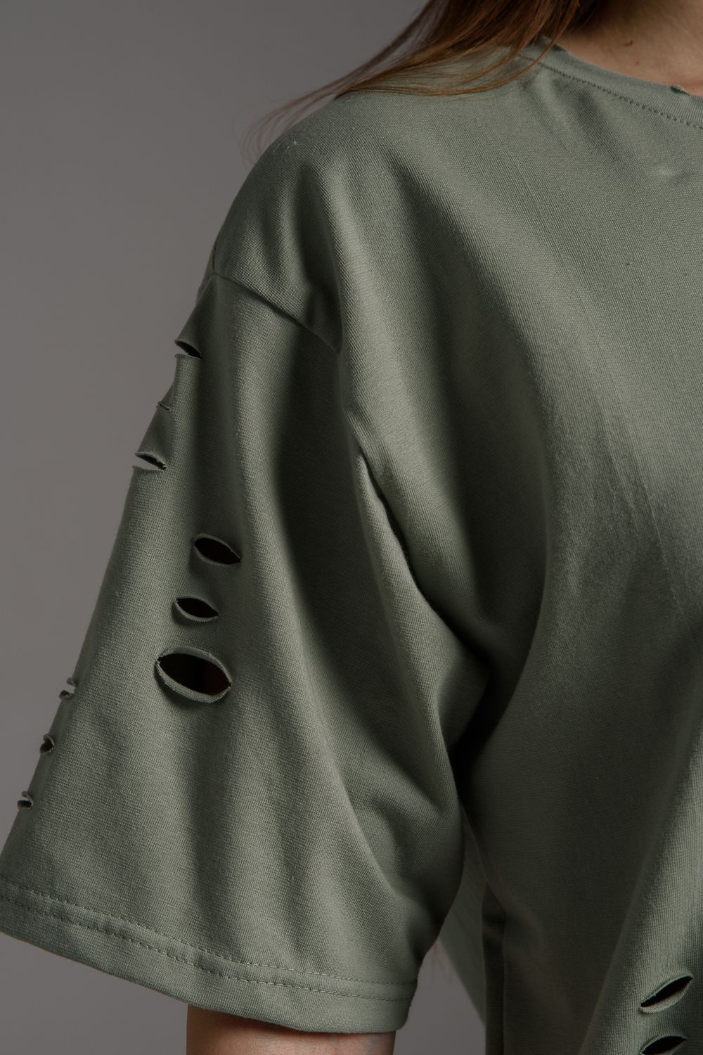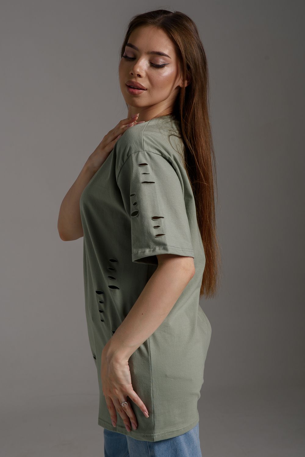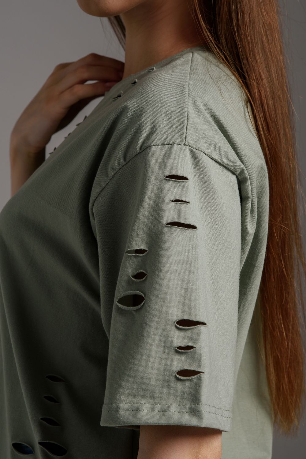 Красивая и необычная хлопковая футболка дополнена оригинальными разрезами. Натуральный состав трикотажа позволяет коже дышать и подарит ощущение комфорта. Идеальный выбор для создания модных и ярких образов!