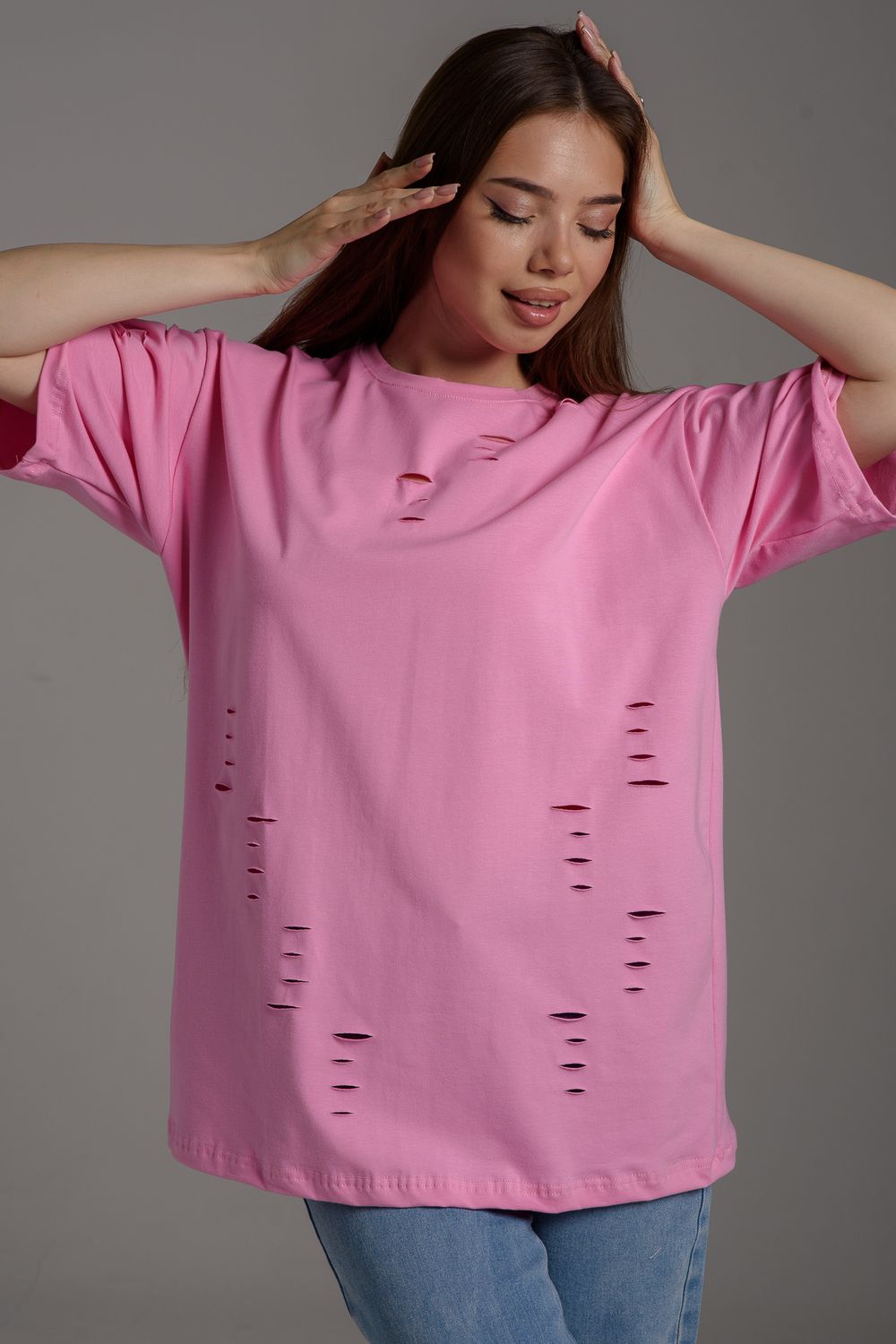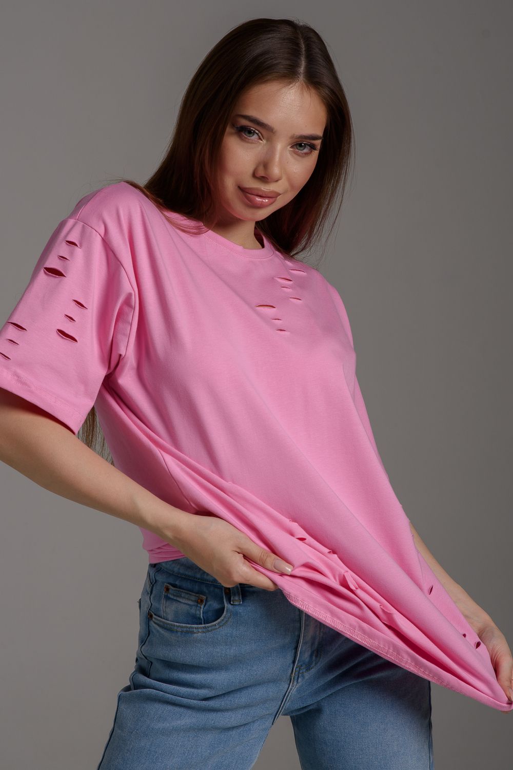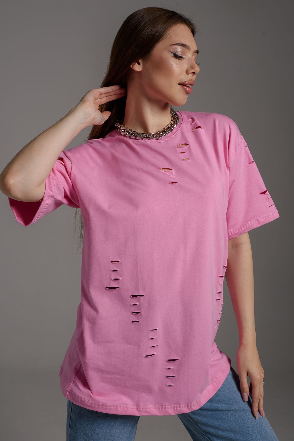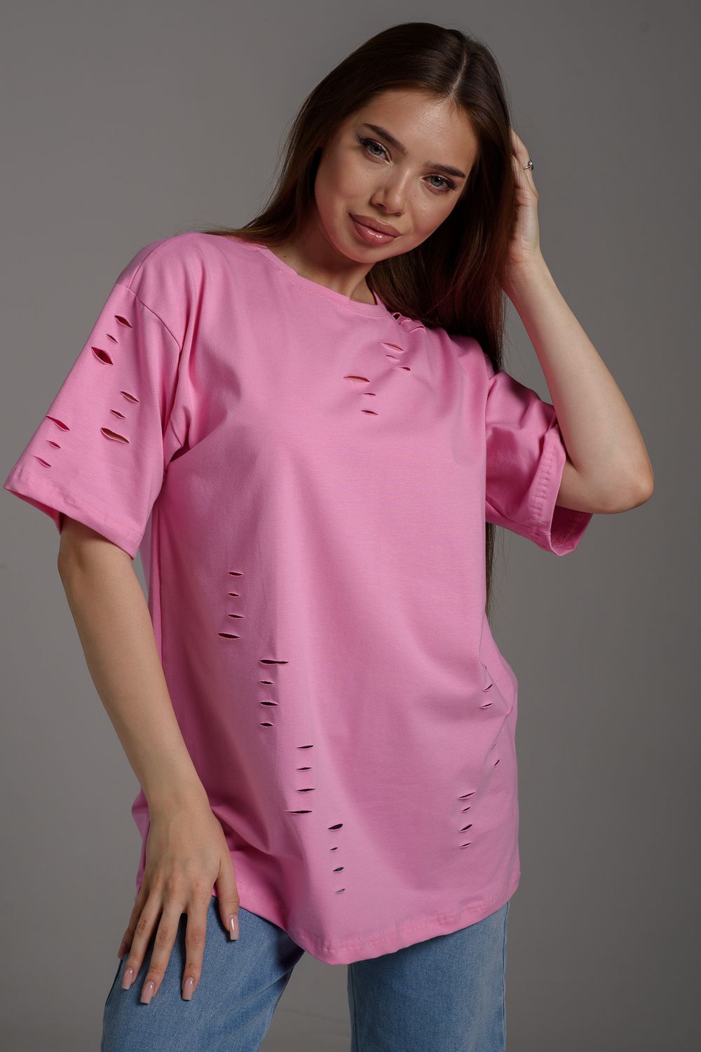 Красивая и необычная хлопковая футболка дополнена оригинальными разрезами. Натуральный состав трикотажа позволяет коже дышать и подарит ощущение комфорта. Идеальный выбор для создания модных и ярких образов!