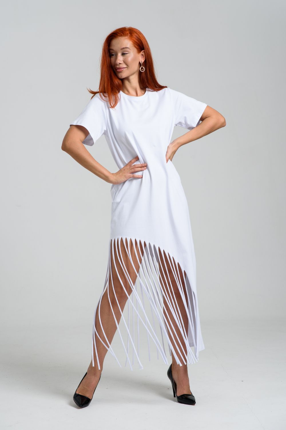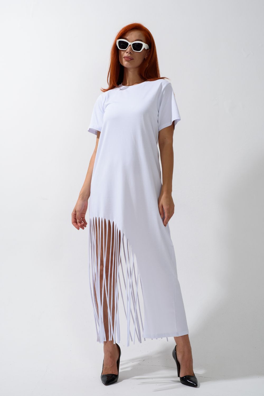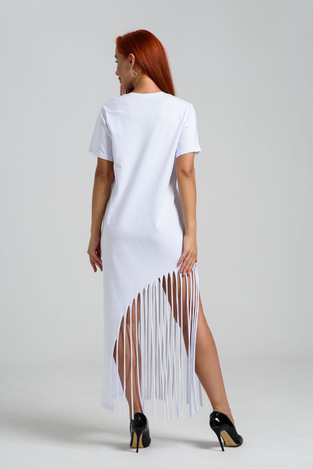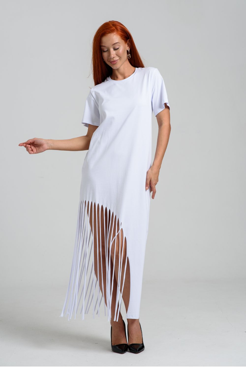 Женское платье ассиметричного кроя с бахромой по низу. Одним из самых популярных элементов летнего гардероба является летнее трикотажное платье. Благодаря легкой ткани и свободному крою обеспечивает комфорт и свободу движений. Плате с бахромой - прекрасный вариант для пляжного отдыха.