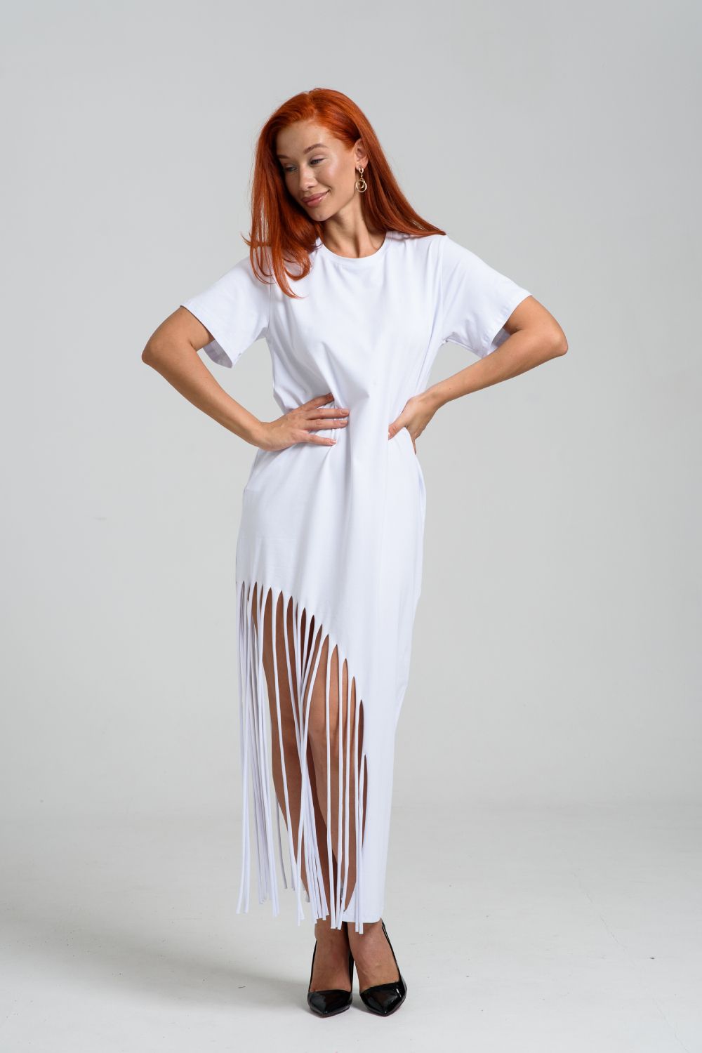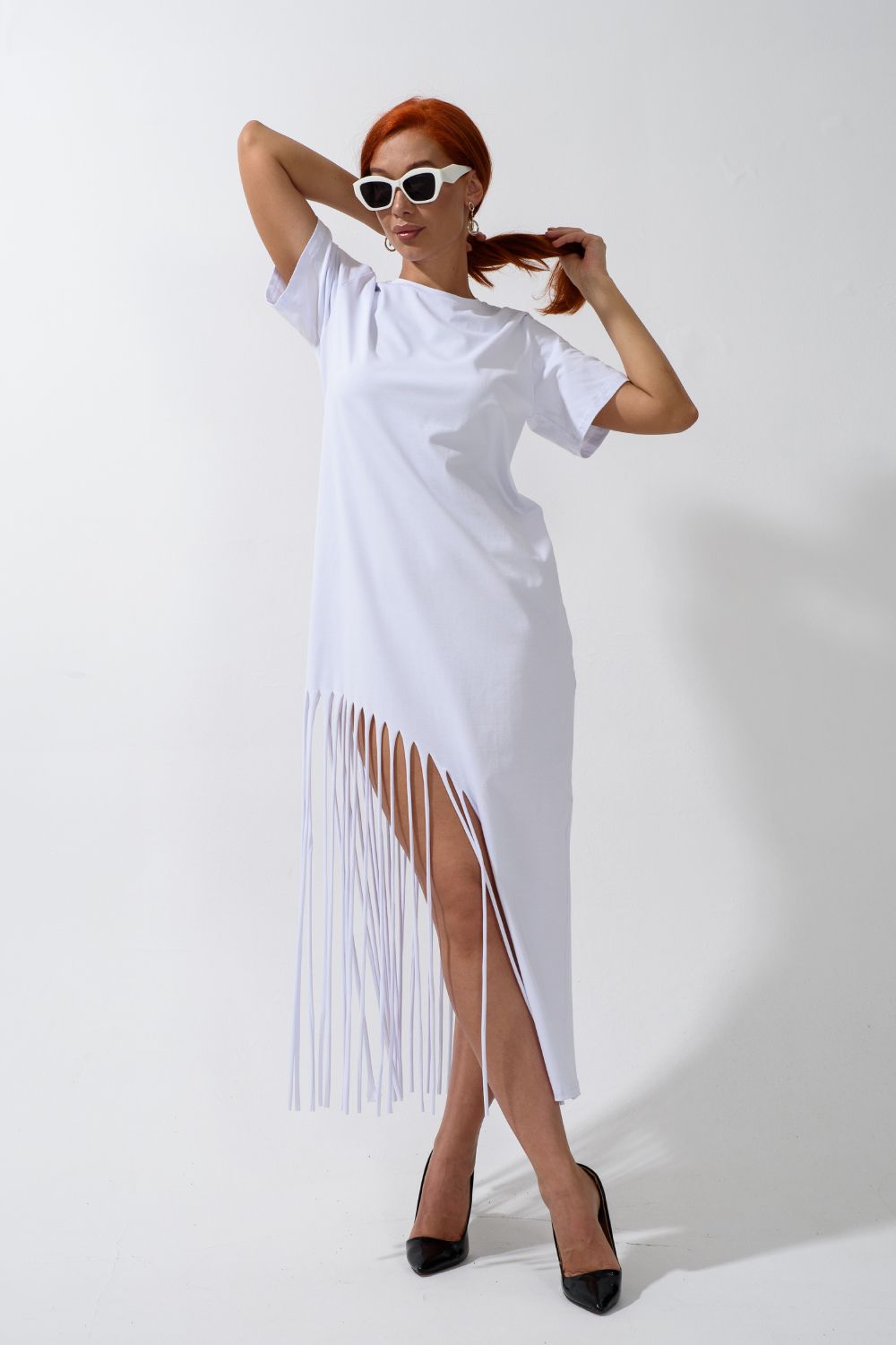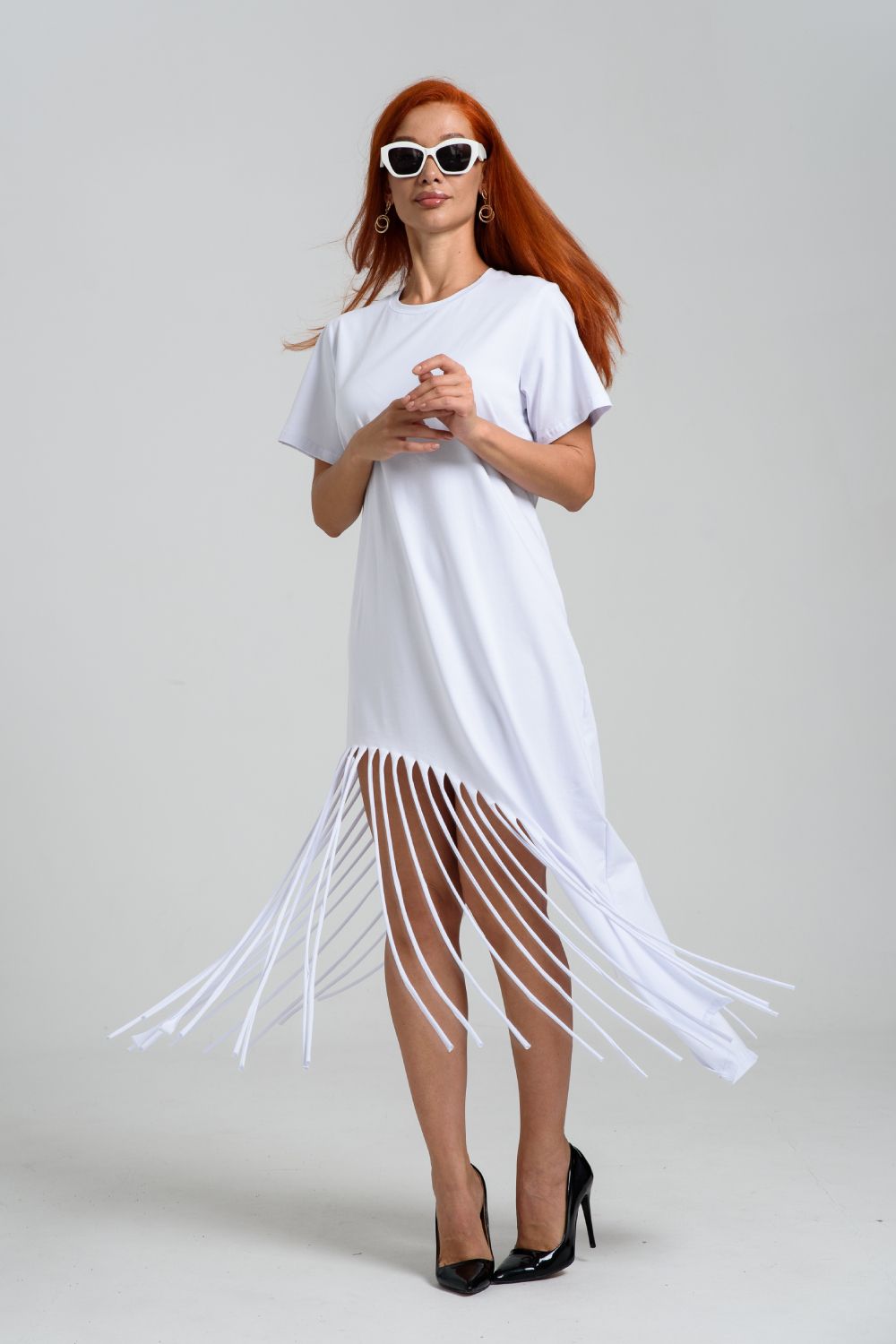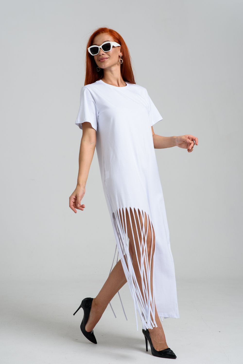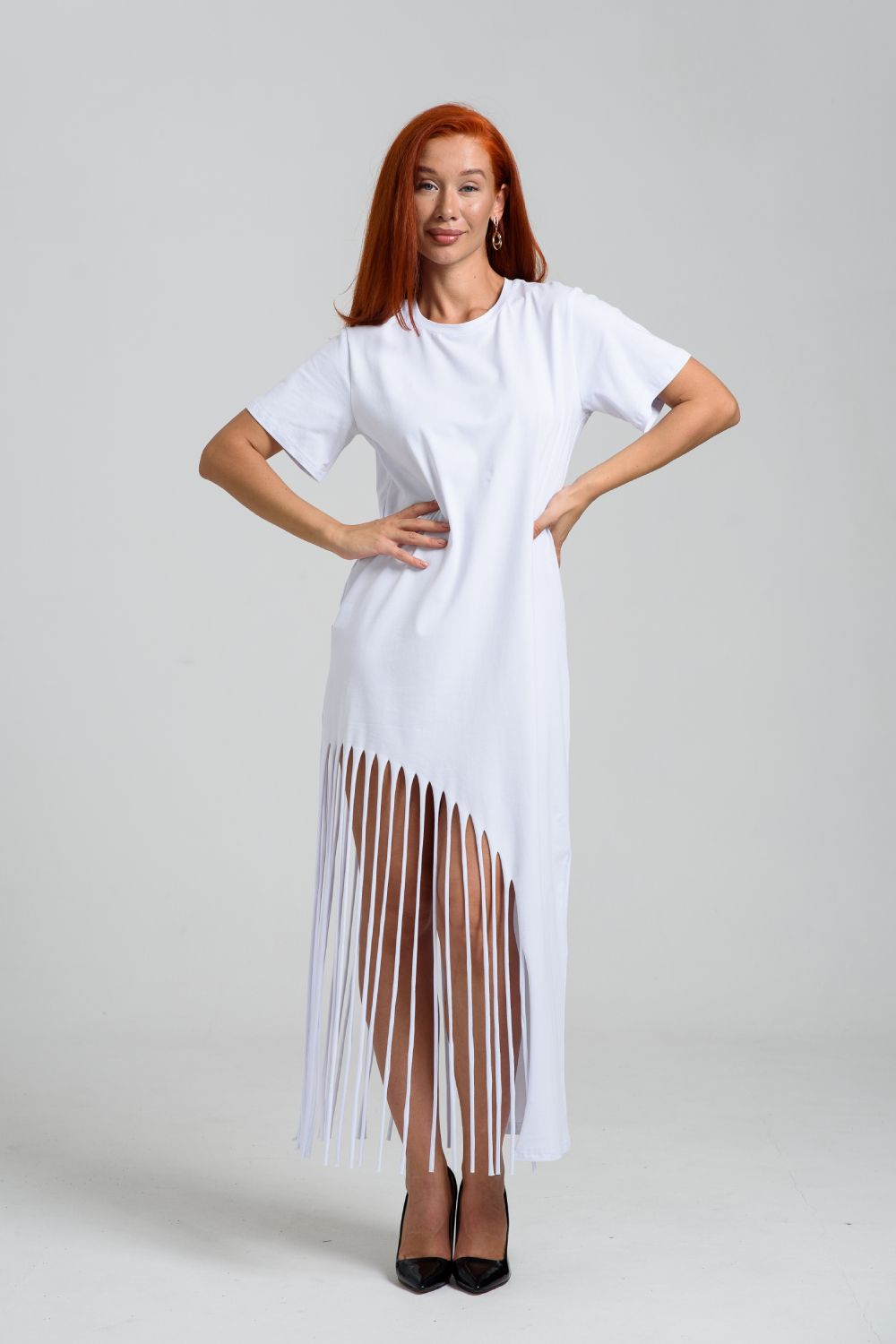 Женское платье ассиметричного кроя с бахромой по низу. Одним из самых популярных элементов летнего гардероба является летнее трикотажное платье. Благодаря легкой ткани и свободному крою обеспечивает комфорт и свободу движений. Плате с бахромой - прекрасный вариант для пляжного отдыха.