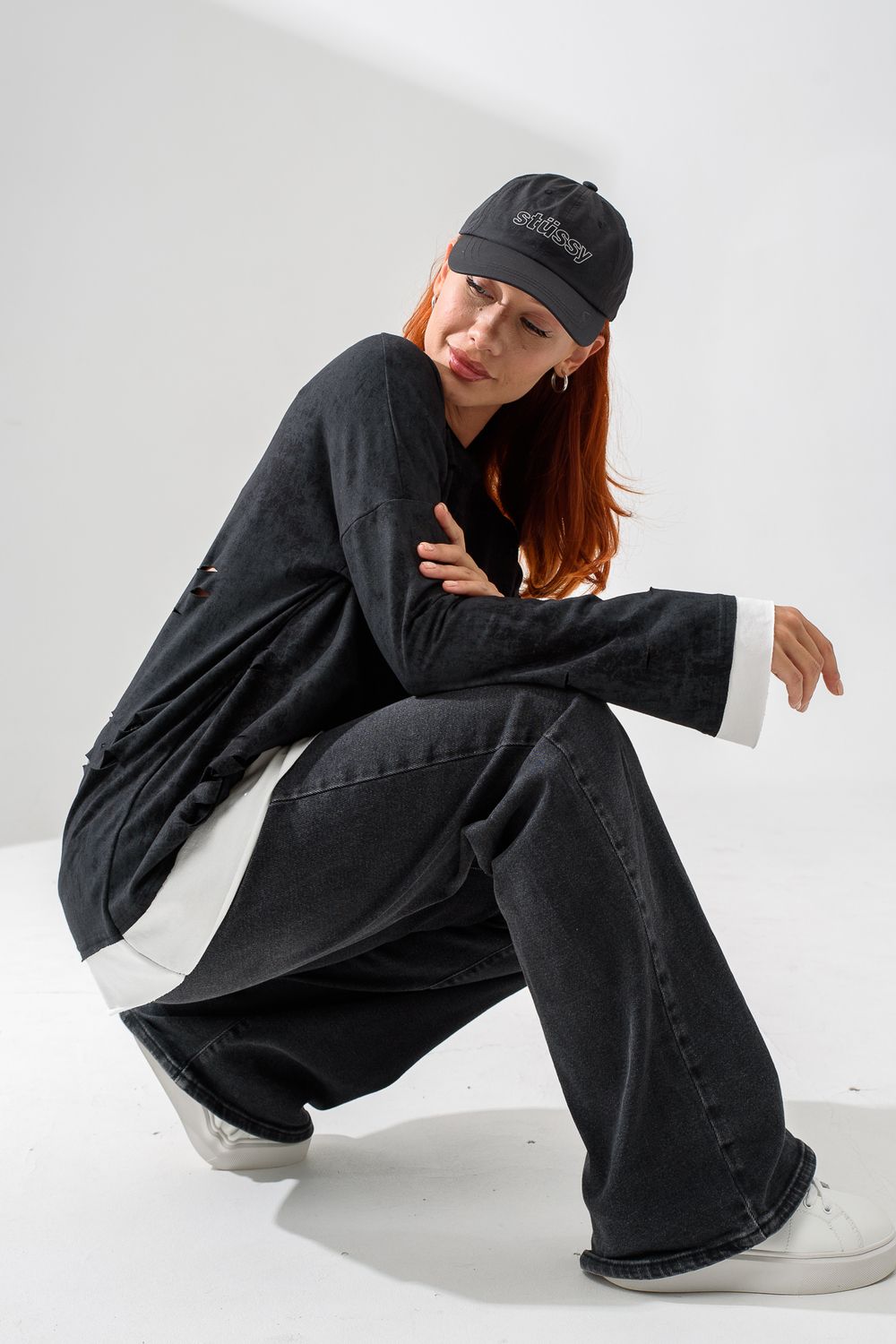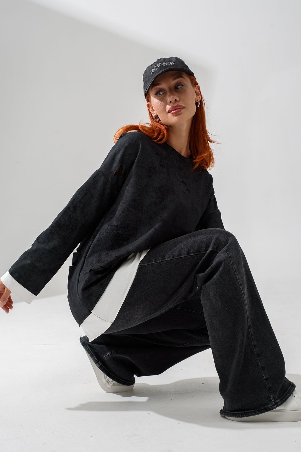 Женский лонгслив свободного кроя - эксклюзивная разработка с эффектом второго слоя. Очень современный дизайн! Особое внимание уделено деталям: необработанная горловина, края рукавов и низа, эффект многослойности придает изделию современный минимализм.