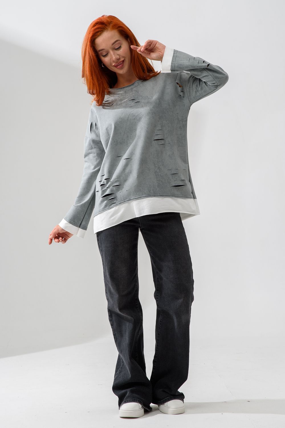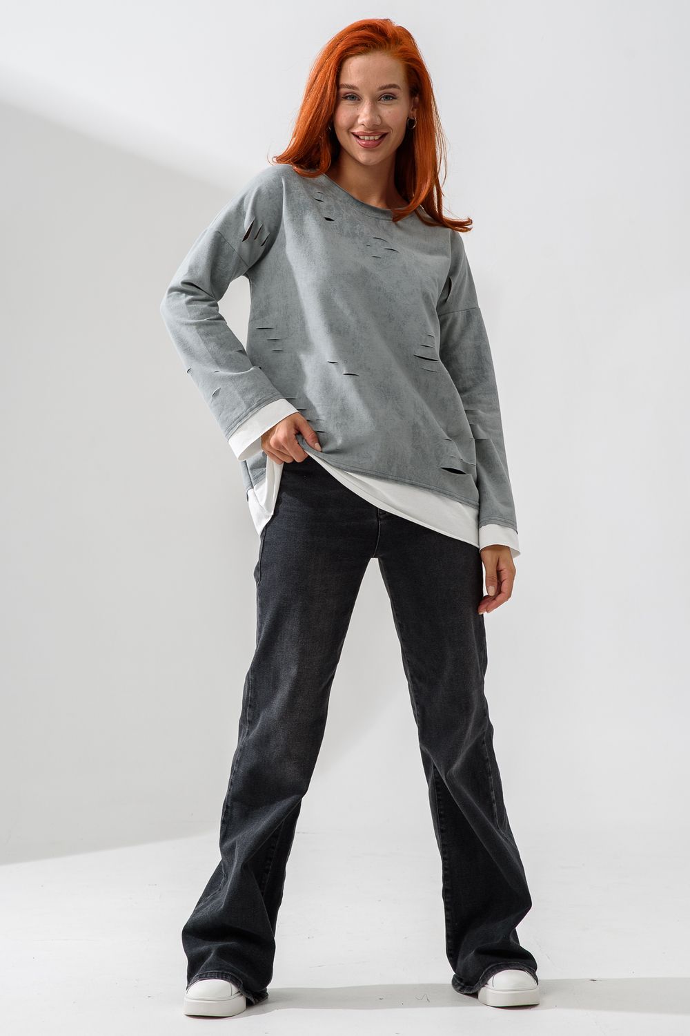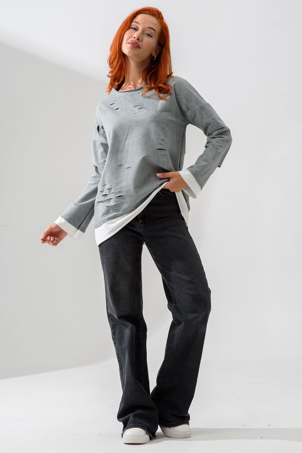 Женский лонгслив свободного кроя - эксклюзивная разработка с эффектом второго слоя. Очень современный дизайн! Особое внимание уделено деталям: необработанная горловина, края рукавов и низа, эффект многослойности придает изделию современный минимализм.
