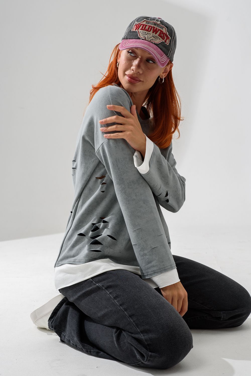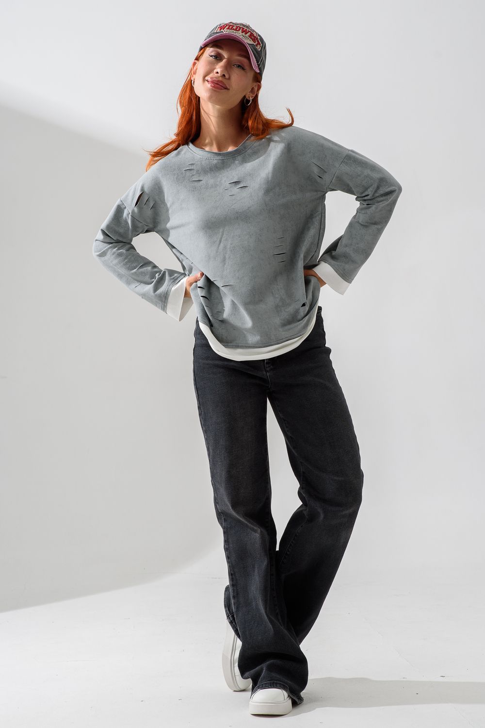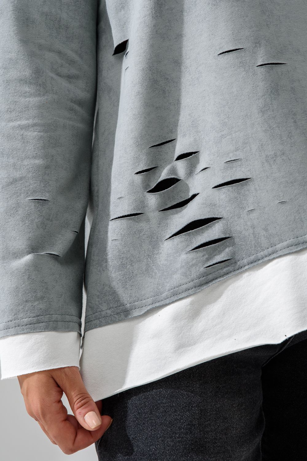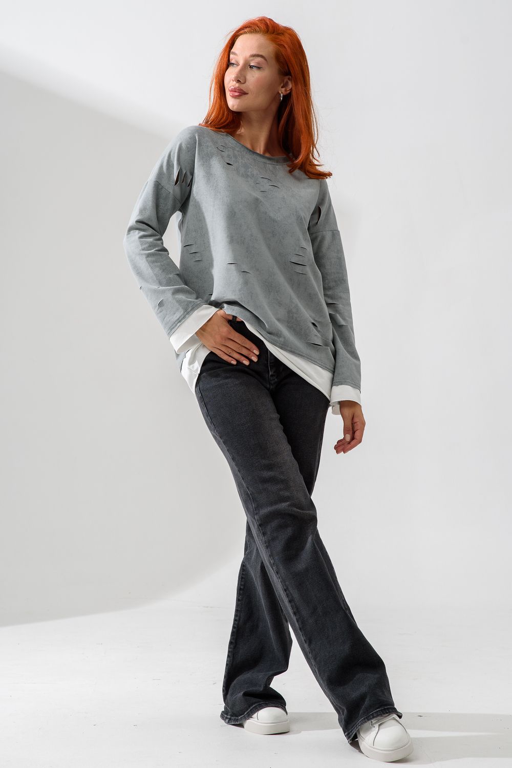 Женский лонгслив свободного кроя - эксклюзивная разработка с эффектом второго слоя. Очень современный дизайн! Особое внимание уделено деталям: необработанная горловина, края рукавов и низа, эффект многослойности придает изделию современный минимализм.