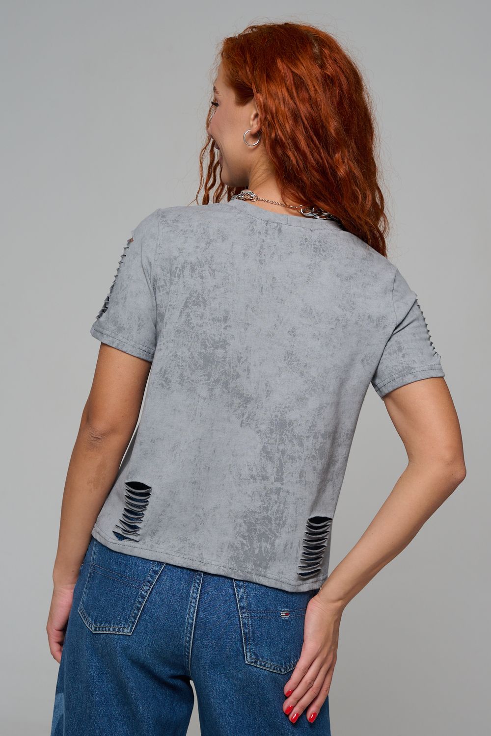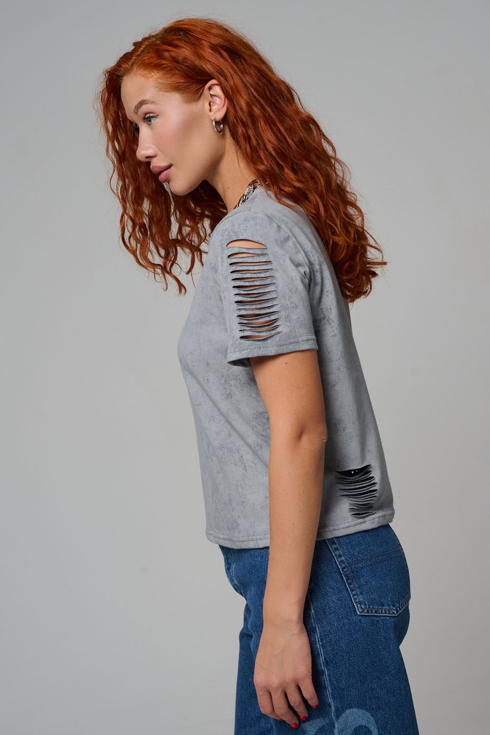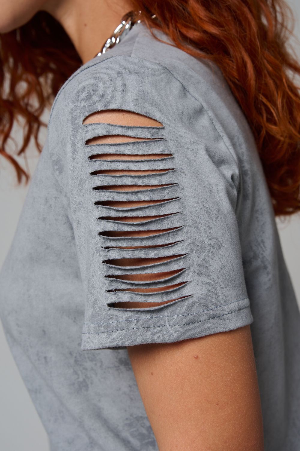 Трендовая футболка-оверсайз из качественного материала. Необычный оттенок и эффектная рваная обработка создают уникальный стиль.