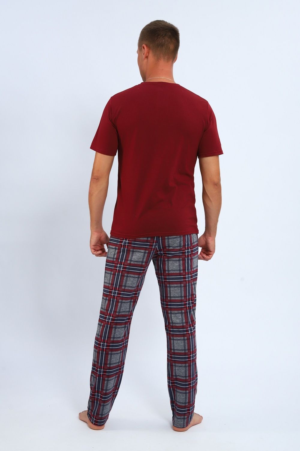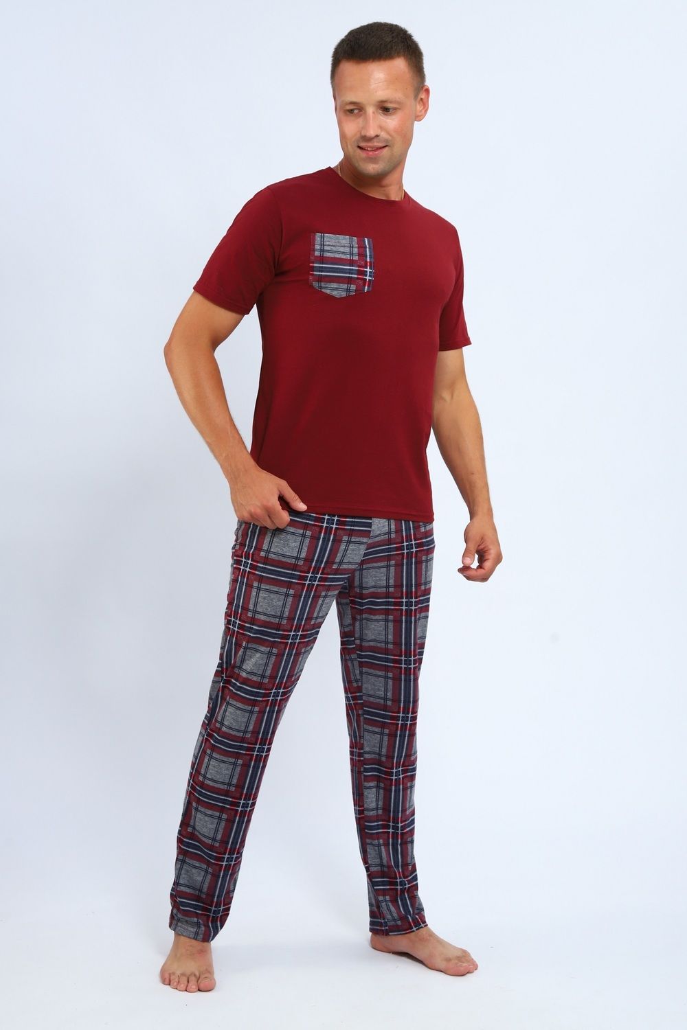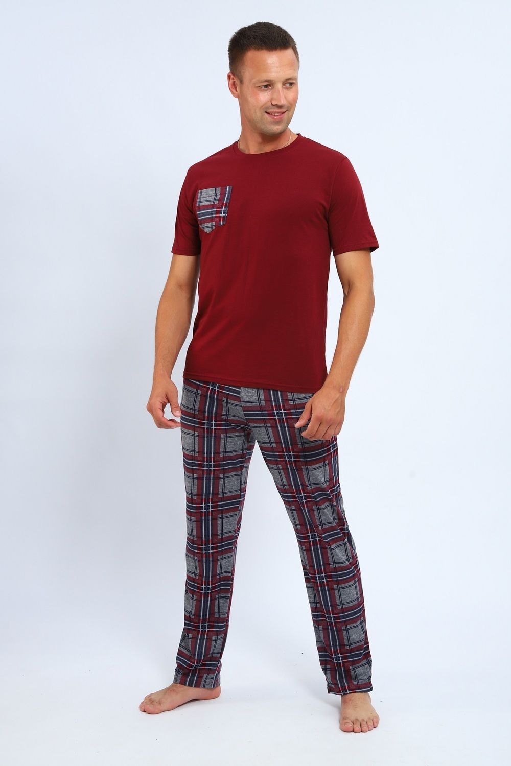 Комплект домашней одежды для мужчины от Руся трикотаж, состоящий из футболки и свободных брюк в клетку.
