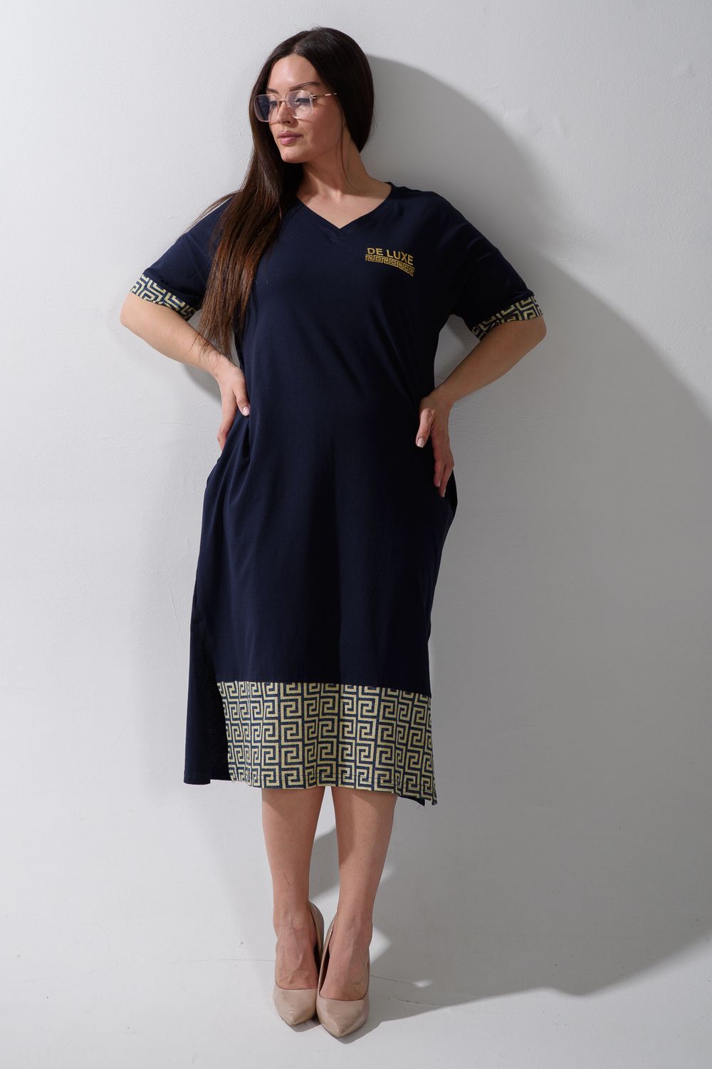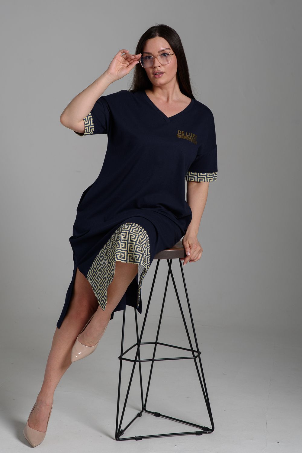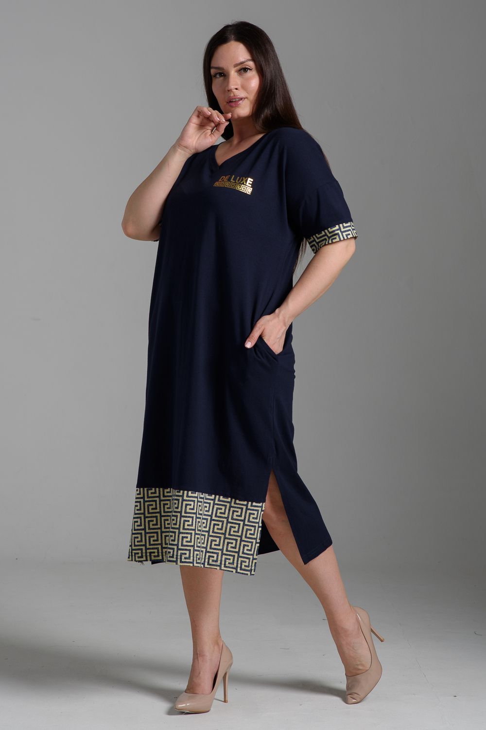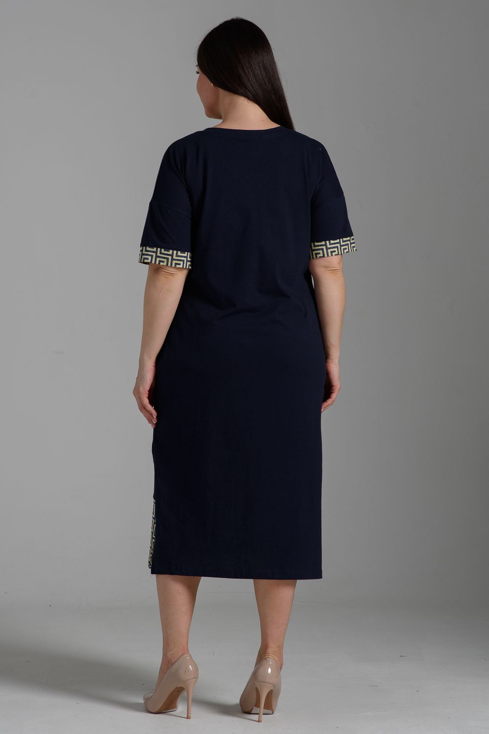 Платье прямого силуэта, с V-образной горловиной, с карманами в боковых швах. Рукав короткий, с манжетом из отделочной ткани. Низ полочки завершен деталью из отделочного полотна. В нижней части боковых швов обработаны разрезы. Горловина обработана обтачкой из основного полотна.