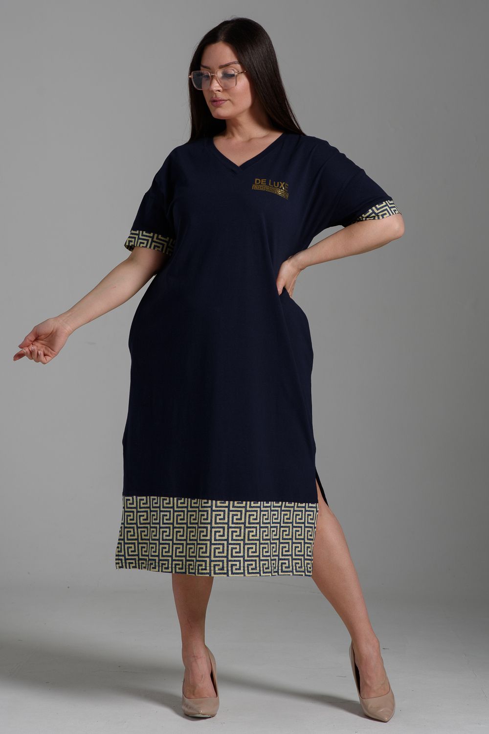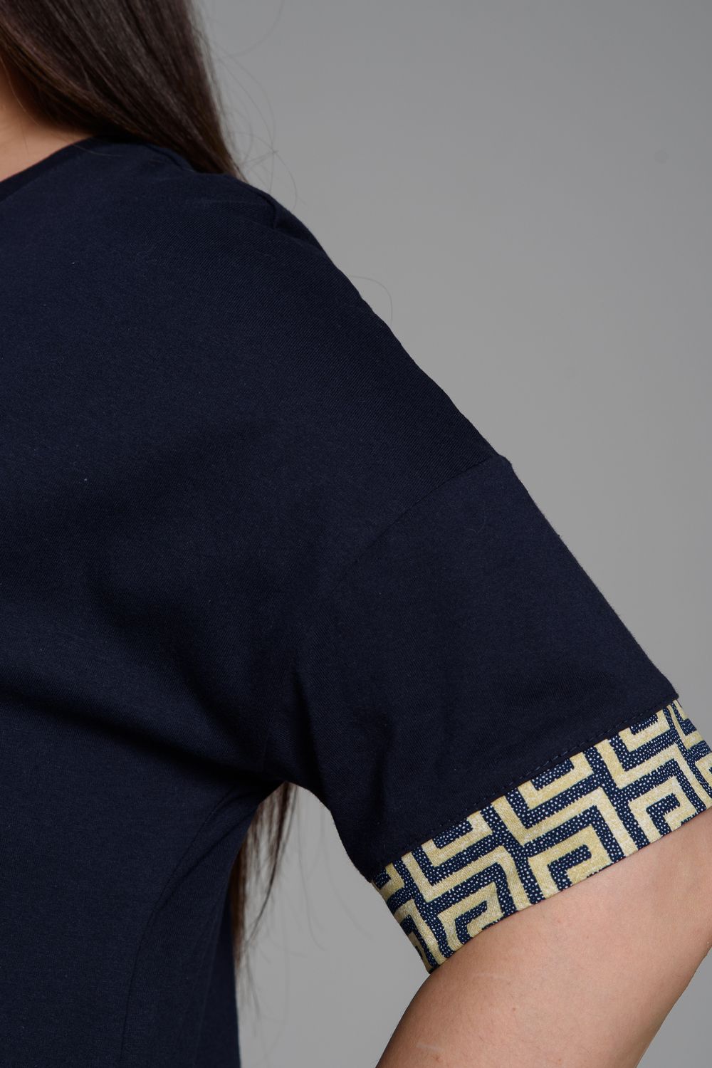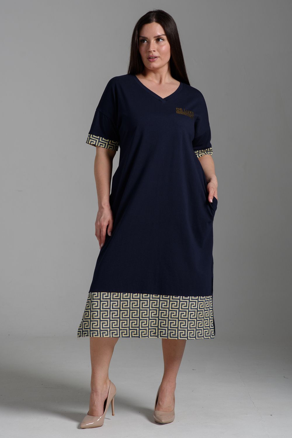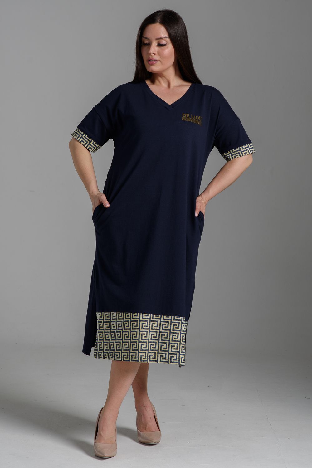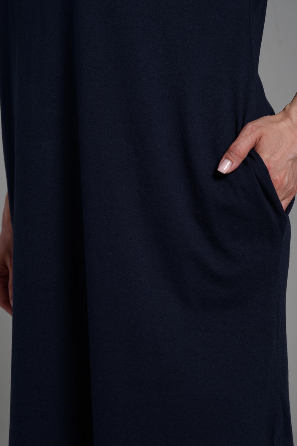 Платье прямого силуэта, с V-образной горловиной, с карманами в боковых швах. Рукав короткий, с манжетом из отделочной ткани. Низ полочки завершен деталью из отделочного полотна. В нижней части боковых швов обработаны разрезы. Горловина обработана обтачкой из основного полотна.