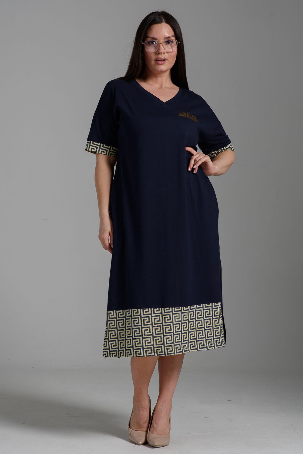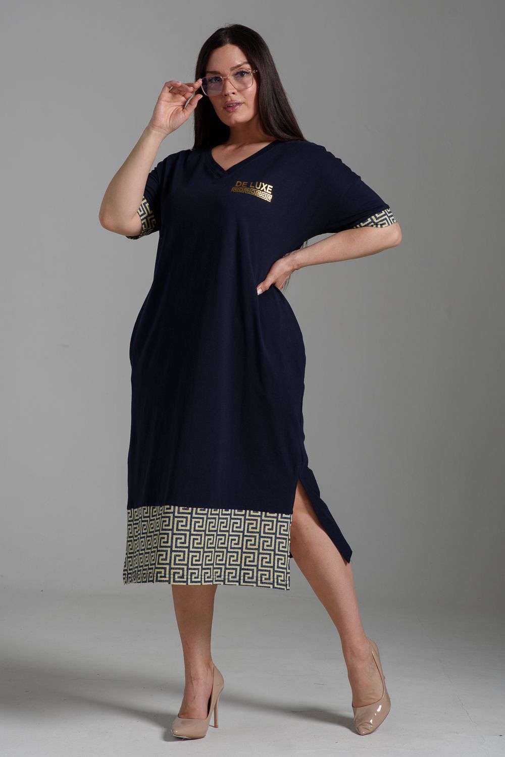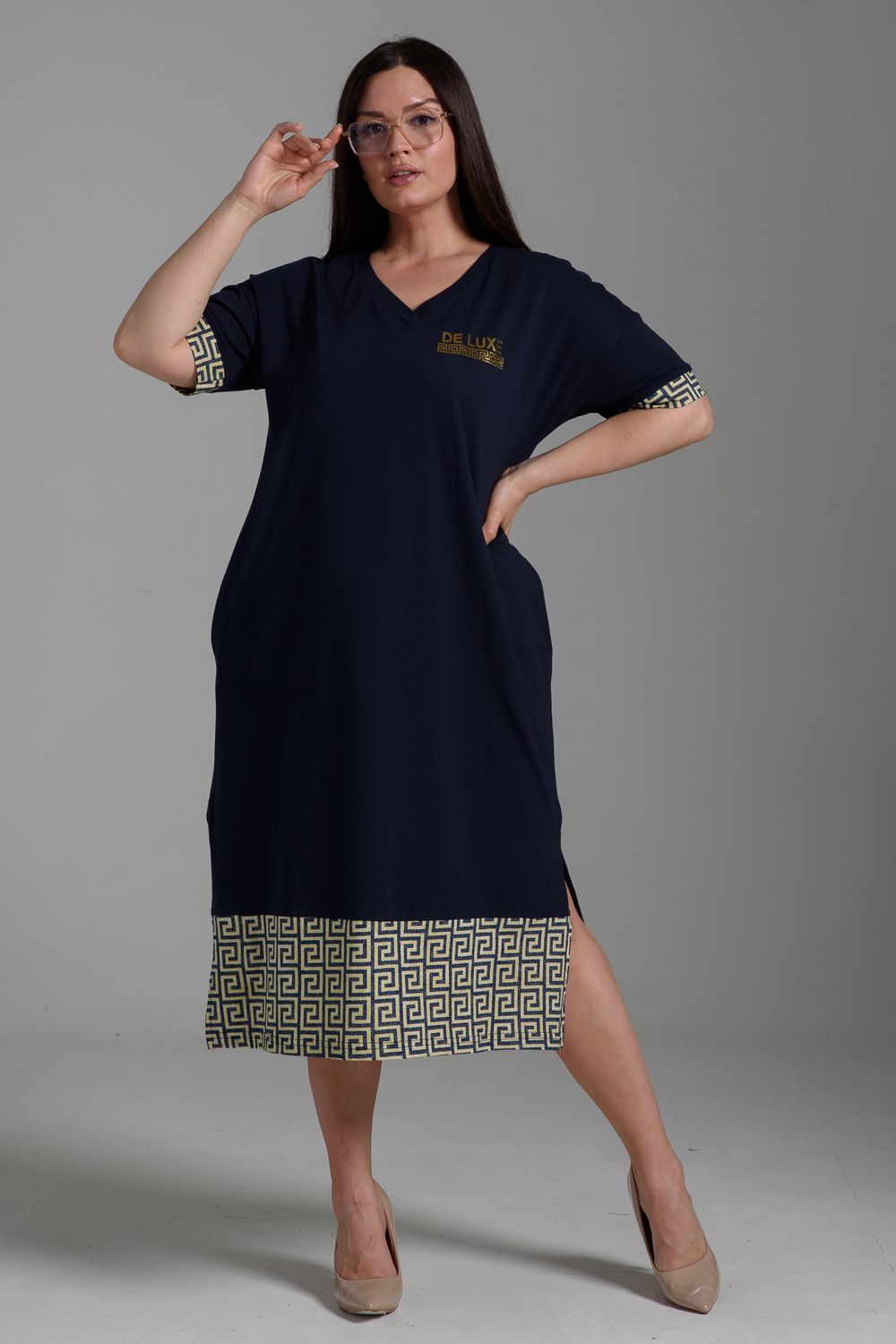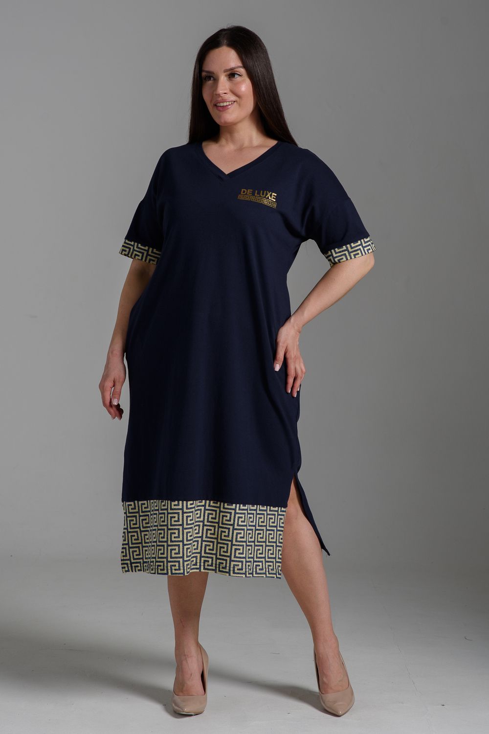 Платье прямого силуэта, с V-образной горловиной, с карманами в боковых швах. Рукав короткий, с манжетом из отделочной ткани. Низ полочки завершен деталью из отделочного полотна. В нижней части боковых швов обработаны разрезы. Горловина обработана обтачкой из основного полотна.
