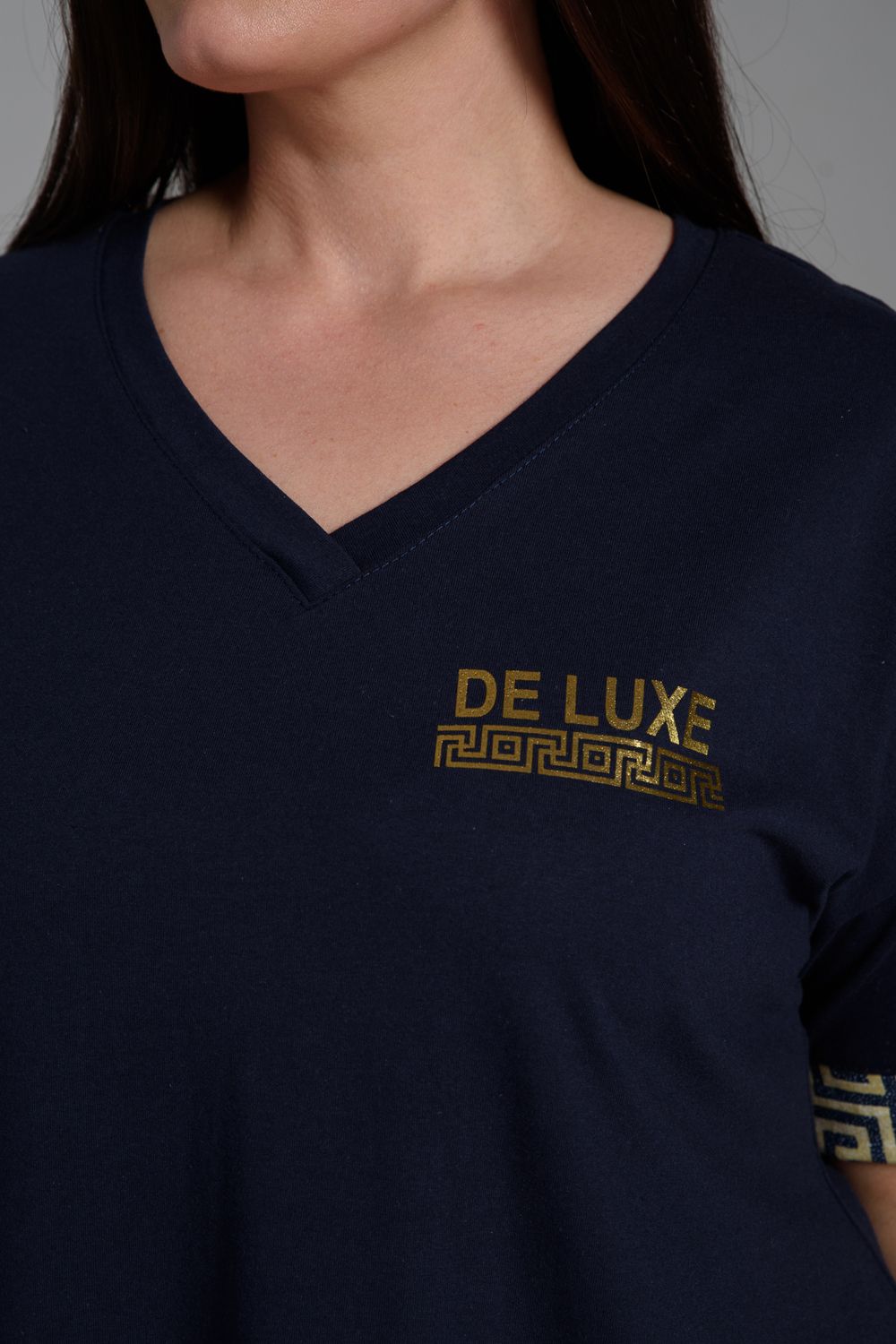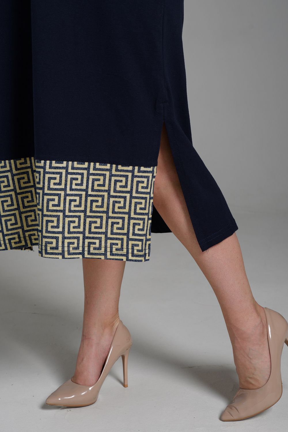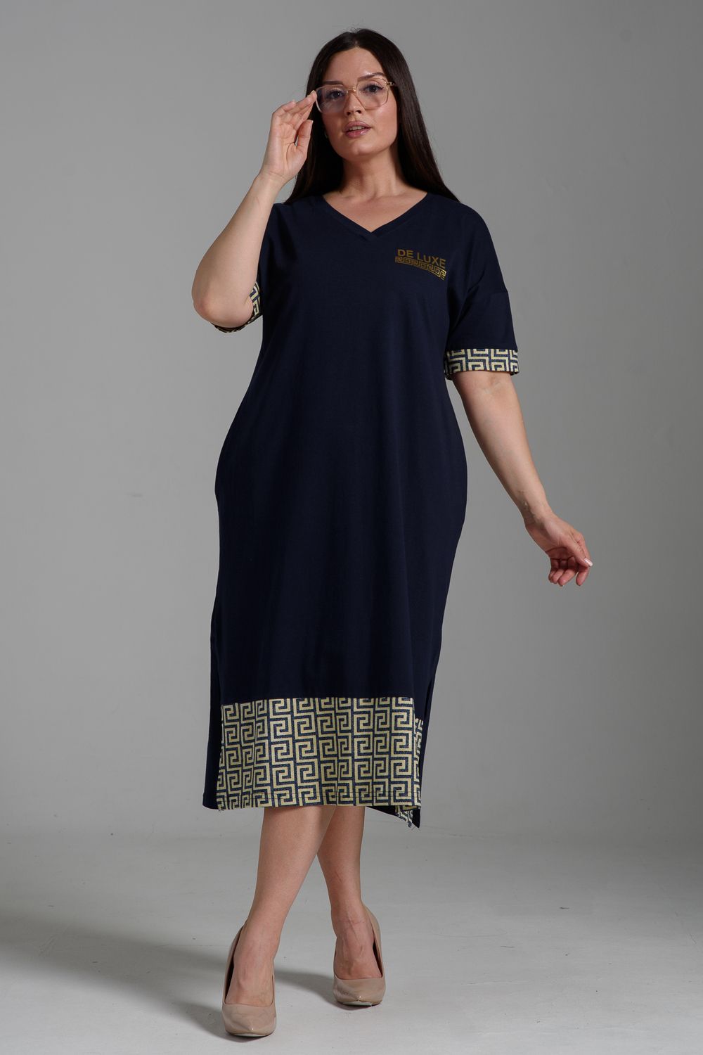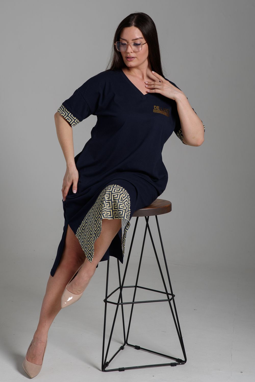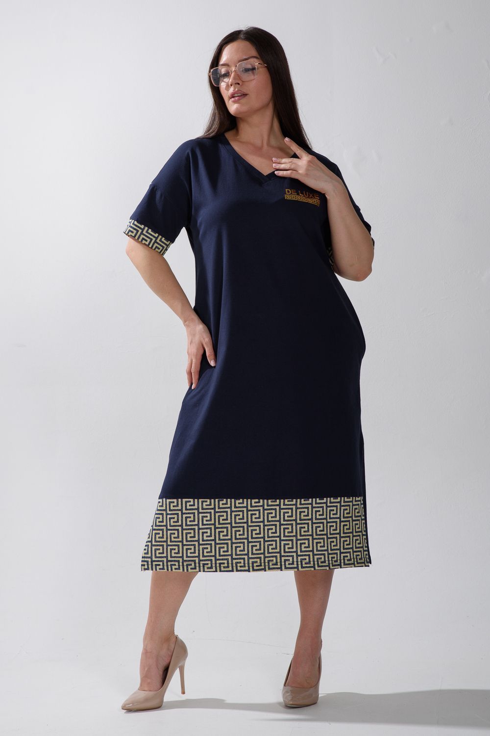 Платье прямого силуэта, с V-образной горловиной, с карманами в боковых швах. Рукав короткий, с манжетом из отделочной ткани. Низ полочки завершен деталью из отделочного полотна. В нижней части боковых швов обработаны разрезы. Горловина обработана обтачкой из основного полотна.