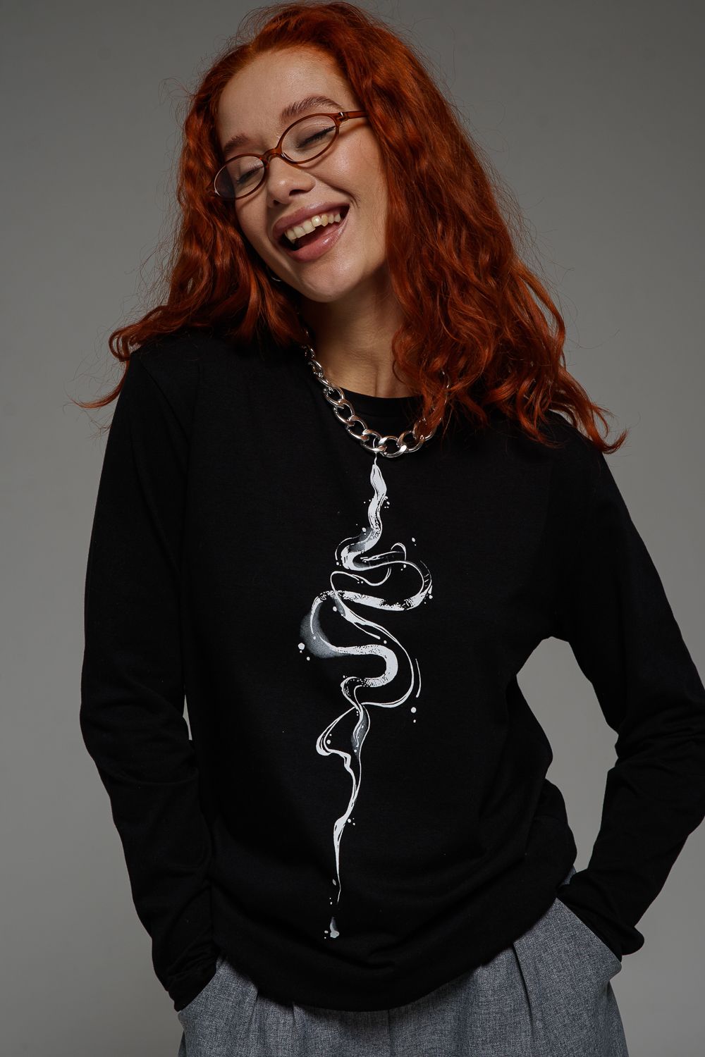 Лонгслив снова в моде и прочно обосновался в базовом гардеробе современного человека. Удобная трикотажная кофта представляет собой футболку с длинным рукавом, которую можно использовать как самостоятельный элемент, так и носить под пиджак, толстовку или рубашку. Лонгслив выполнен из высокоплотного хлопкового трикотажа и является невероятно комфортным и удобным. Футболка с длинными рукавами имеет прямой базовый крой и классическую линию плеча. Лонгслив - это неформальный стиль, когда на футболку можно надеть клетчатую рубашку и сочетать с кедами и джинсами. За счет натуральной ткани лонгслив можно носить в качестве домашней одежды или нательного белья, одежды для сна, тренировочной спортивной одежды и военной экипировки. Если вы хотите силуэт "оверсайз" нужно взять на размер или два больше, ориентируйтесь по таблице замеров. На принте "черный+Змея стразы" страз нет. Выполнен слой глиттером - мелкими, рассыпчатыми и переливающимися блестками, очень яркие и блестящие.